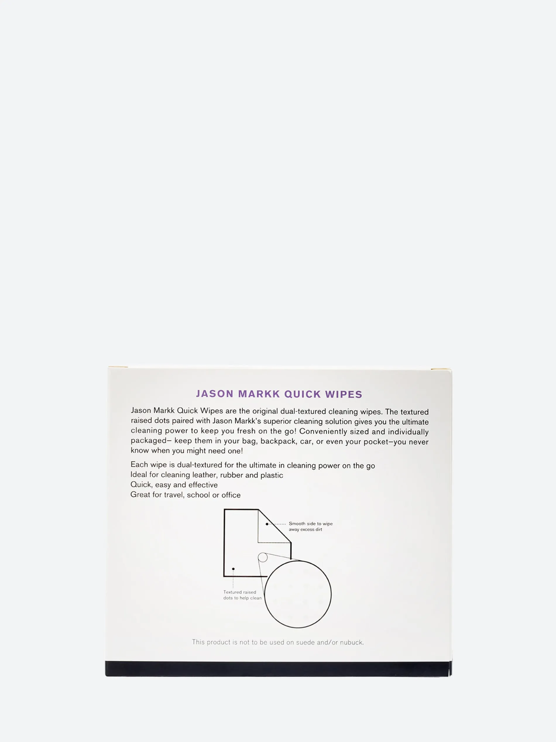 Jason Markk Quick Wipes with a month’s worth of convenient on-the-go cleans! Optimized formula and function to deliver an even more superior clean on the go. 30% larger in size with a 50% height increase of raised dot texture.