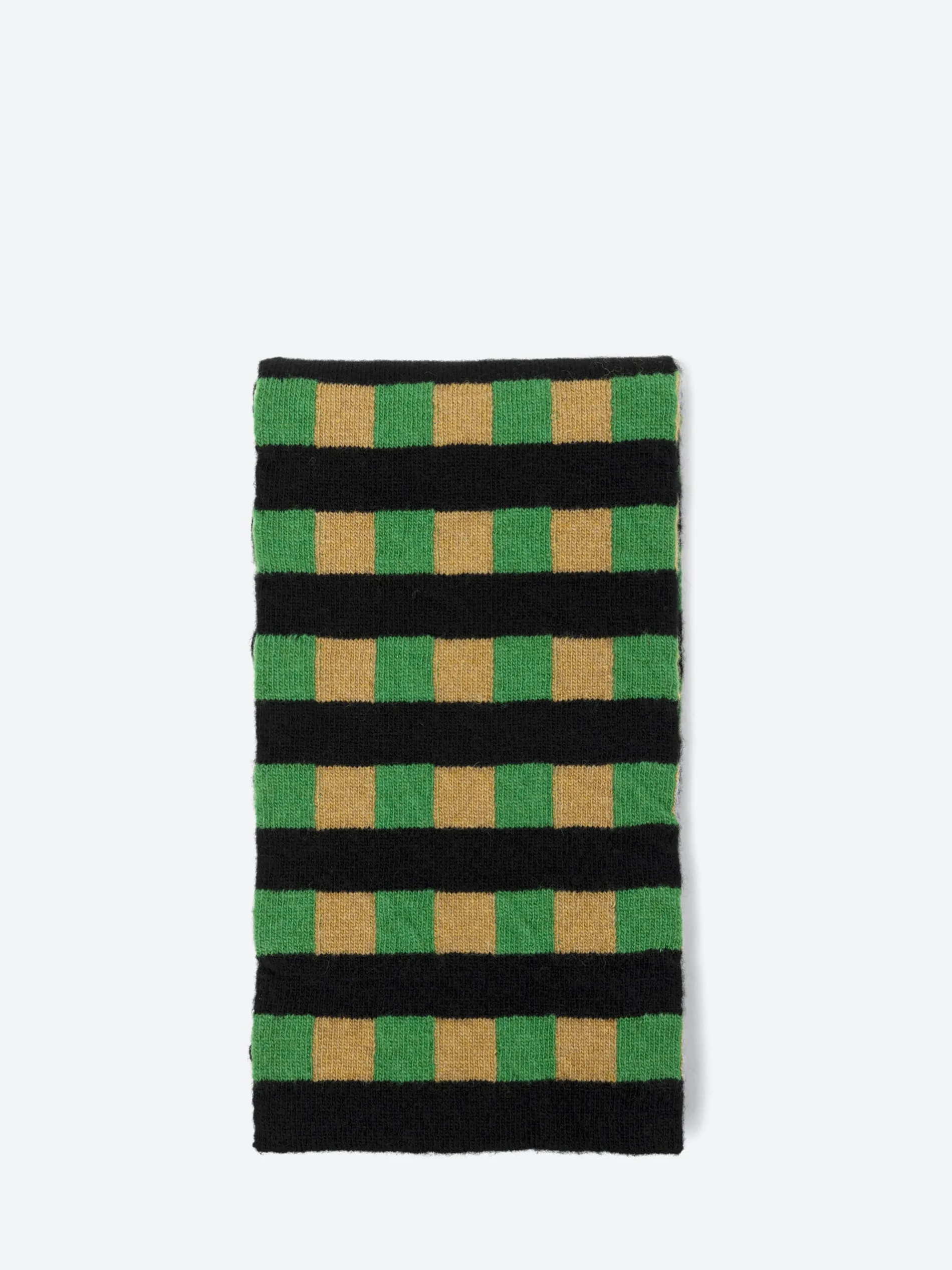 A small, all-season scarf with a bright graphic pattern, fine-knit in a plain stitch. Wear tucked into a jacket, shirt, or coat for a pop of colour.