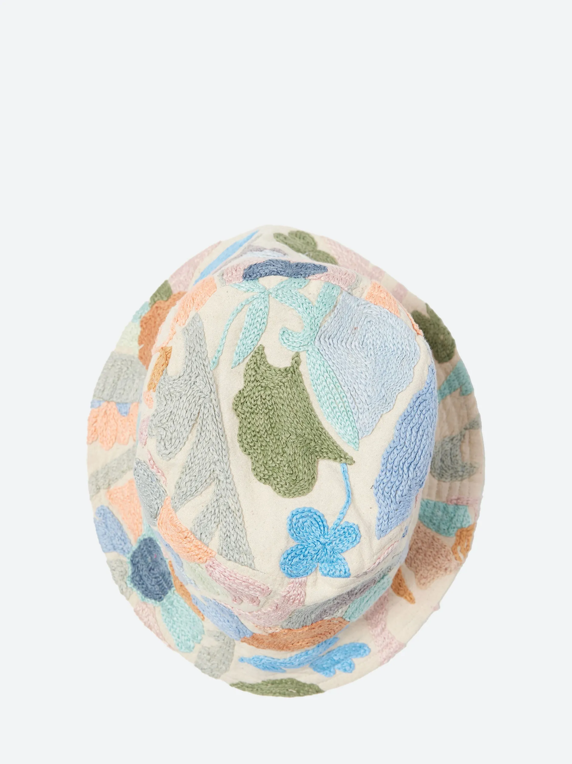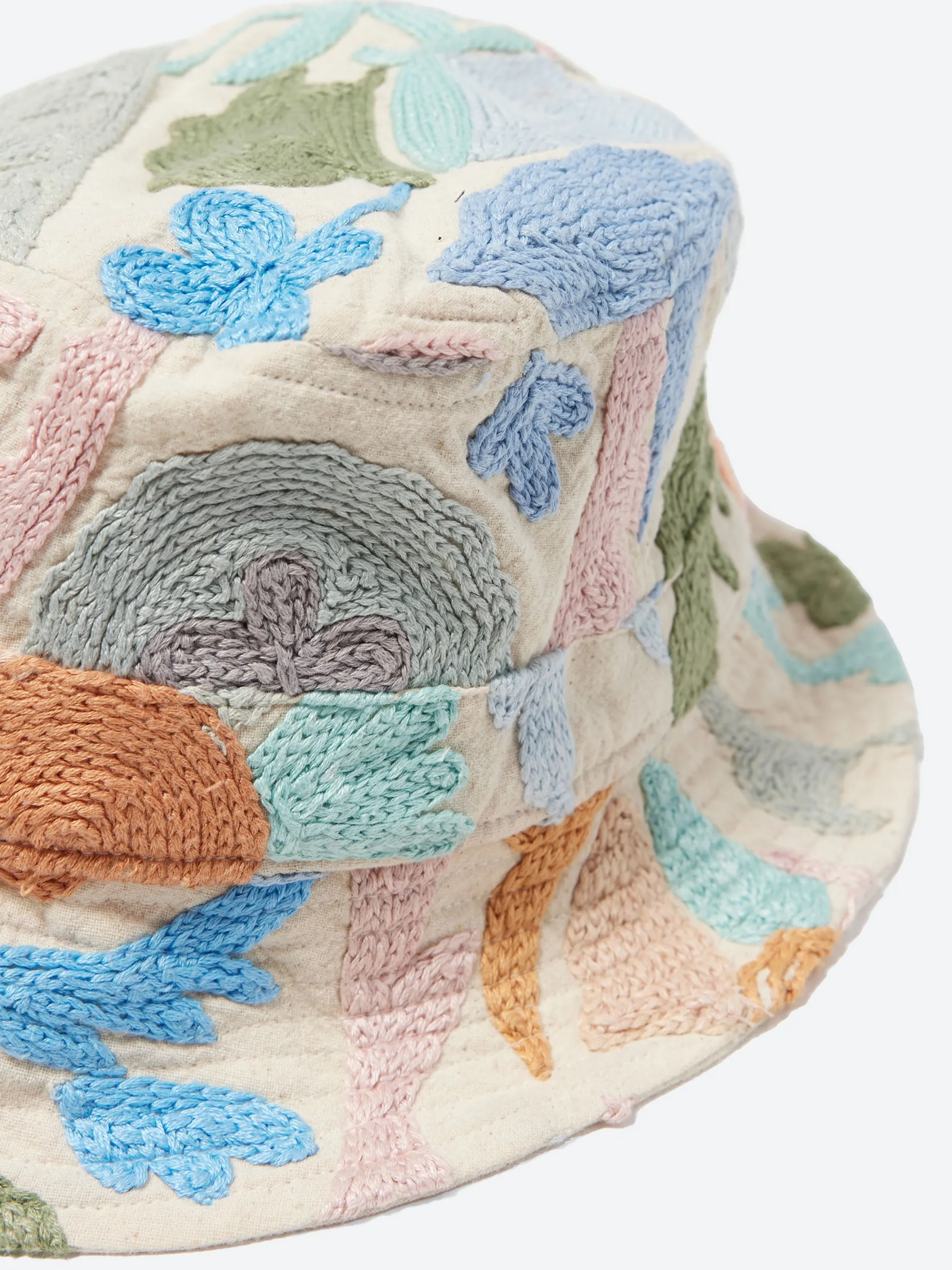 Kardo reversible Suzani Bucket Hat, a type of embroidered and decorative tribal textile originating from Central Asia. This intricate embroidery is crafted using chain, satin, and buttonhole stitches with silk or cotton threads on a cotton fabric base.