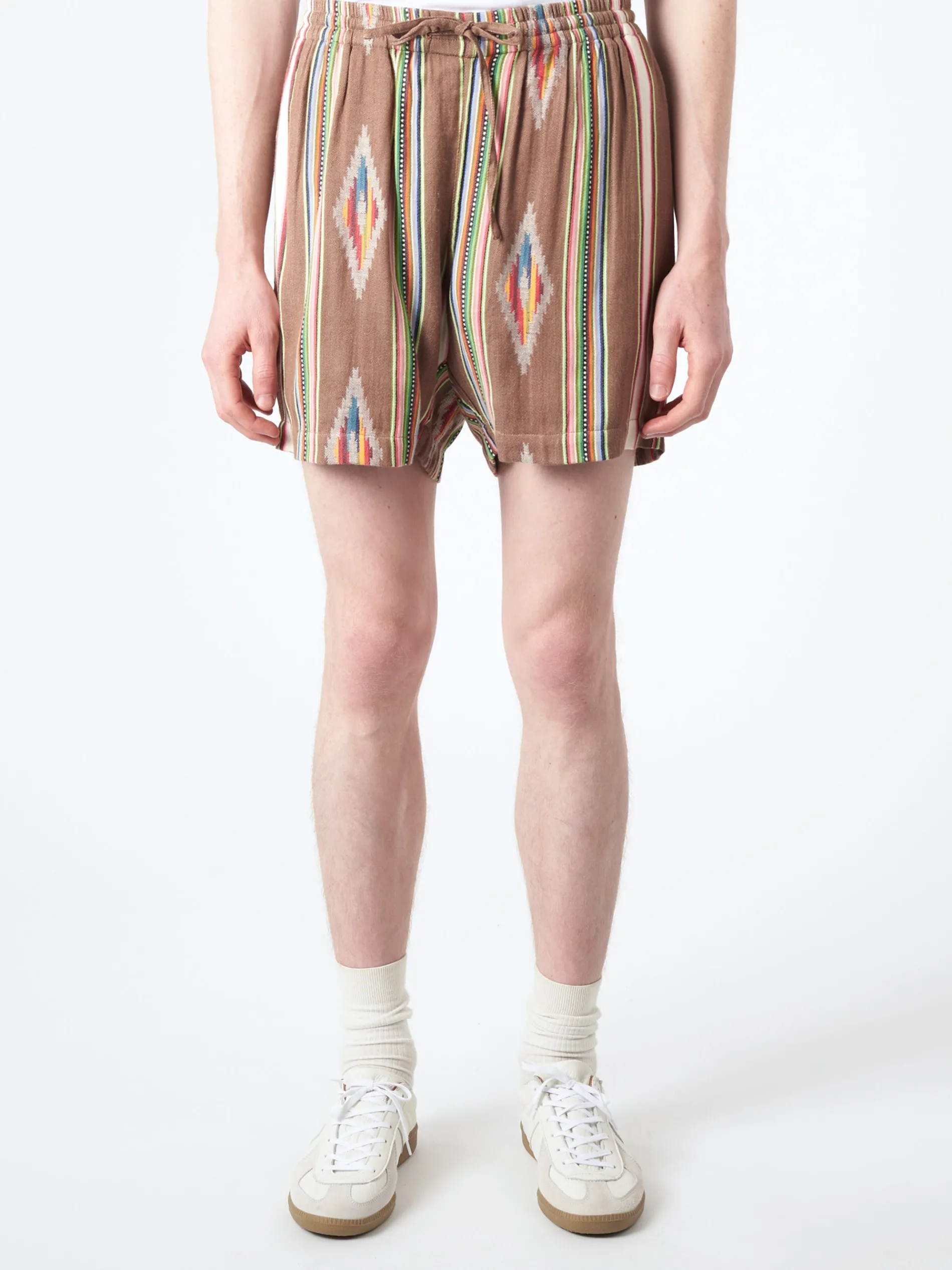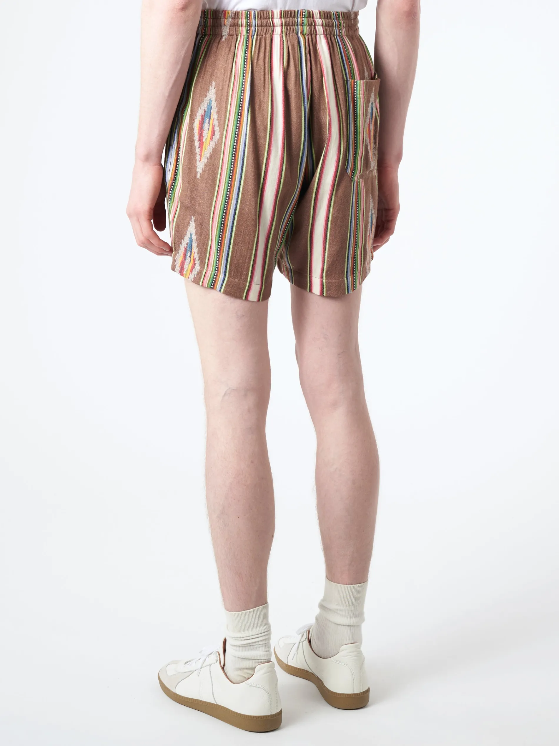 Elastic waist pull-on short shorts. Jacquard weaving involves adding extra yarn in the warp or weft to add extra surface in the fabric to create patterns in the weave that have raised texture. Made by one tailor from beginning to end.