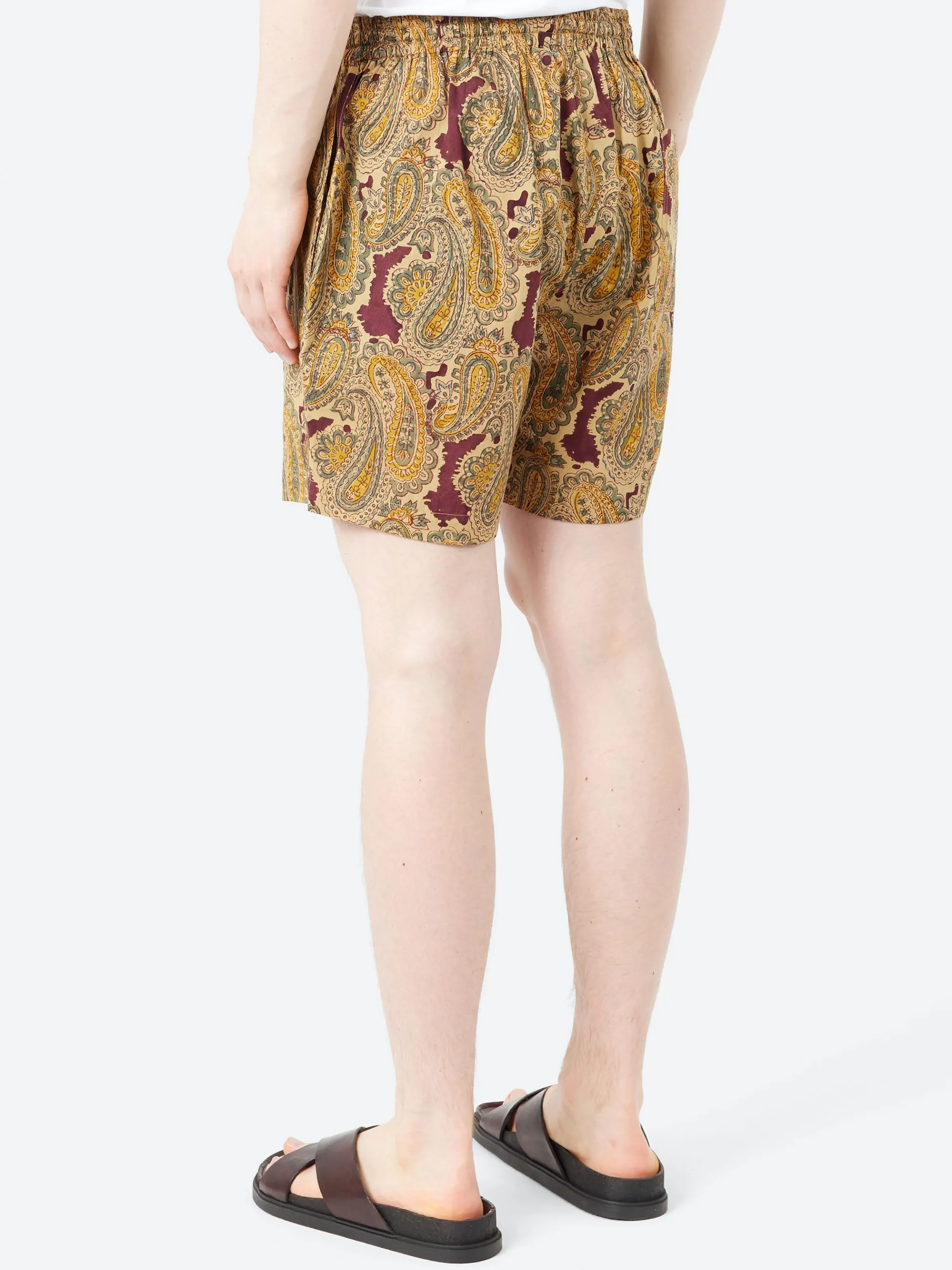 These Kardo elastic waist pull-on short shorts are made from fabric printed using traditional hand block printing. Each pattern is created by hand-carving wooden blocks, which are then carefully stamped onto the fabric using natural dyes. Often involving multiple layers and blocks, the process requires great skill, time, and precision.