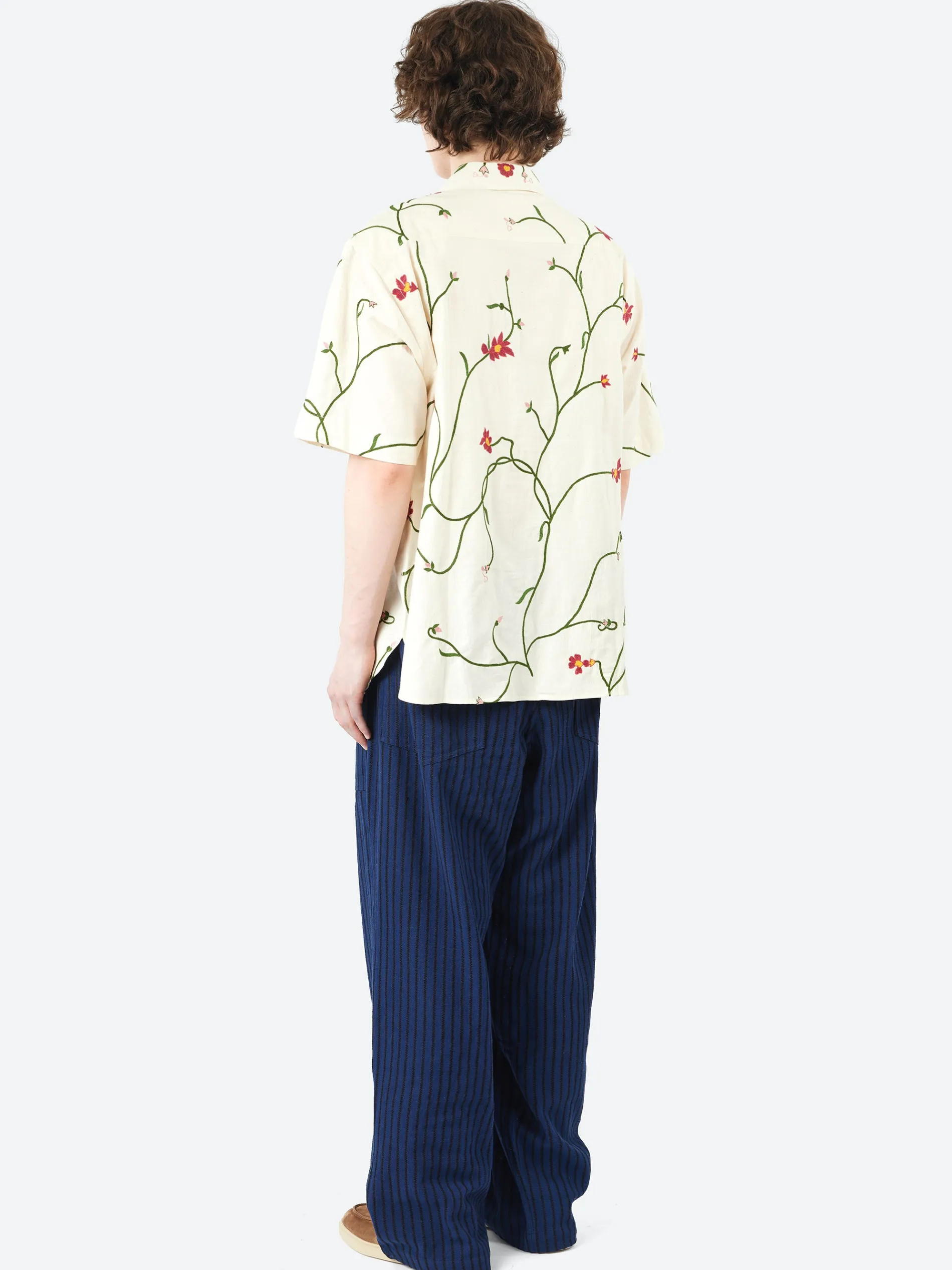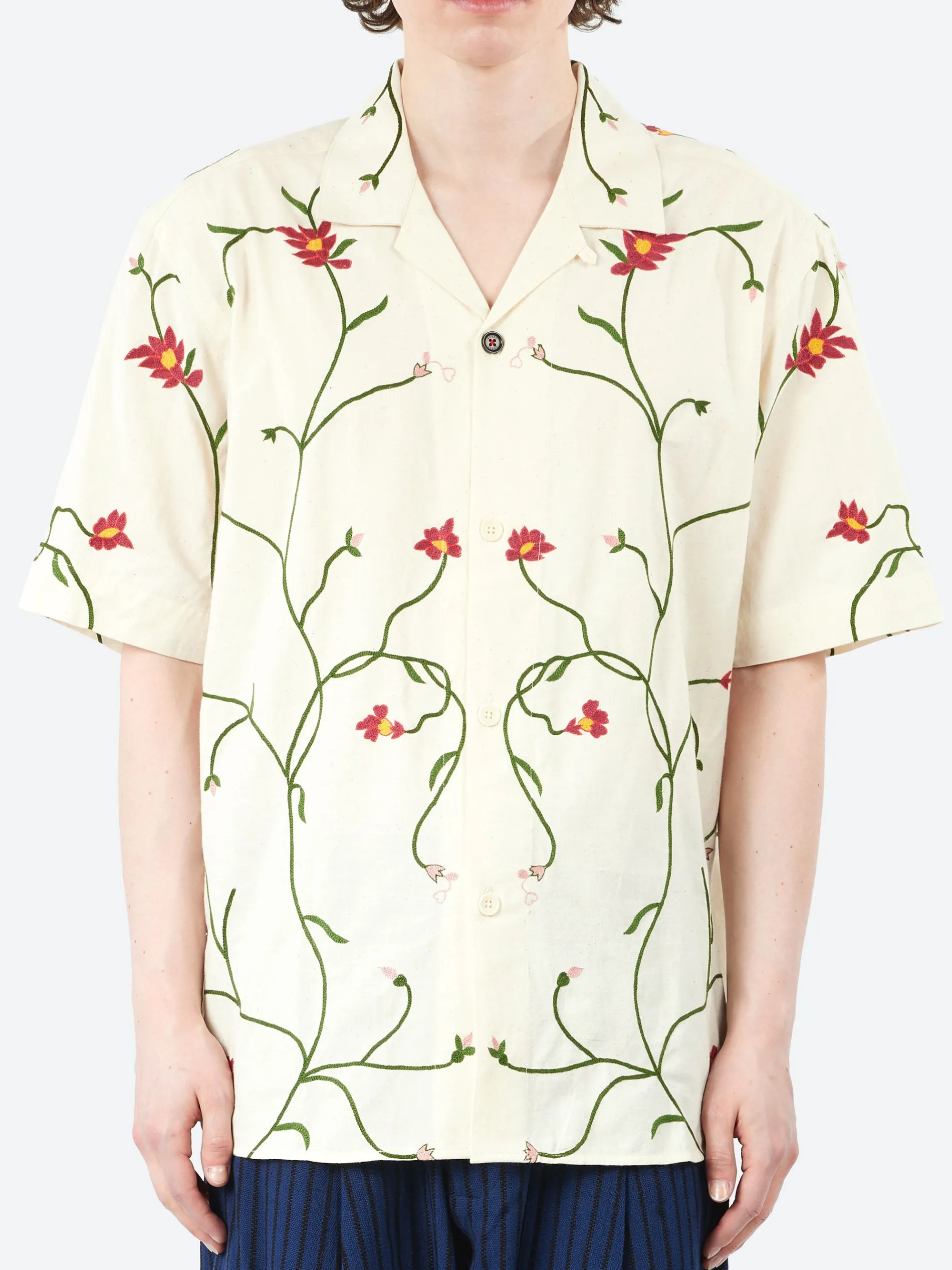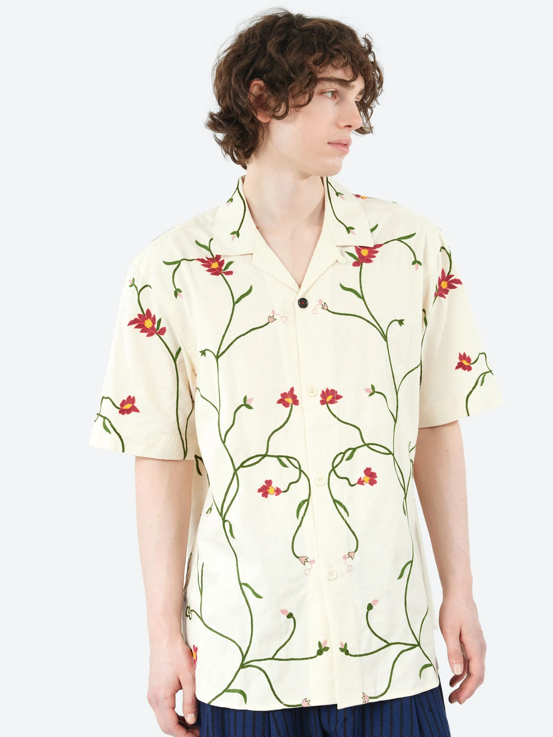 The Kardo Oversized Camp Collar SS Shirt is made from khadi, a handspun and handwoven organic cotton. Each shirt is then individually hand embroidered using a traditional chain stitch technique known as Ari. The embroidery is done panel by panel on a frame before the garment is assembled, showcasing exceptional craftsmanship and attention to detail.