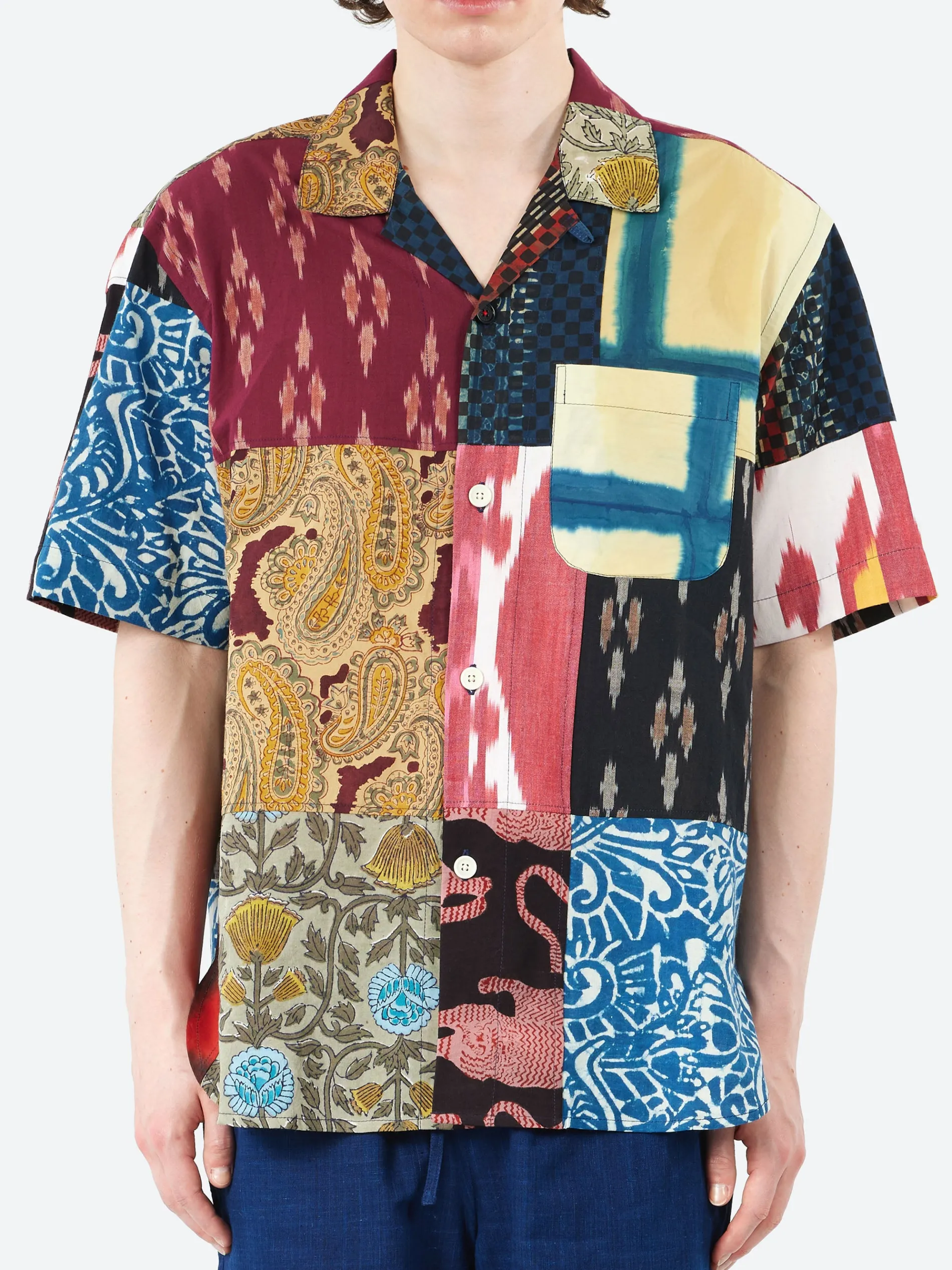 The Kardo Oversized Camp Collar SS Shirt features a patchwork design made from carefully selected fabrics from their SS25 collection. Each piece is thoughtfully assembled to create a unique and visually striking garment that reflects the spirit and variety of the season.