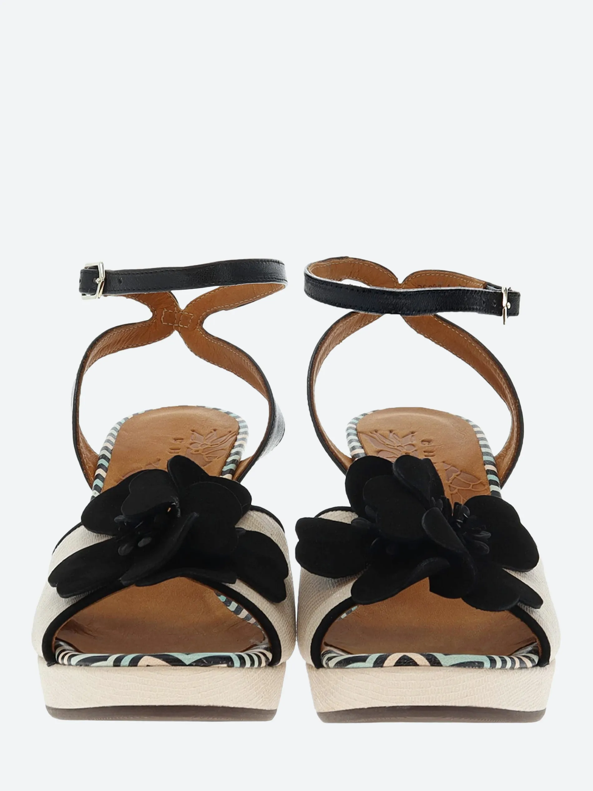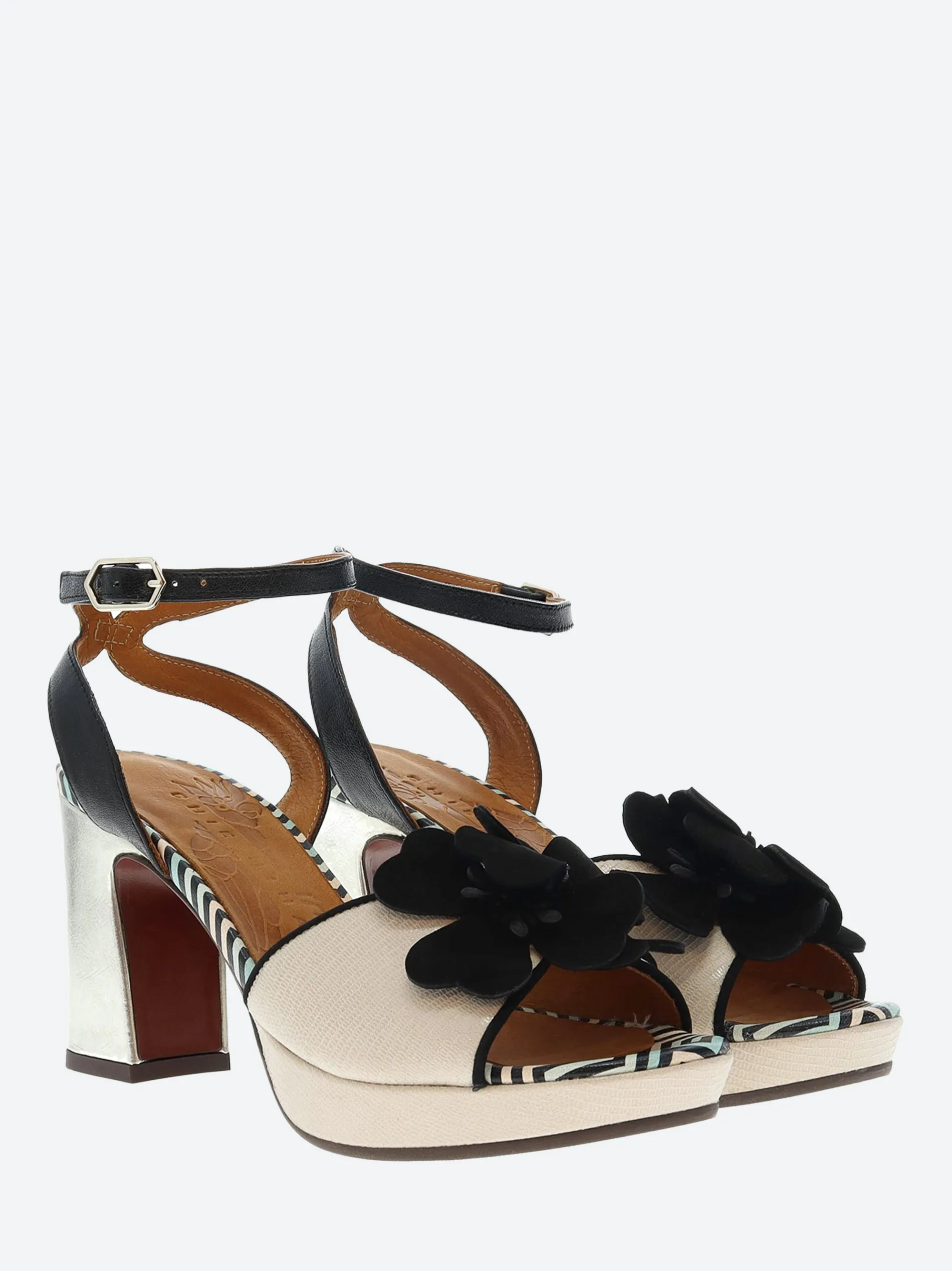 Chie Mihara open toe platform sandal, crafted from soft leather with a cross-ankle buckle closure strap. Complete with a floral applique on the toe piece.