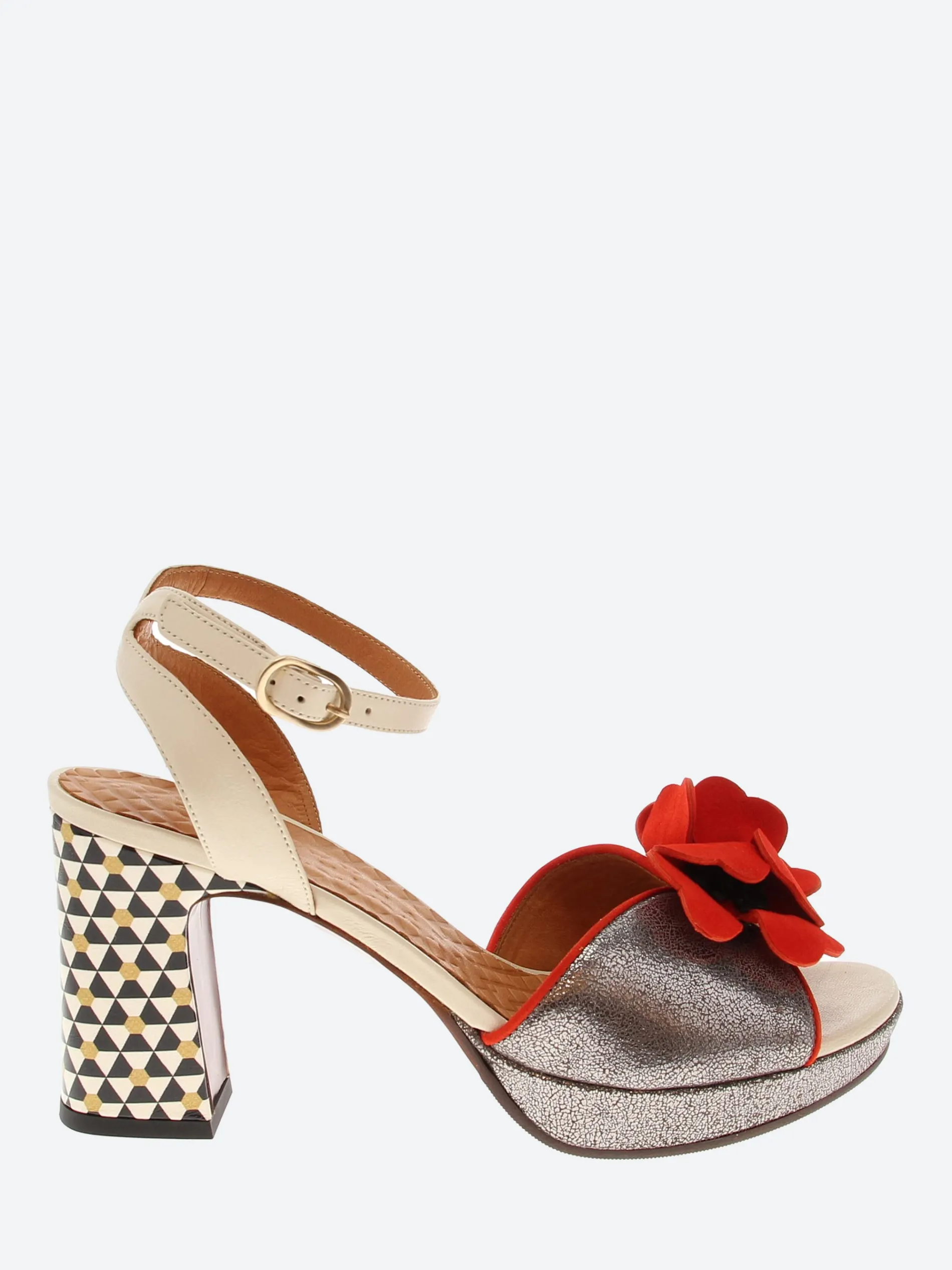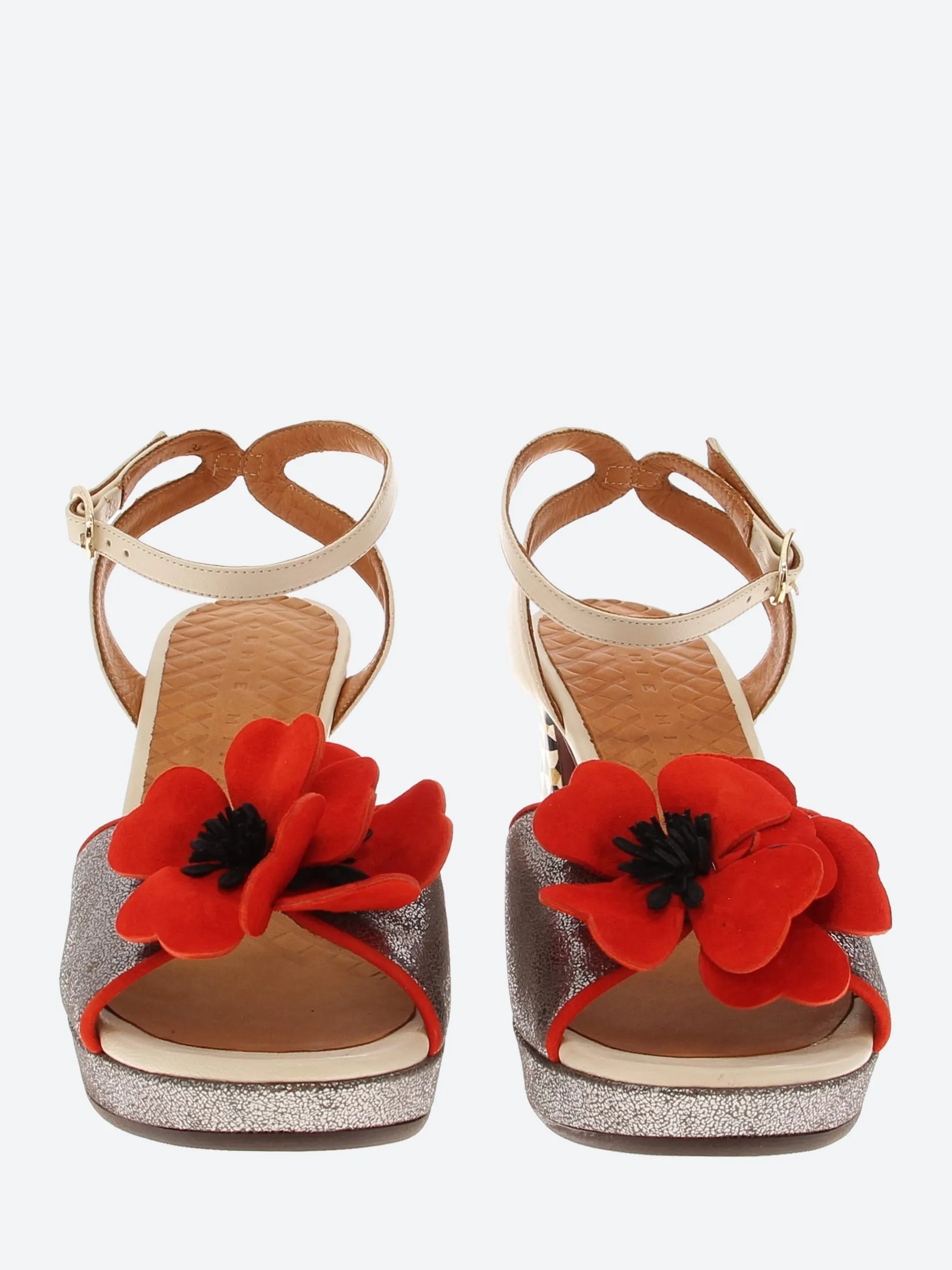 Chie Mihara open toe platform sandal, crafted from soft leather with a cross-ankle buckle closure strap. Complete with a floral applique on the toe piece.