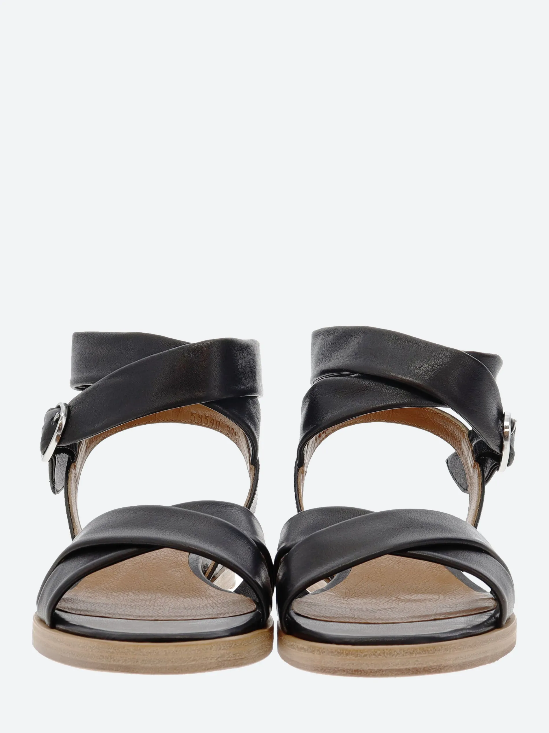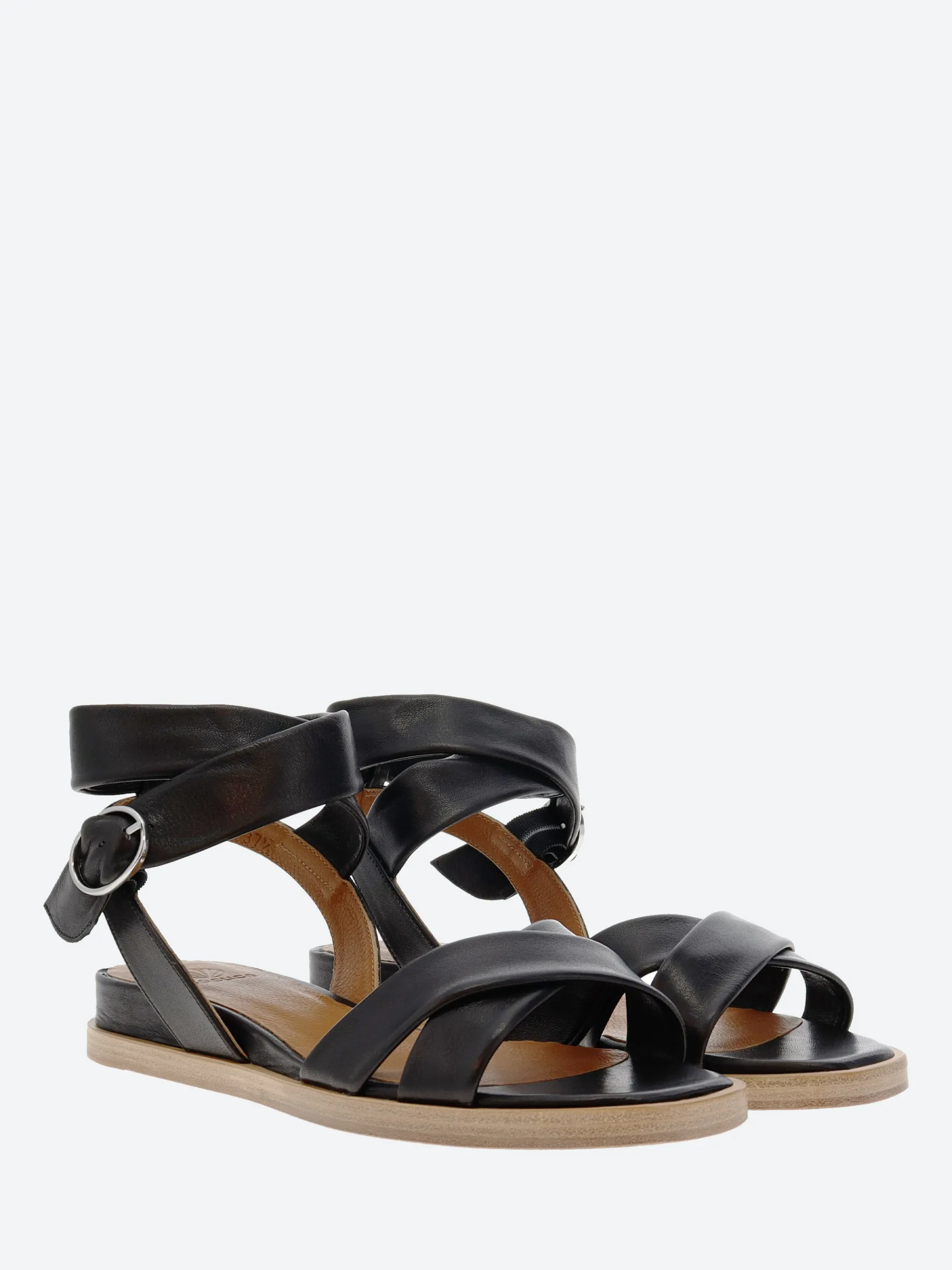 Supple tubular straps cross and support the foot and ankle. Inset leather wrapped wedge and a layered leather sole for urban style and durability.