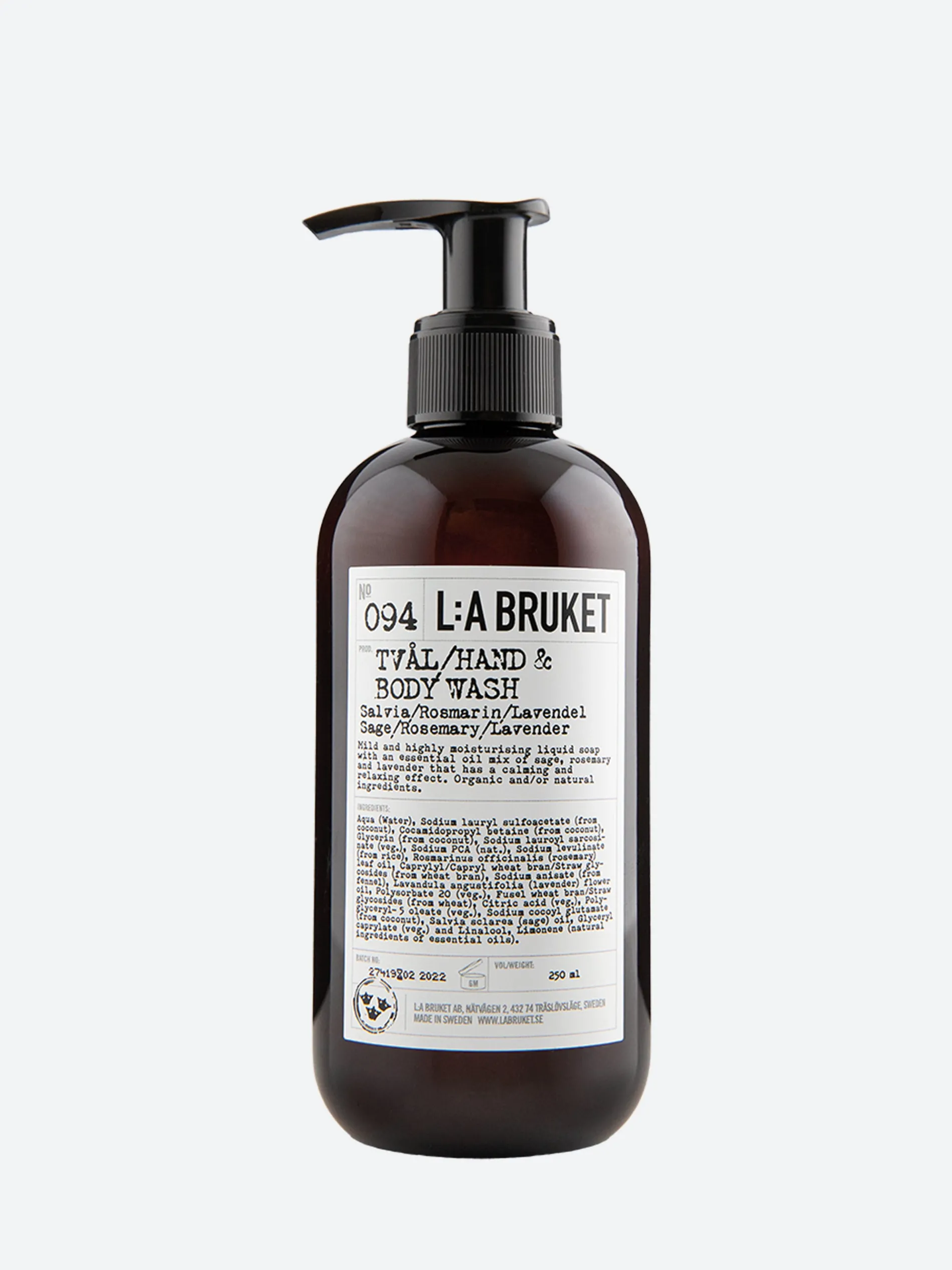 Aqua (Water), Sodium lauryl sulfoacetate, Glycerin, Cocamidopropyl betaine, Sodium lauroyl sarcosinate, Sodium PCA, Parfum, Sodium levulinate, Caprylyl/capryl glucoside, Rosmarinus officinalis (Rosemary) leaf oil, Sodium anisate, Lavandula angustifolia (Lavender) flower oil, Polysorbate 20, Citric acid, Linalool, Sodium cocoyl glutamate, Salvia sclarea (Sage) oil, Glyceryl caprylate, Polyglyceryl-6 oleate, Limonene, Sodium surfactin.