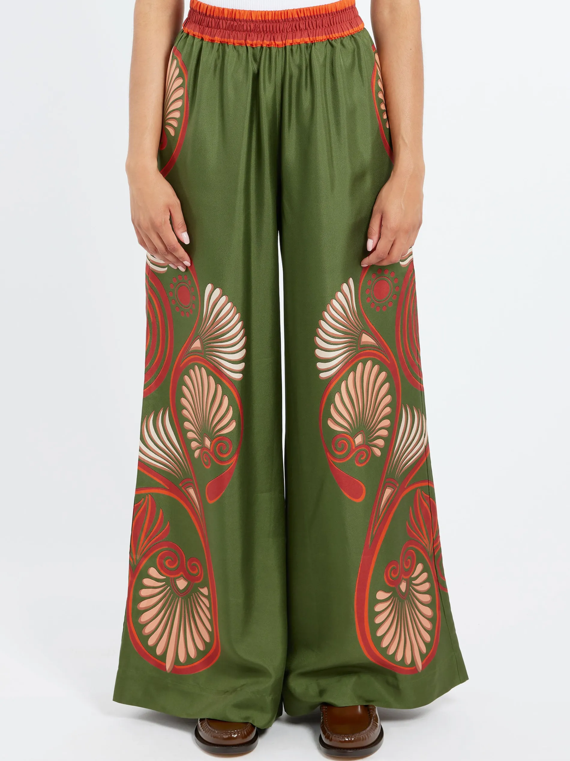 These trousers sit on the waist and fall flared, with a wide, breezy fit through the legs – like a skirt, but with the comfort of pants.