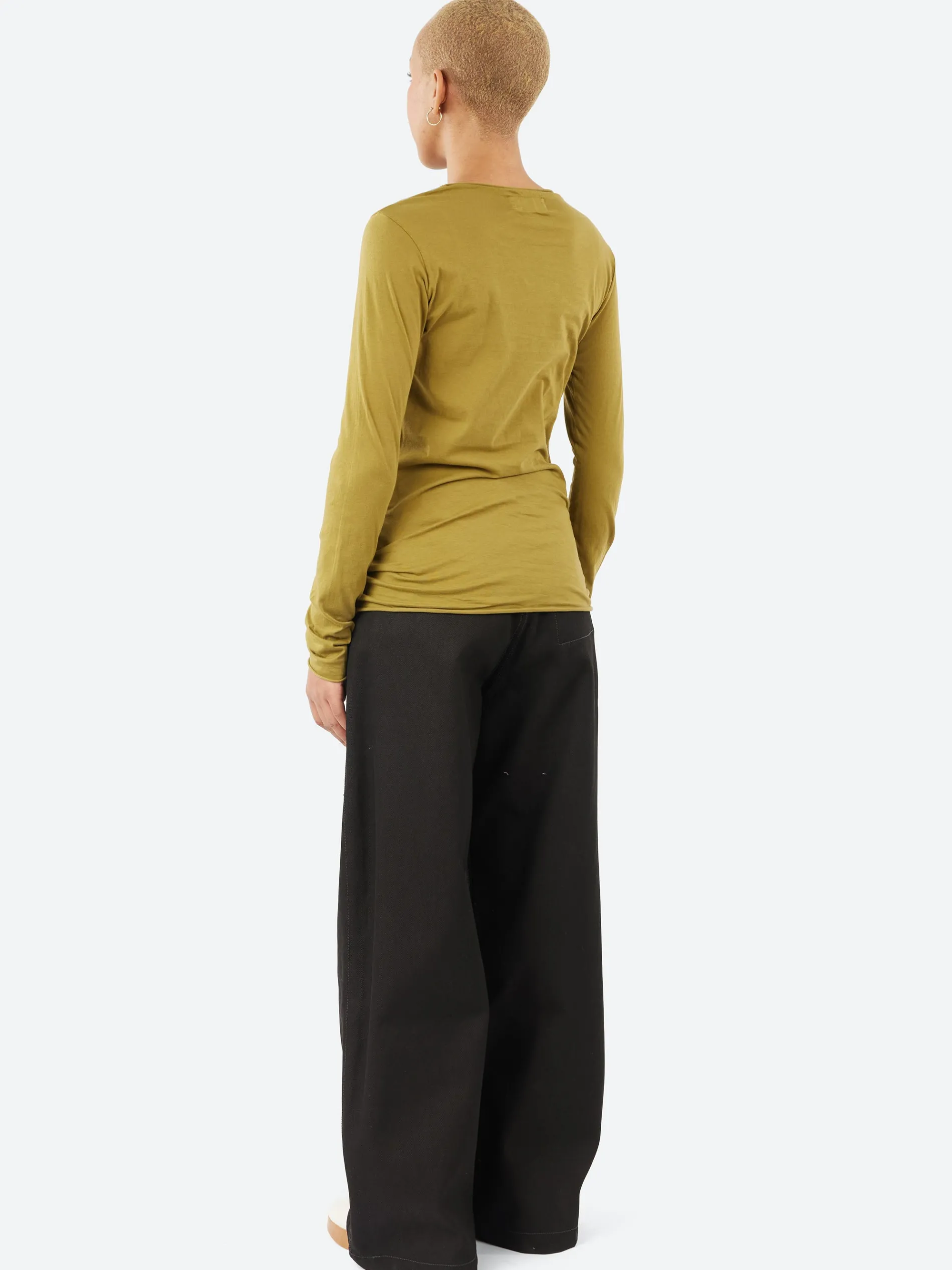 Designed with long sleeves and a classic crew neck, this t-shirt is crafted from light elastic cotton jersey, providing a slight stretch for a flattering fit and added comfort. Its simple yet versatile design makes it a perfect staple for layering or wearing on its own.