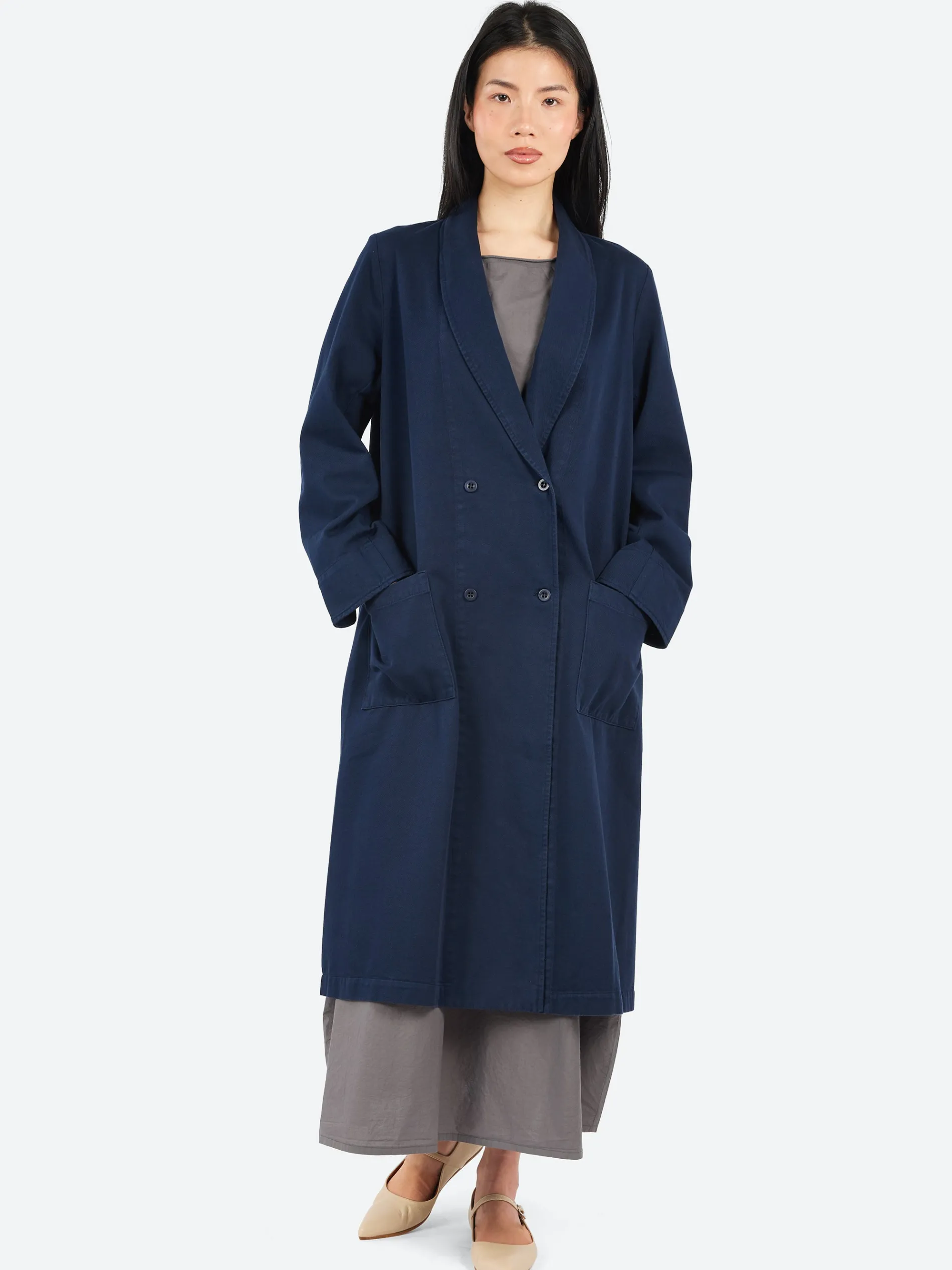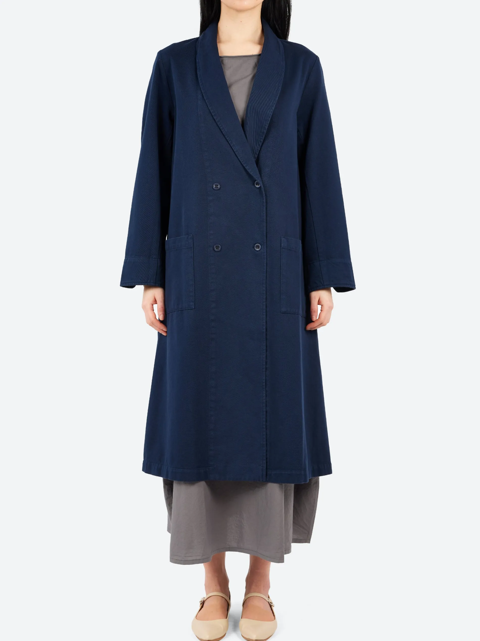 The Labo.Art Double-Breasted Coat is crafted from lightweight cotton drill, offering a sleek and versatile look. It features shawl-style lapels and notched cuffs for added detail, while the patch pockets enhance its practicality. The tonal button closure at the front complements the coat’s minimalist design, and the unlined construction gives it a relaxed, airy feel.