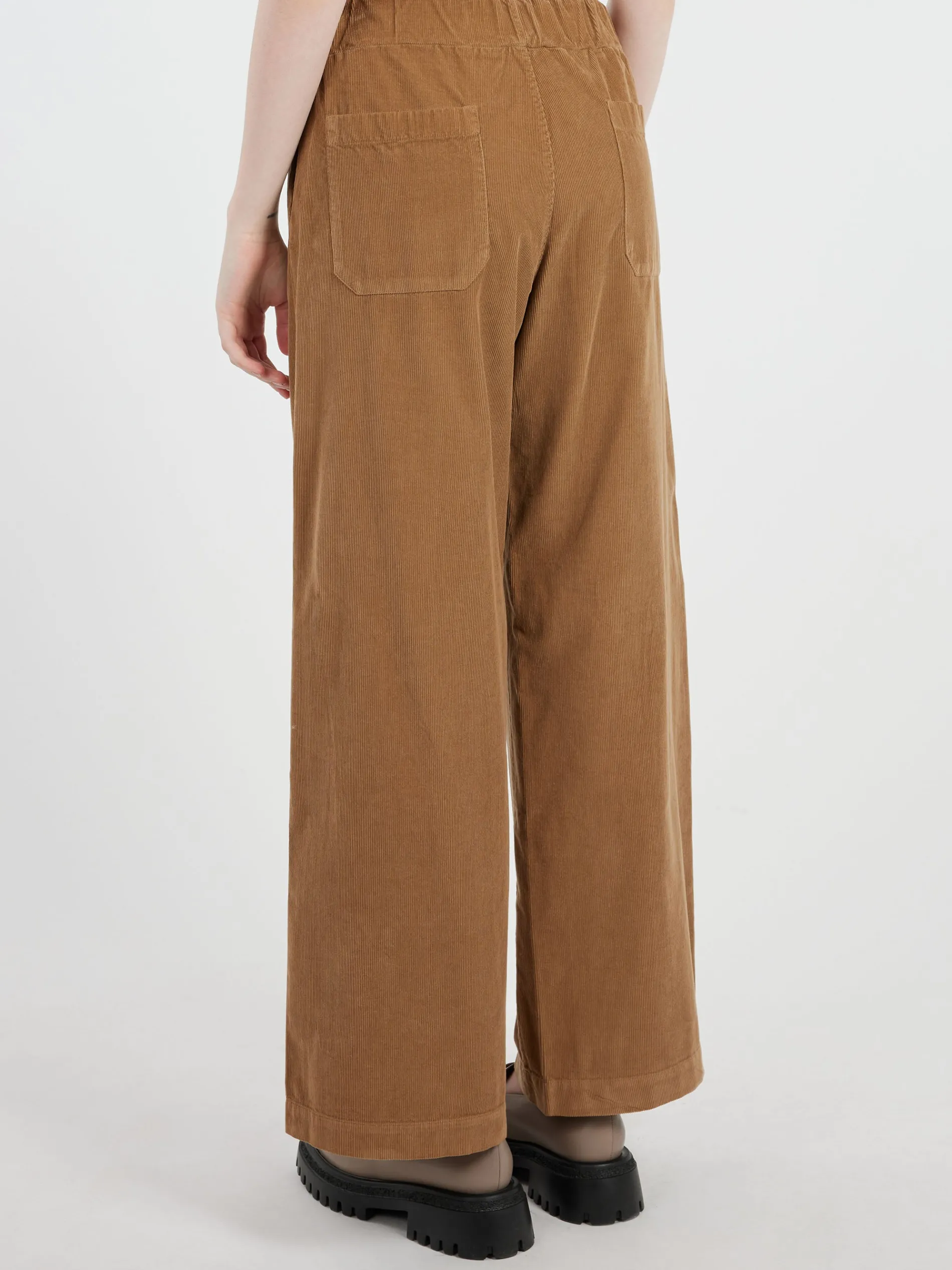 These pants feature a stretch waistband and are made from a thin waled cotton corduroy, making them both comfortable and stylish.