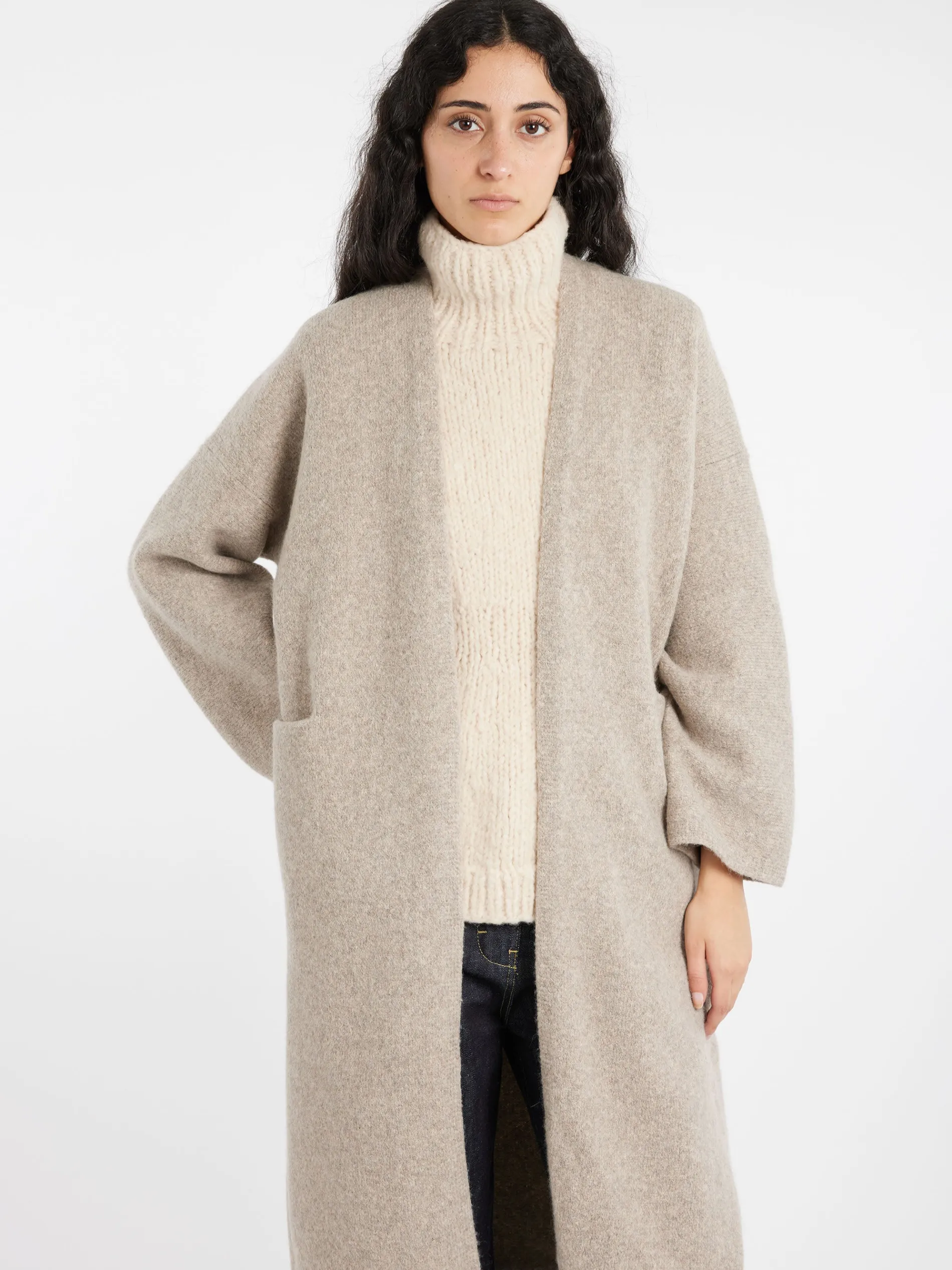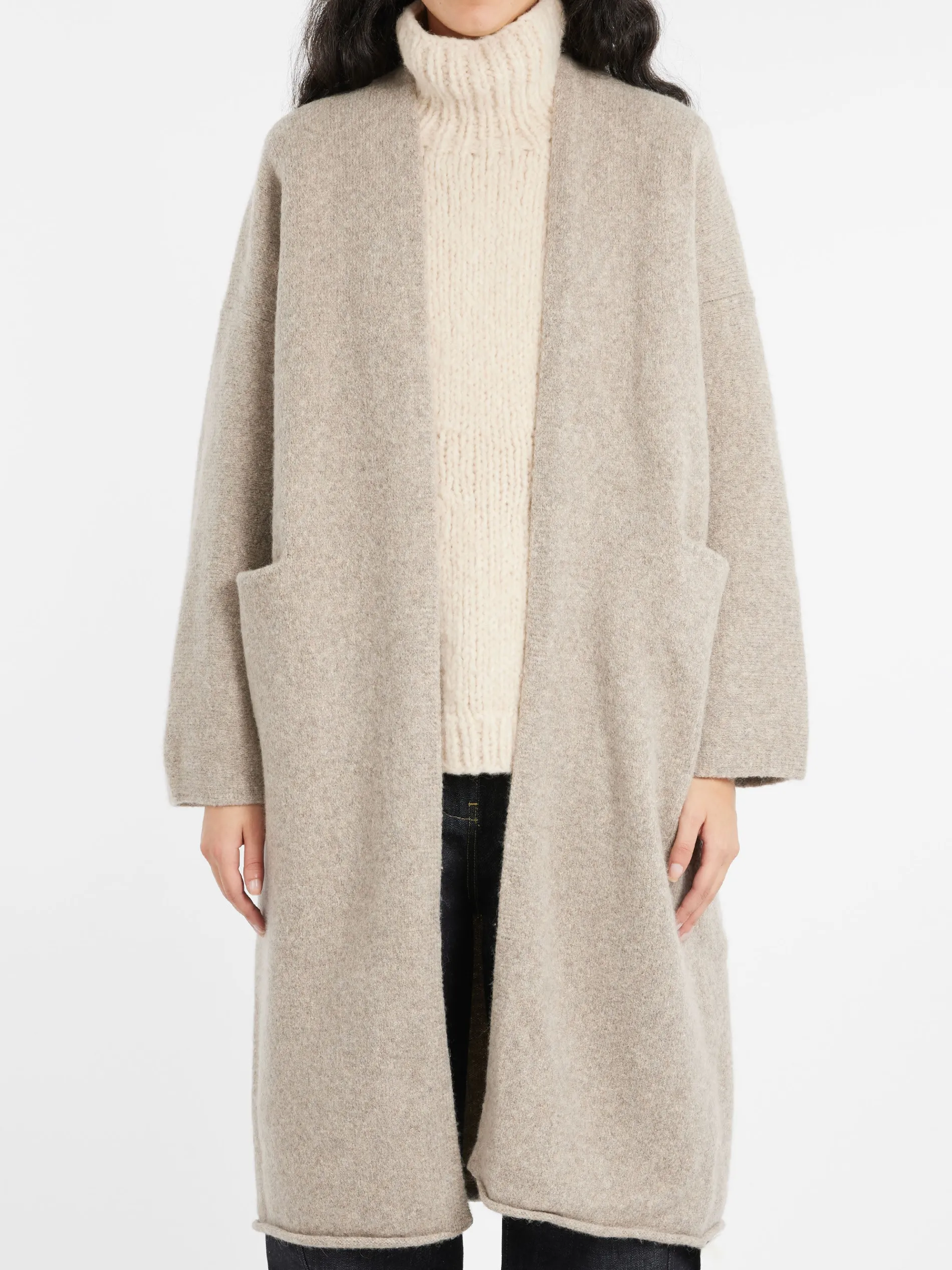 Crafted with a roomy and relaxed silhouette, this long coat boasts a shawl collar and front patch pockets, and is skillfully knitted for a soft felted hand.