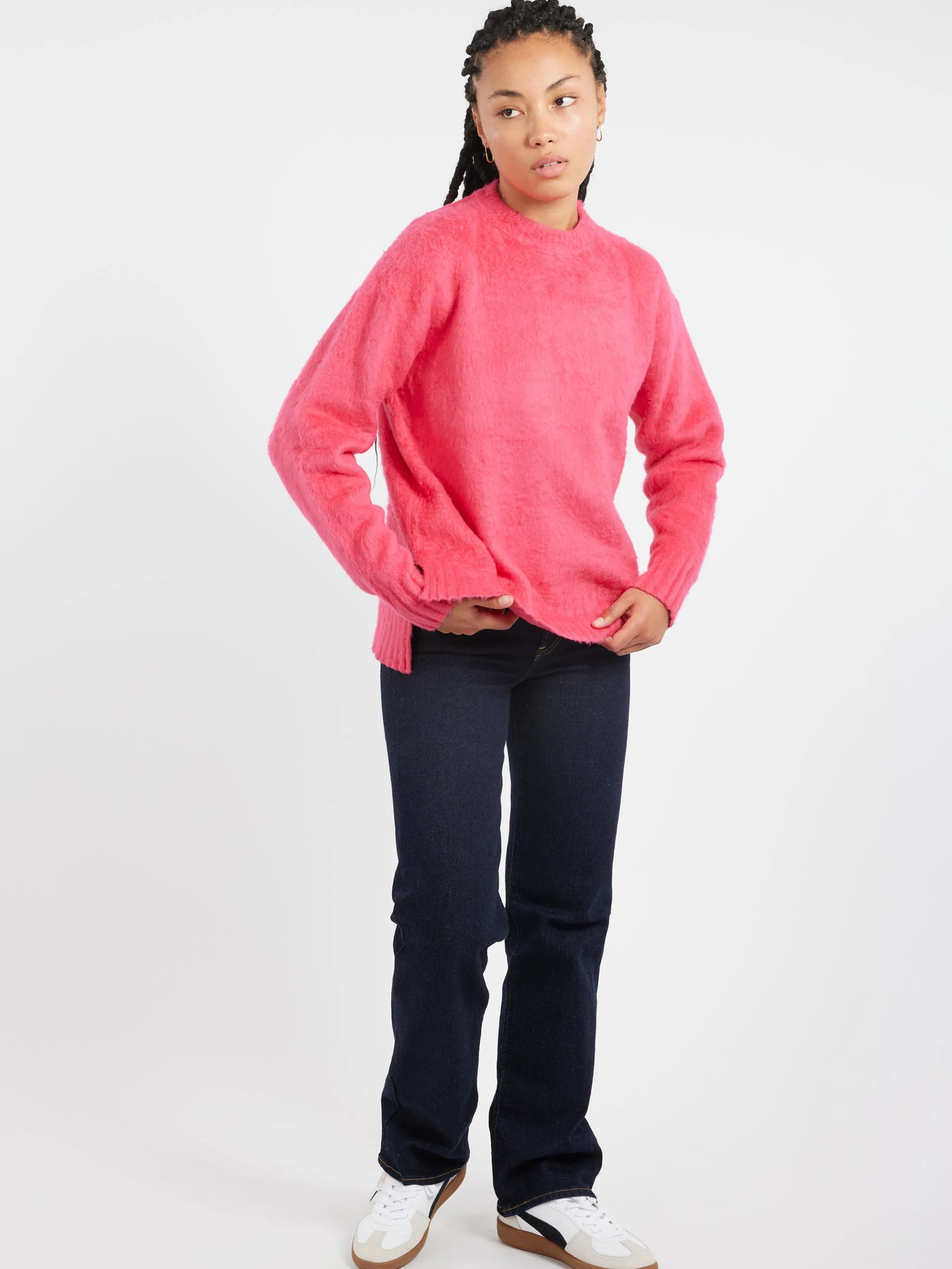 - Full-length straight leg
