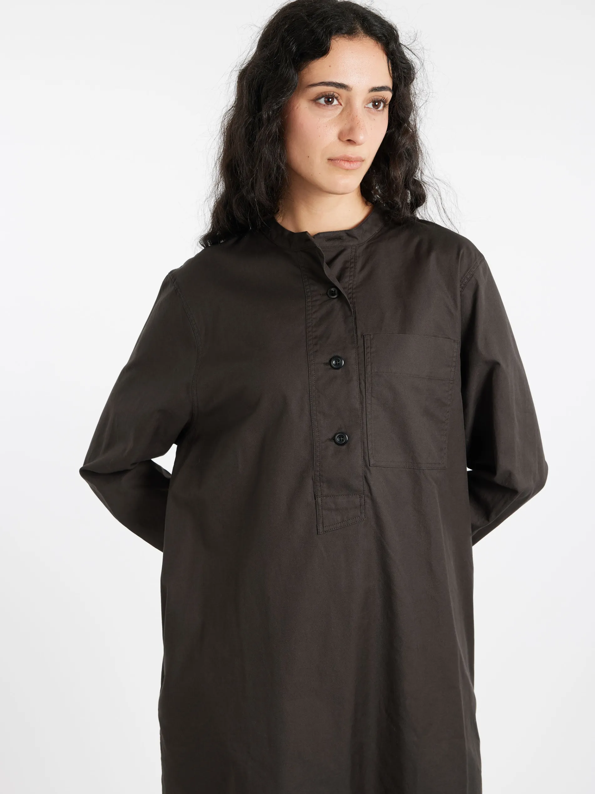 Margaret Howell collarless swing dress in a regular cut. Fabricated in Italian cotton chambray.