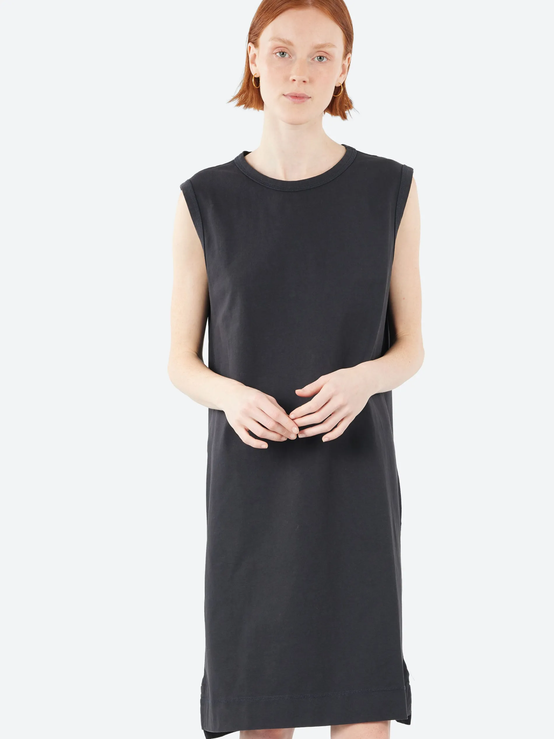 This Overhead Tank Dress reinterprets the ease and simplicity of the MHL. tank top in a longer silhouette. It has a regular, boxy cut and sits at knee length, and is fabricated in lightweight cotton jersey with a matt finish. The style features a back patch pocket and overlock stitch detailing on the side seams and hem.