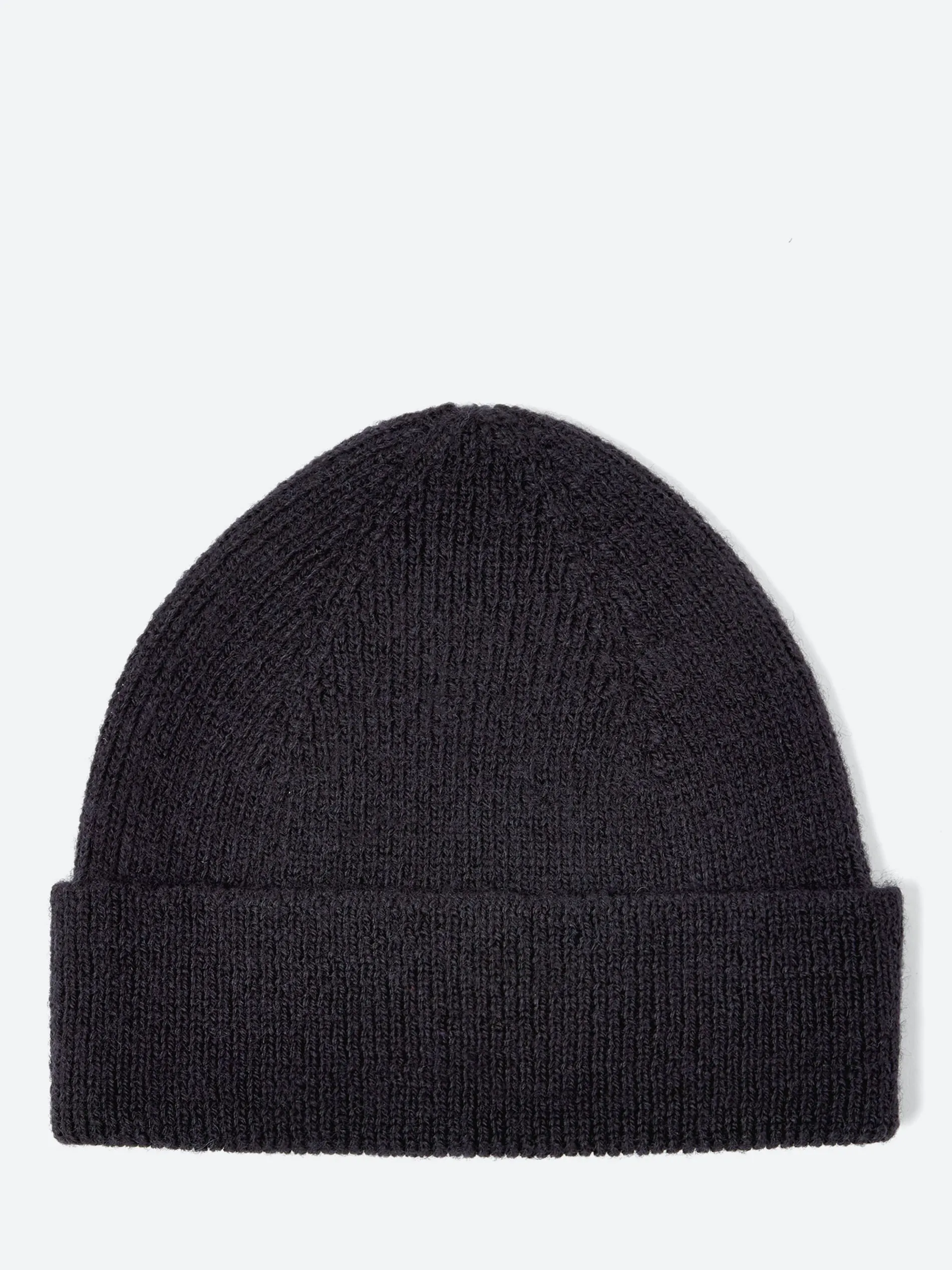 A simple ribbed beanie with a deep turned back brim.