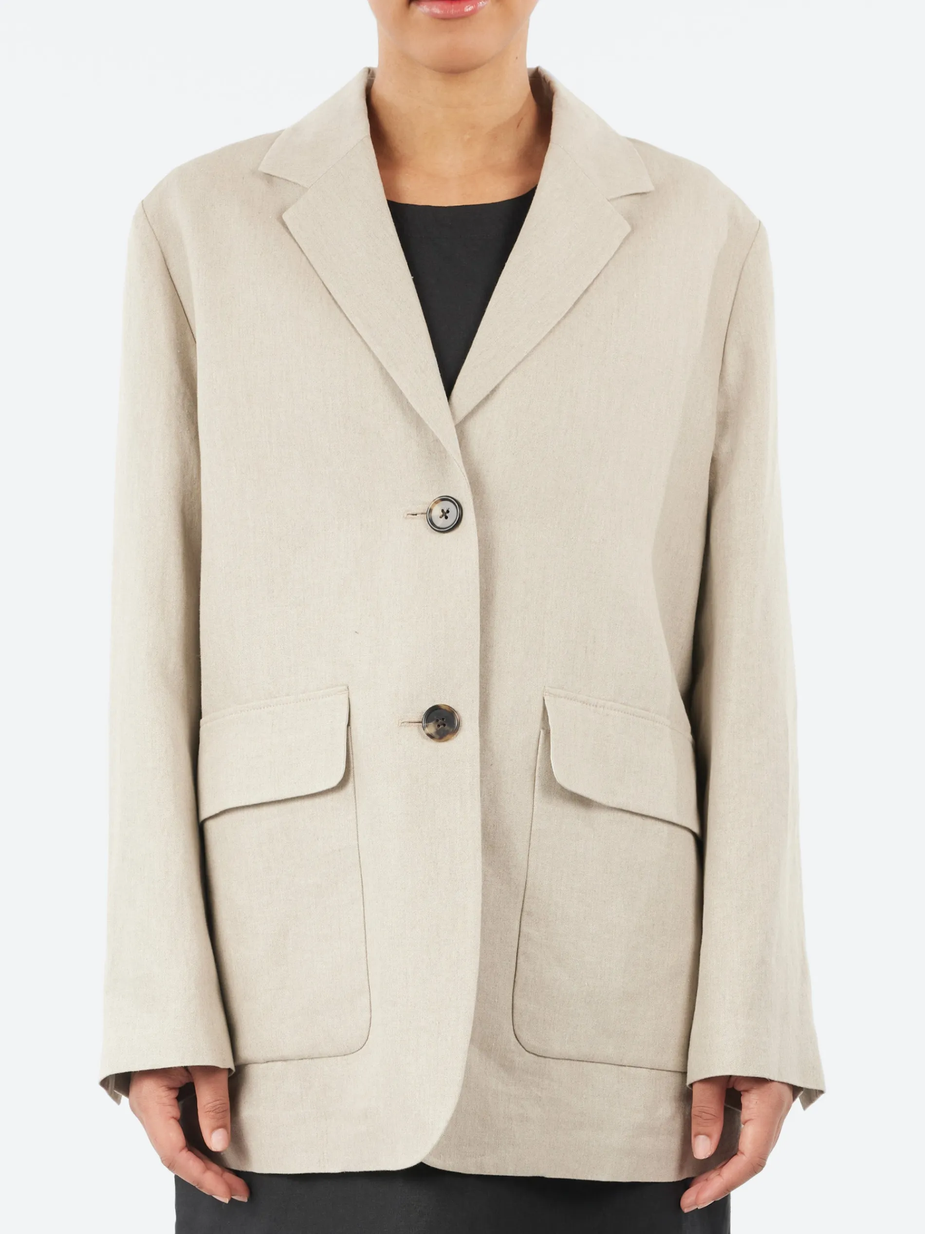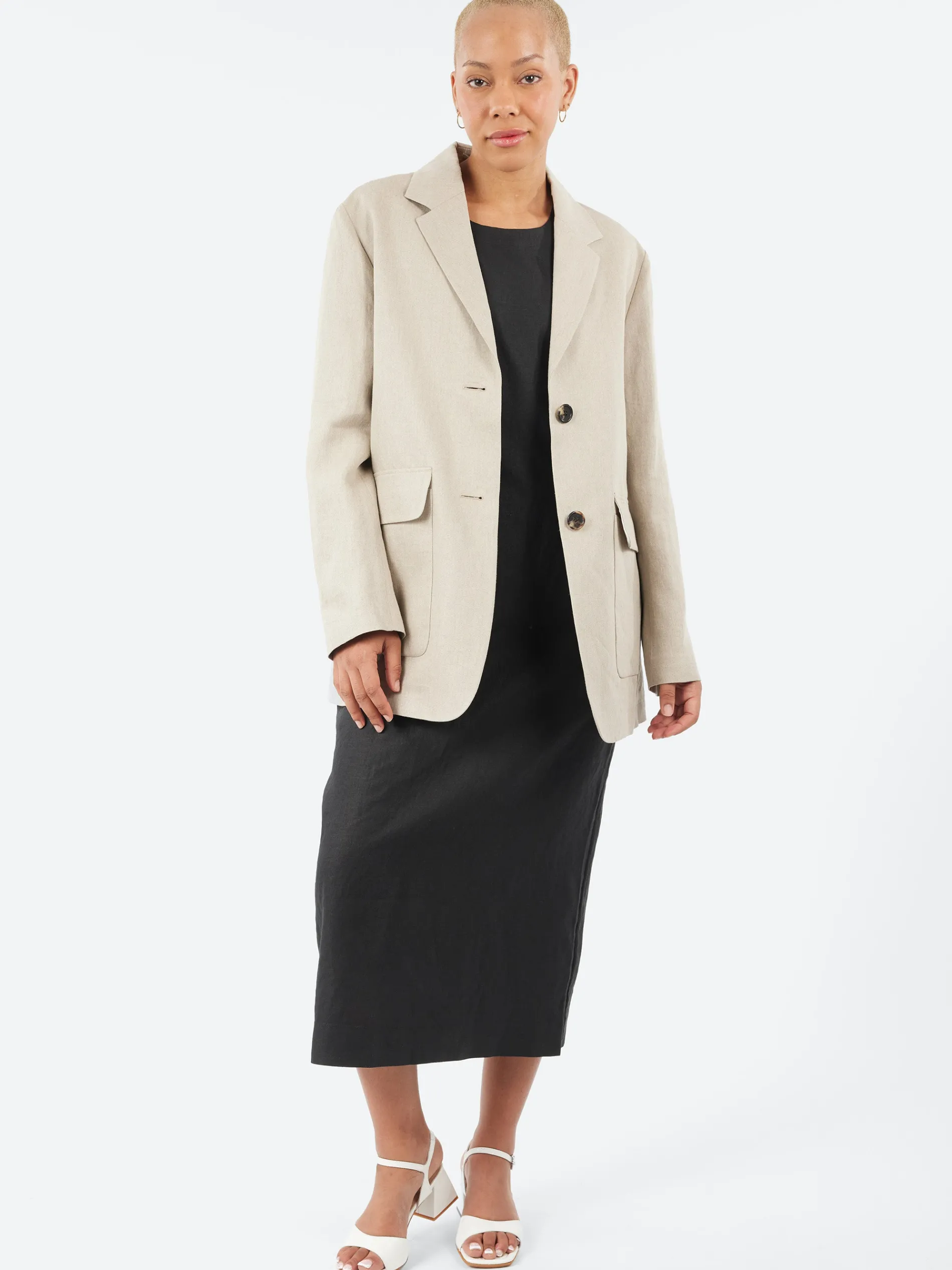 Offering a looser, longer silhouette for women’s tailoring, the Patch Pocket Blazer is a perennial Margaret Howell design. It has a relaxed cut and longer length. This blazer is fabricated in yarn dyed, lightweight linen plainweave in colors developed exclusively for Margaret Howell and is buggy lined in contrast cotton. It is constructed with a two button fastening, flap patch pockets, inside jet pocket and rear center vent, and is finished with a button cuff detail.