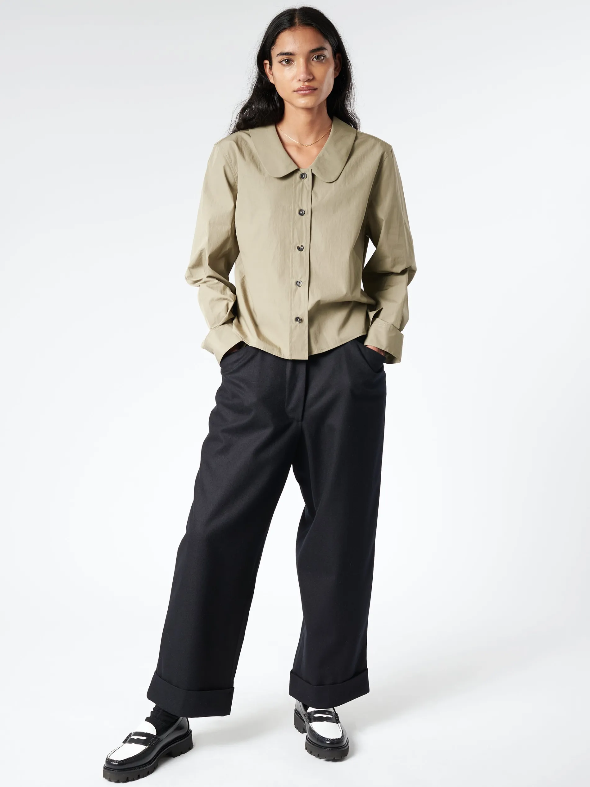 Margaret Howell flannel cropped trouser with a relaxed cut and deep turn-up cuffs.