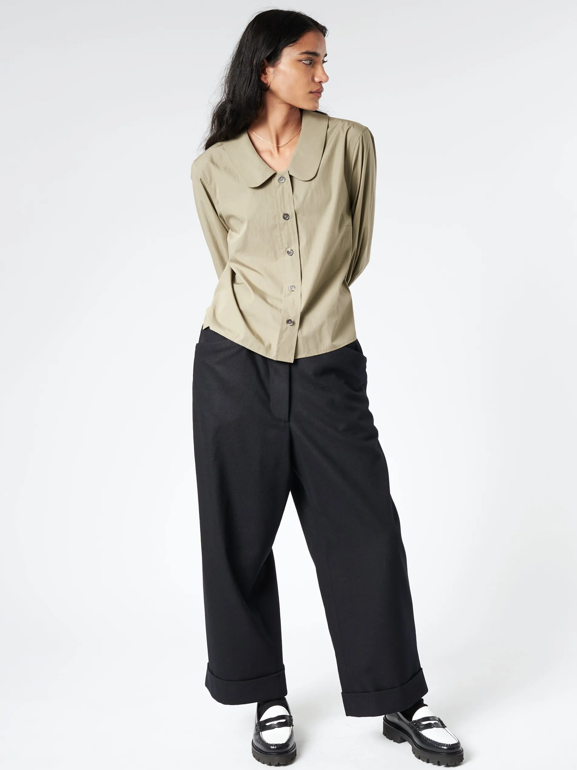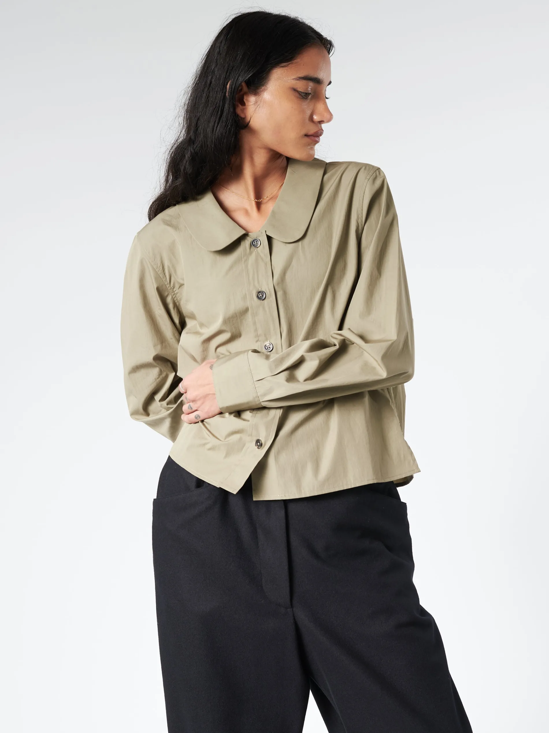 Margaret Howell piece dyed round collar shirt in crisp cotton poplin. Cropped length and cut for a regular fit.