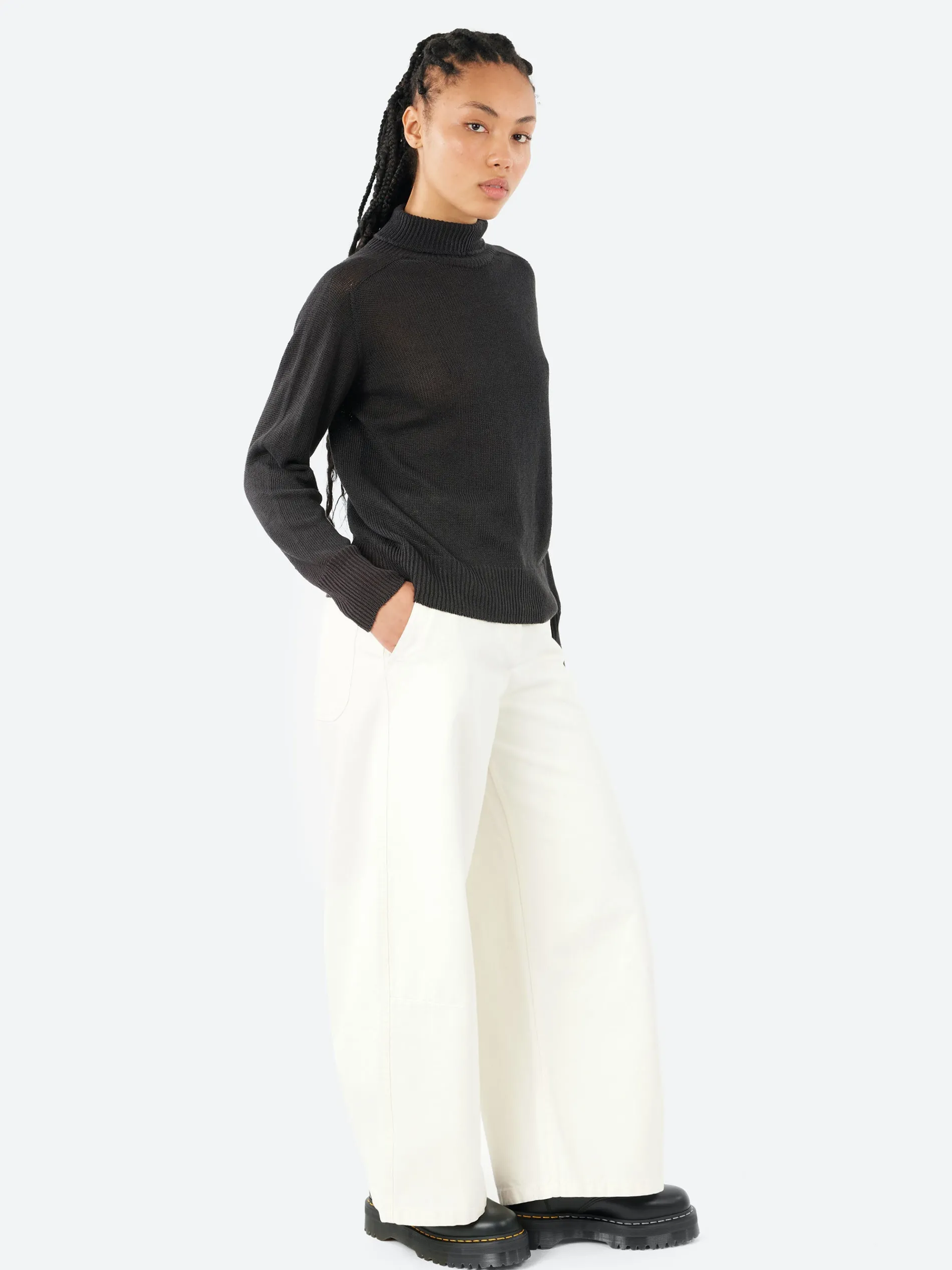 A perennial Margaret Howell design, the Seamless Roll Neck is refreshed in seasonal colours. This jumper has a relaxed fit and is seamlessly knitted in a midweight cotton linen blend. The style is fully fashioned with a long saddle sleeve and loose roll neck with a contrast rib.