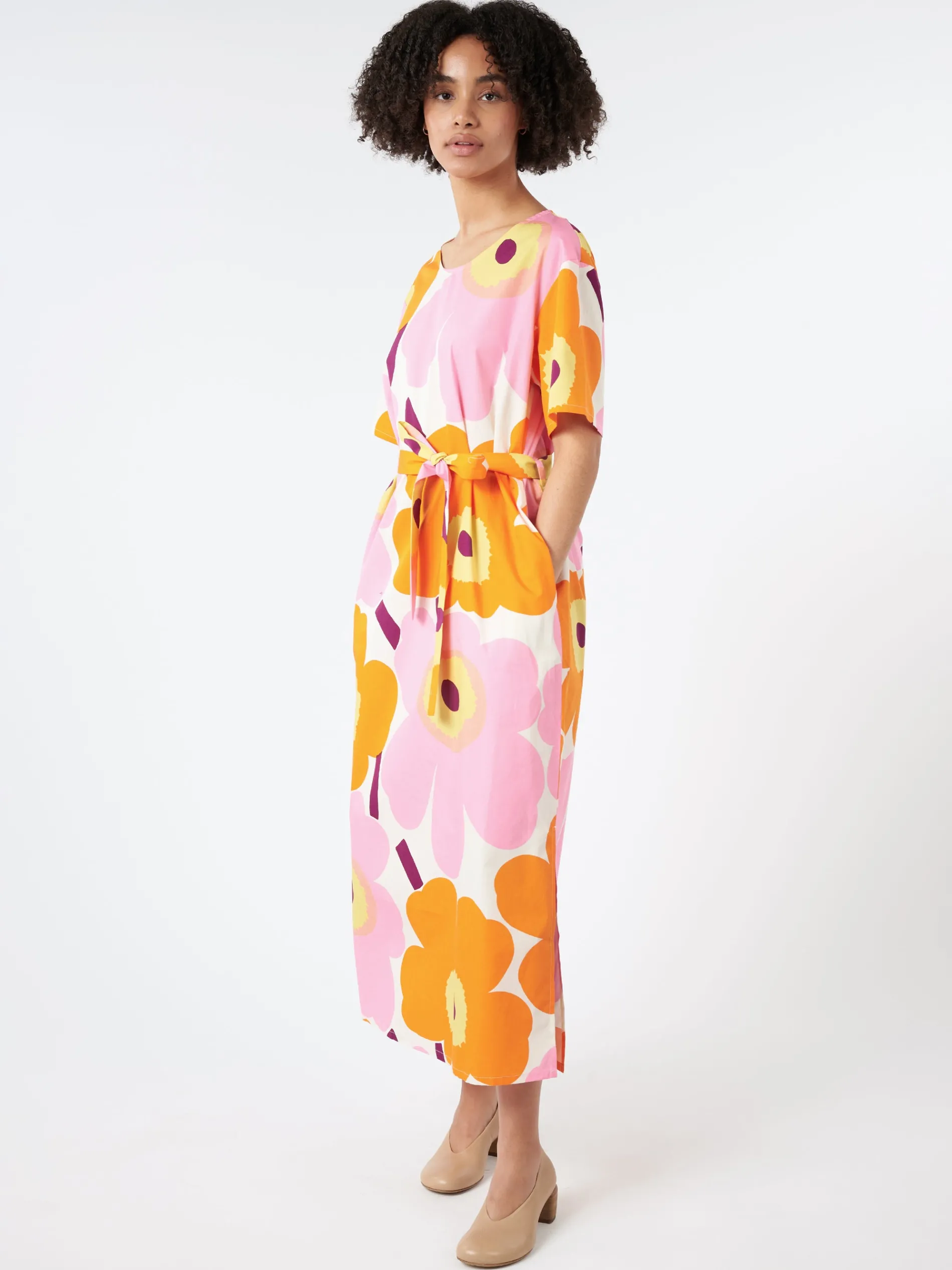 The Kemut dress is made of organic cotton poplin, and it has a relaxed, straight fit. The dress features the Unikko pattern, which is printed in Helsinki.
