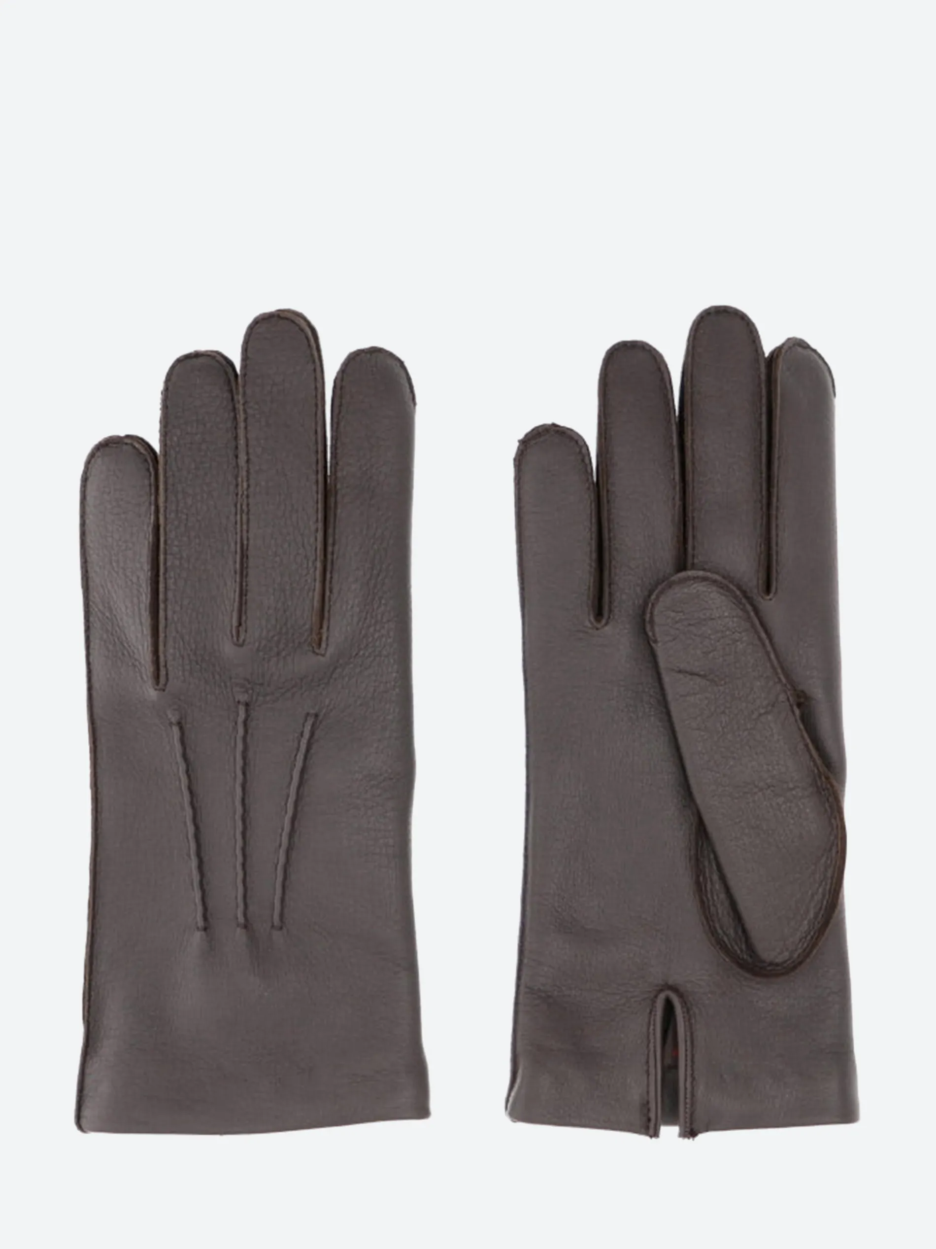 Women’s leather glove with soft fur lining and notch opening on the wrist.