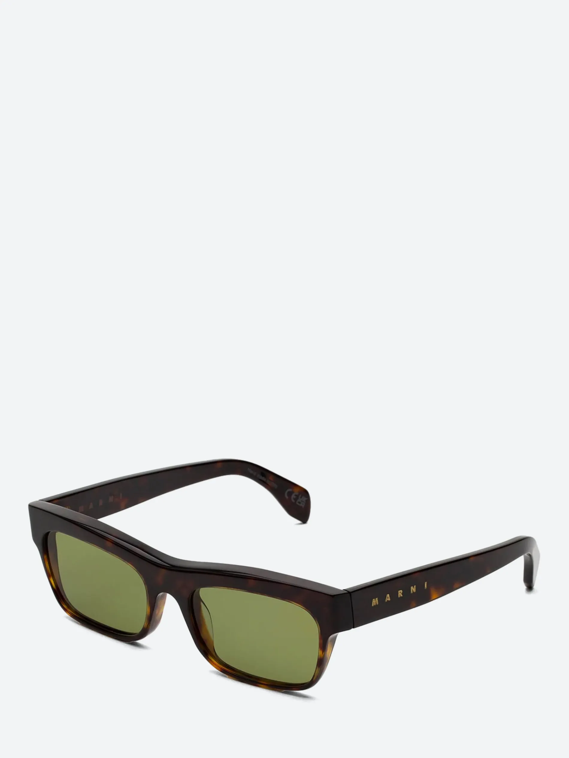Marni sunglasses crafted from Italian acetate, with a classic wayfarer shape. Features a gold-tone Marni logo on the outer temple.