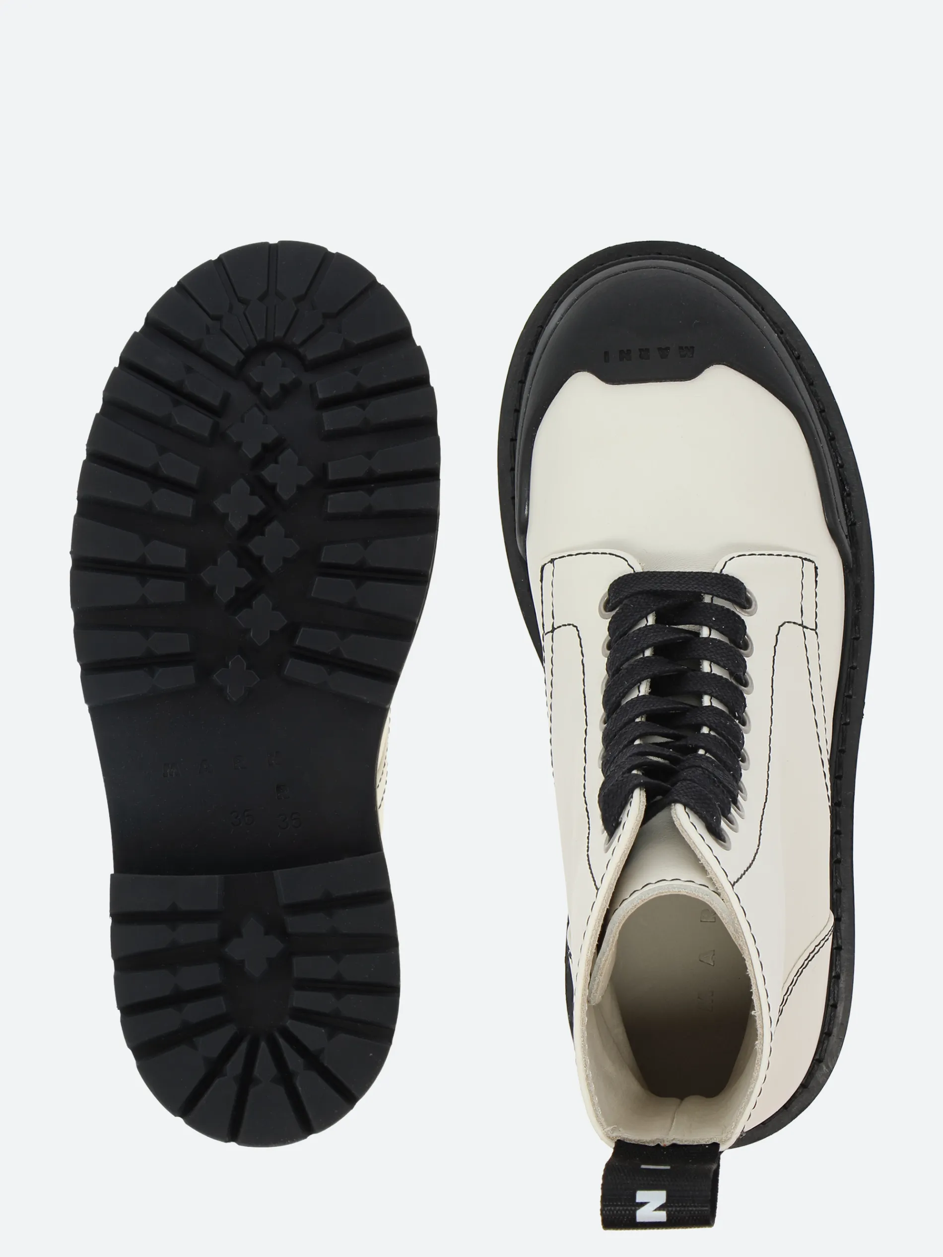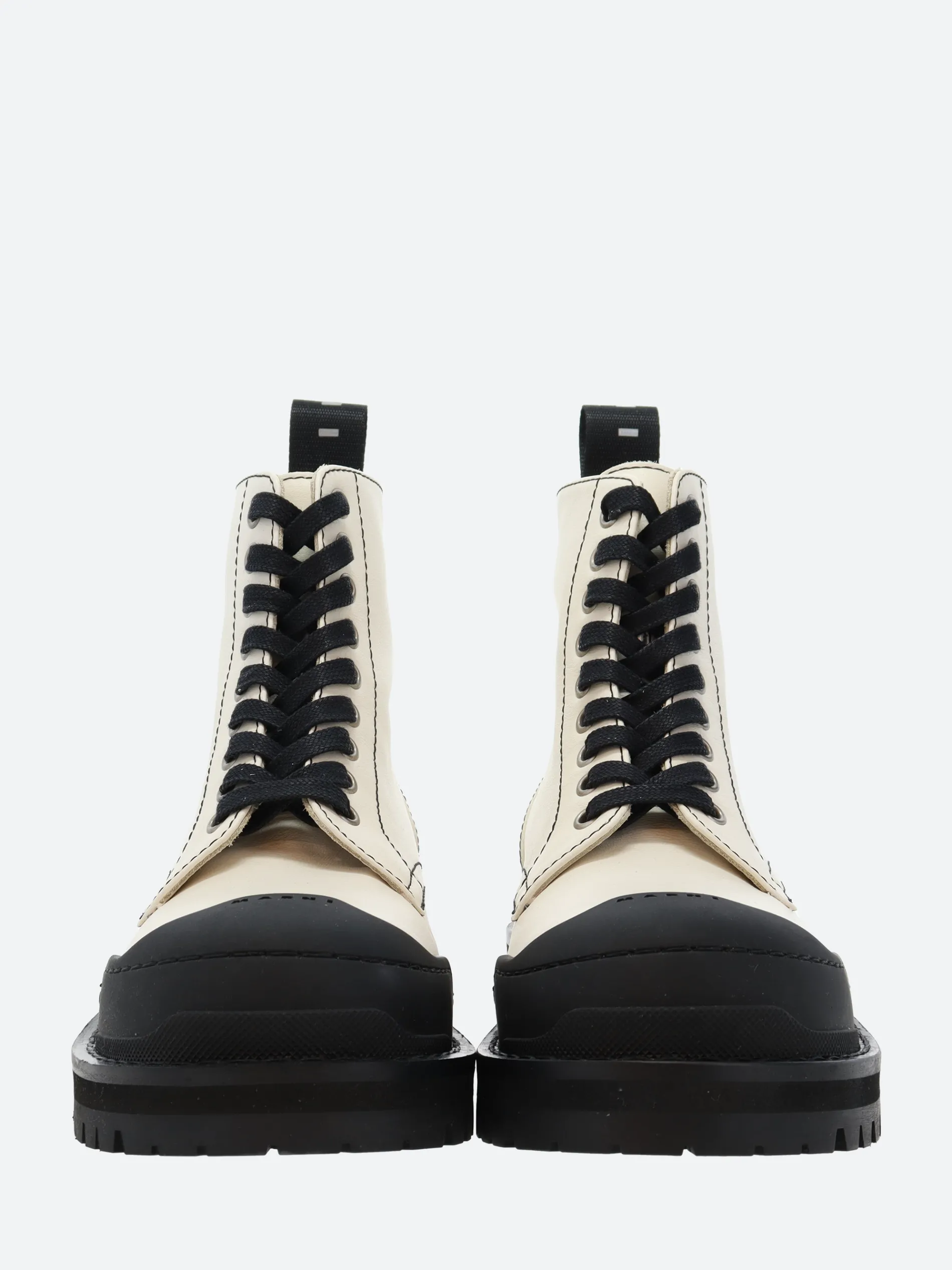 Dada Army boot crafted from smooth calfskin leather. Combat style, featuring a chunky rubber lug sole and reinforced with a logo-detailed rubber toe cap. Embellished with a Marni tape pull tab.