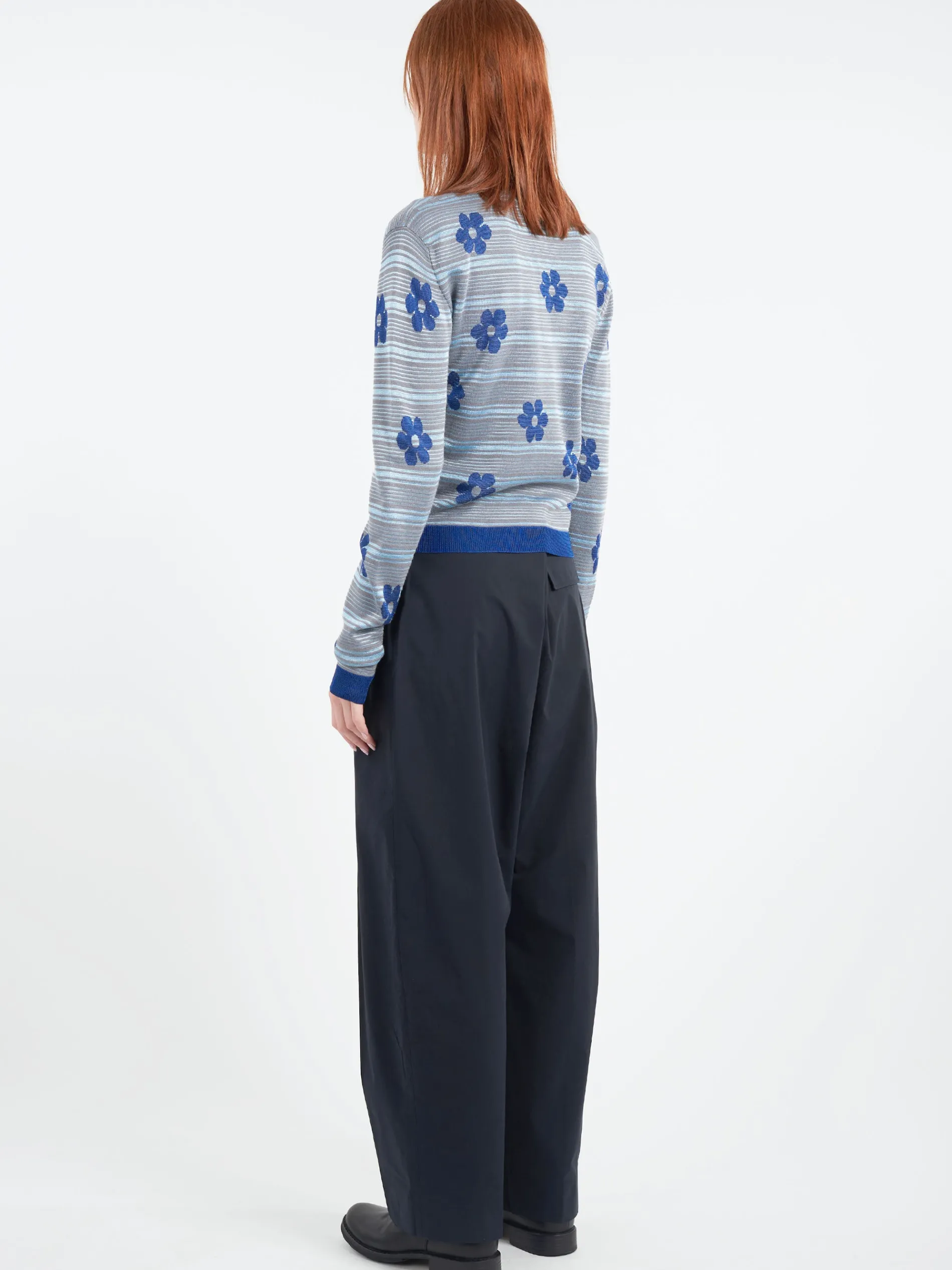 Marni lightweight knit polo with thin stripes and an intarsia floral print.