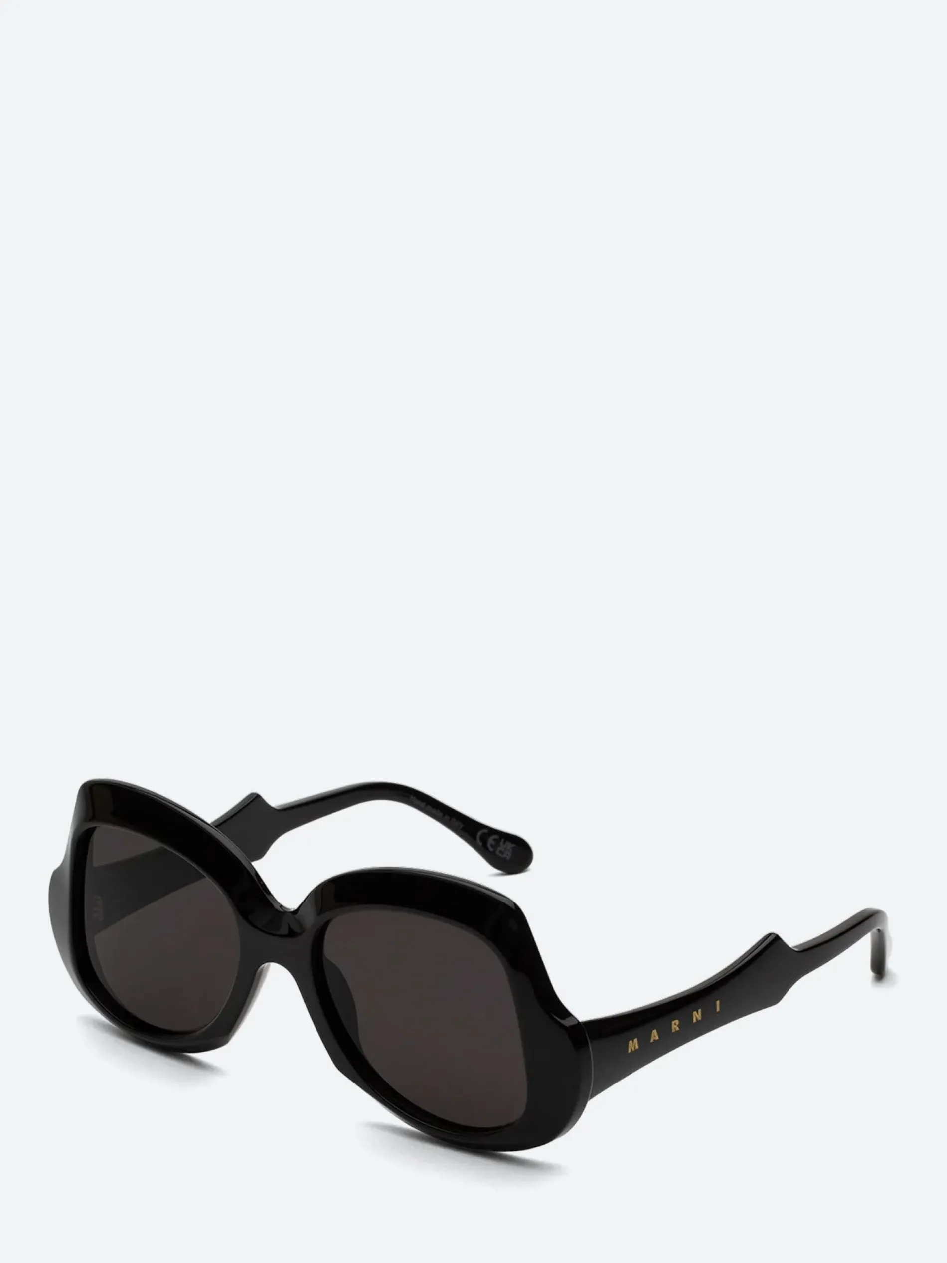 Marni sunglasses crafted from Italian acetate, with a modern, sculptural round shape. Features a gold-tone Marni logo on the outer temple.