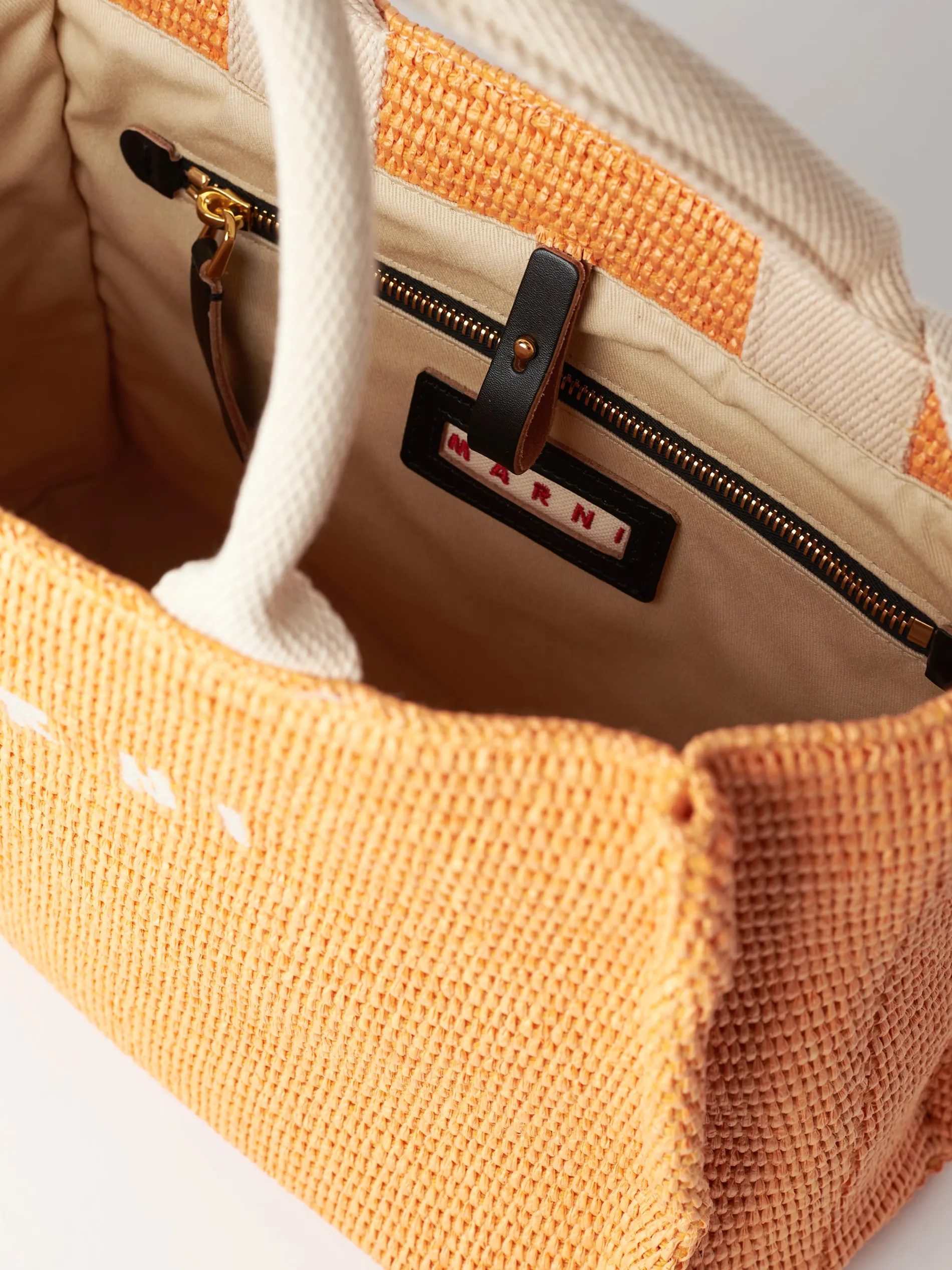 Carry your essentials in style with this raffia basket tote from Marni. Featuring two carry handles, cross body strap, and a zippered interior pocket, complete with an embroidered Marni logo on the front.