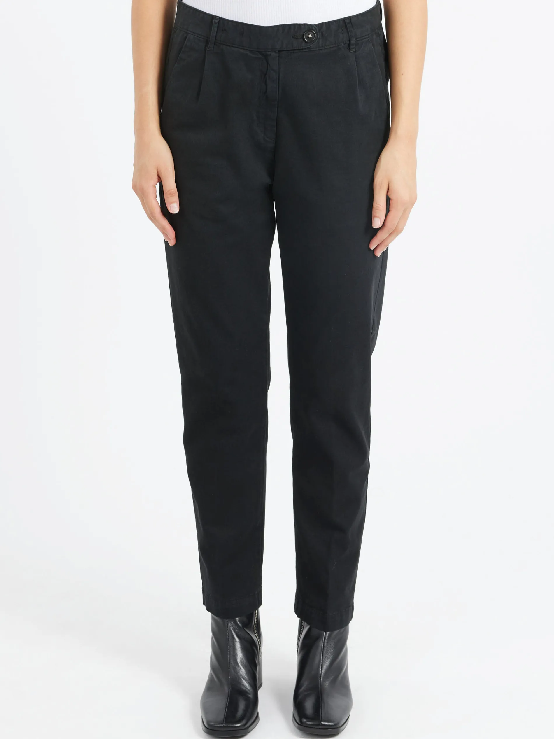 Medium-rise pants with relaxed fit, front pleats, tapered leg at the hem, zip and button closure, made of comfort cotton cashmere.