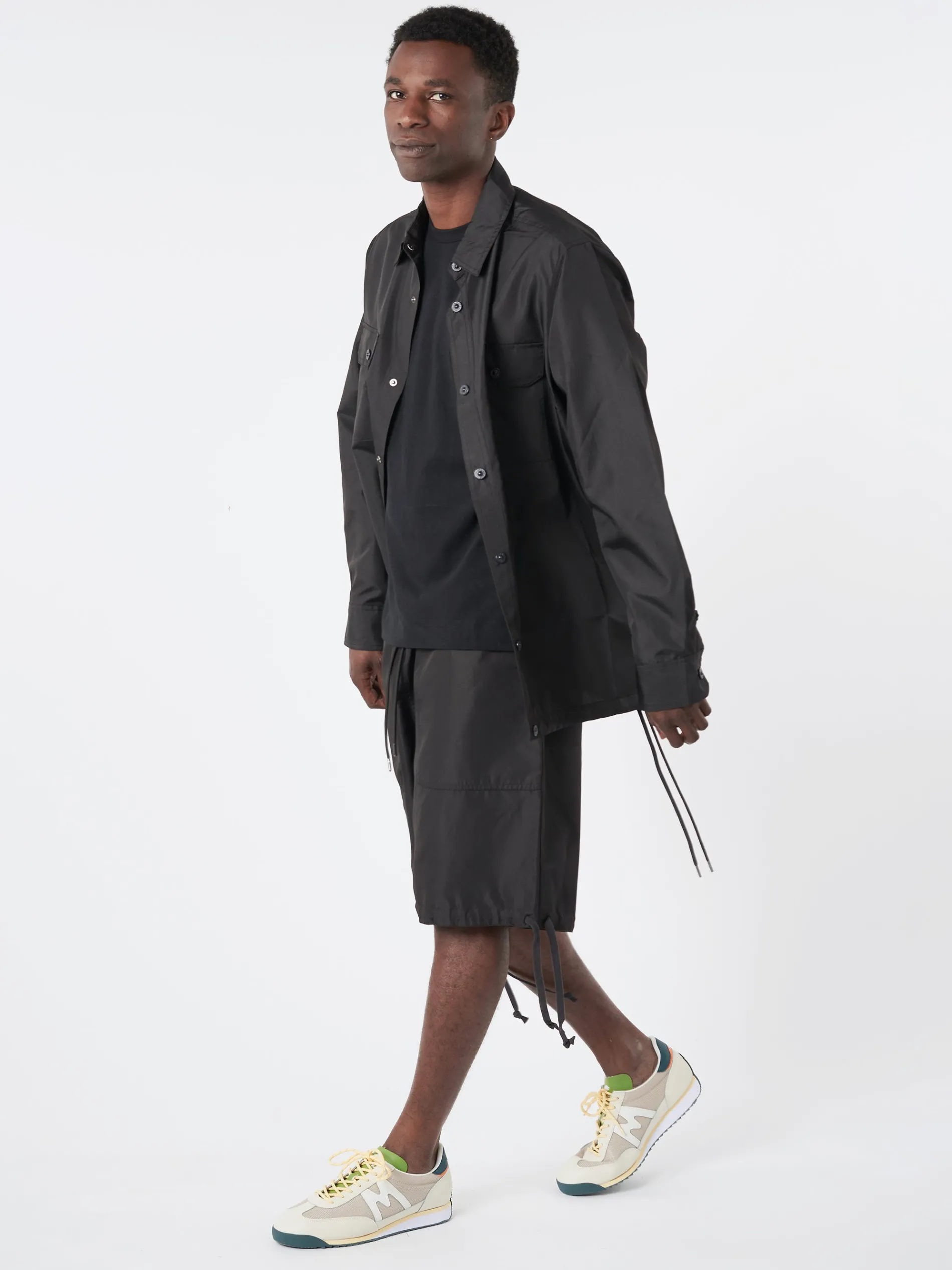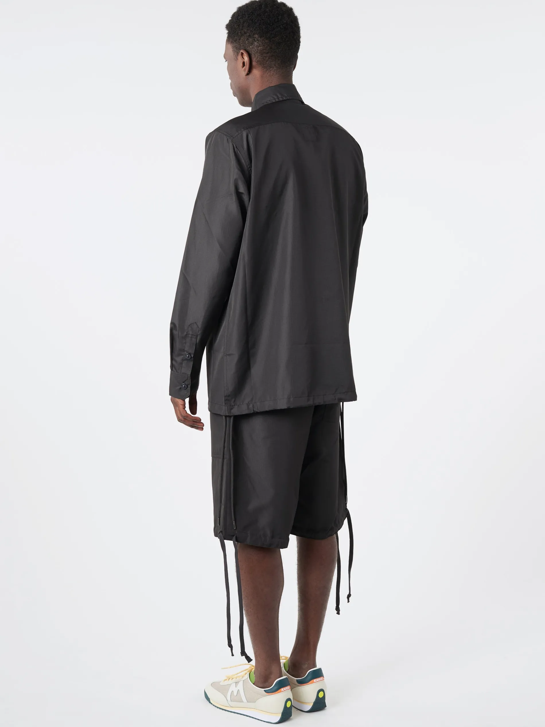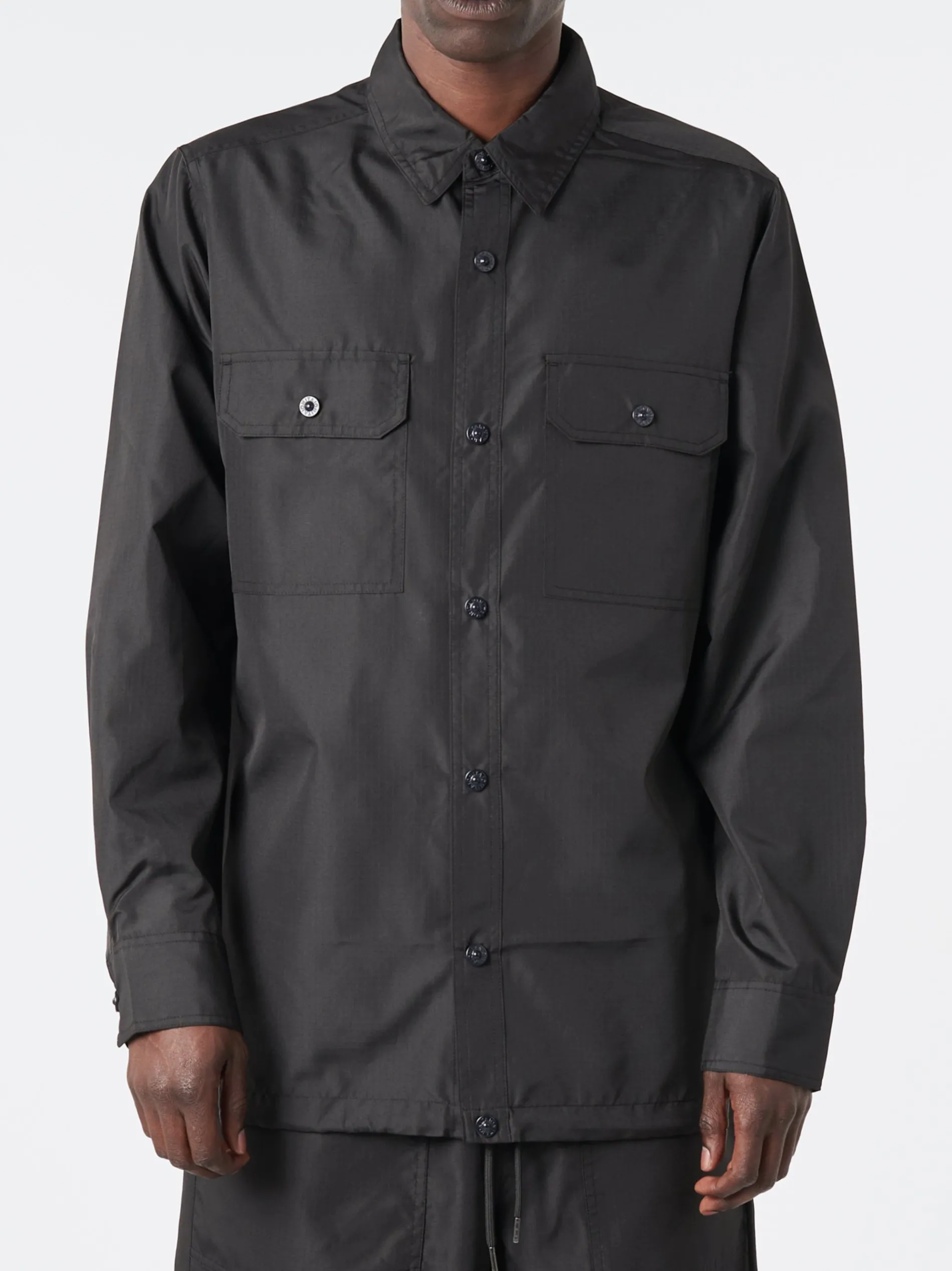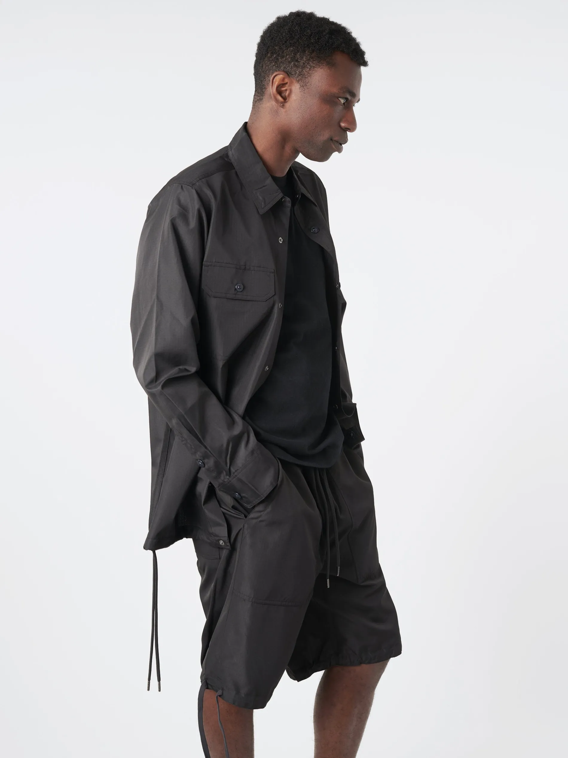 Military long sleeve shirt made from a 5mm square ripstop fabric. The strings visible from the left and right side hems can be hung or tied, and the width and length can be adjusted.