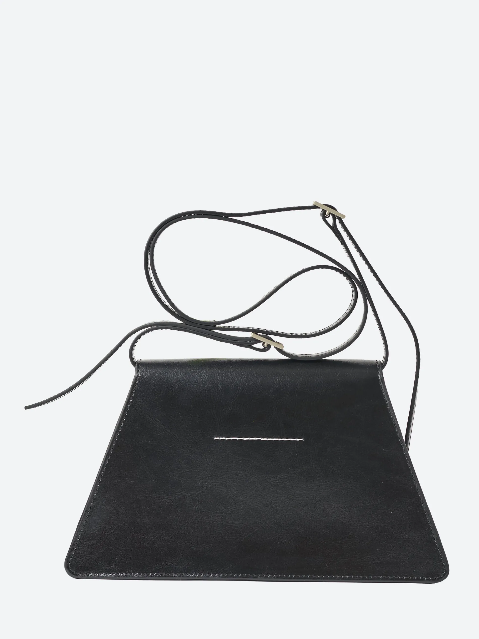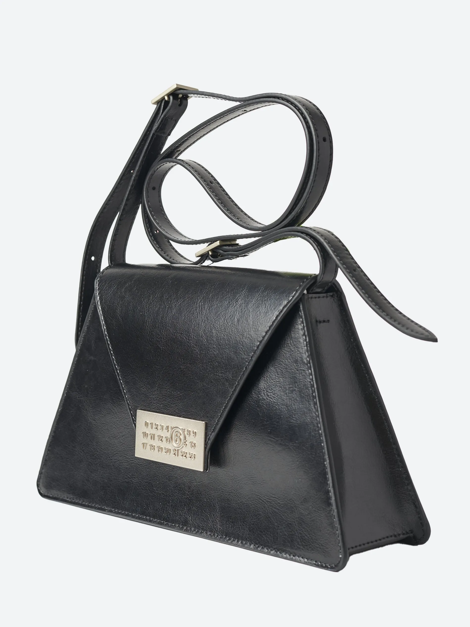 MM6 Numeric medium crossbody bag in black leather. The distinctive triangular flap design is inspired by the Japanese art of paper folding, origami, with the brand’s signature numeric design on the buckle. This dual-wear bag can be worn crossbody or carried by hand as a clutch with its adjustable shoulder strap.