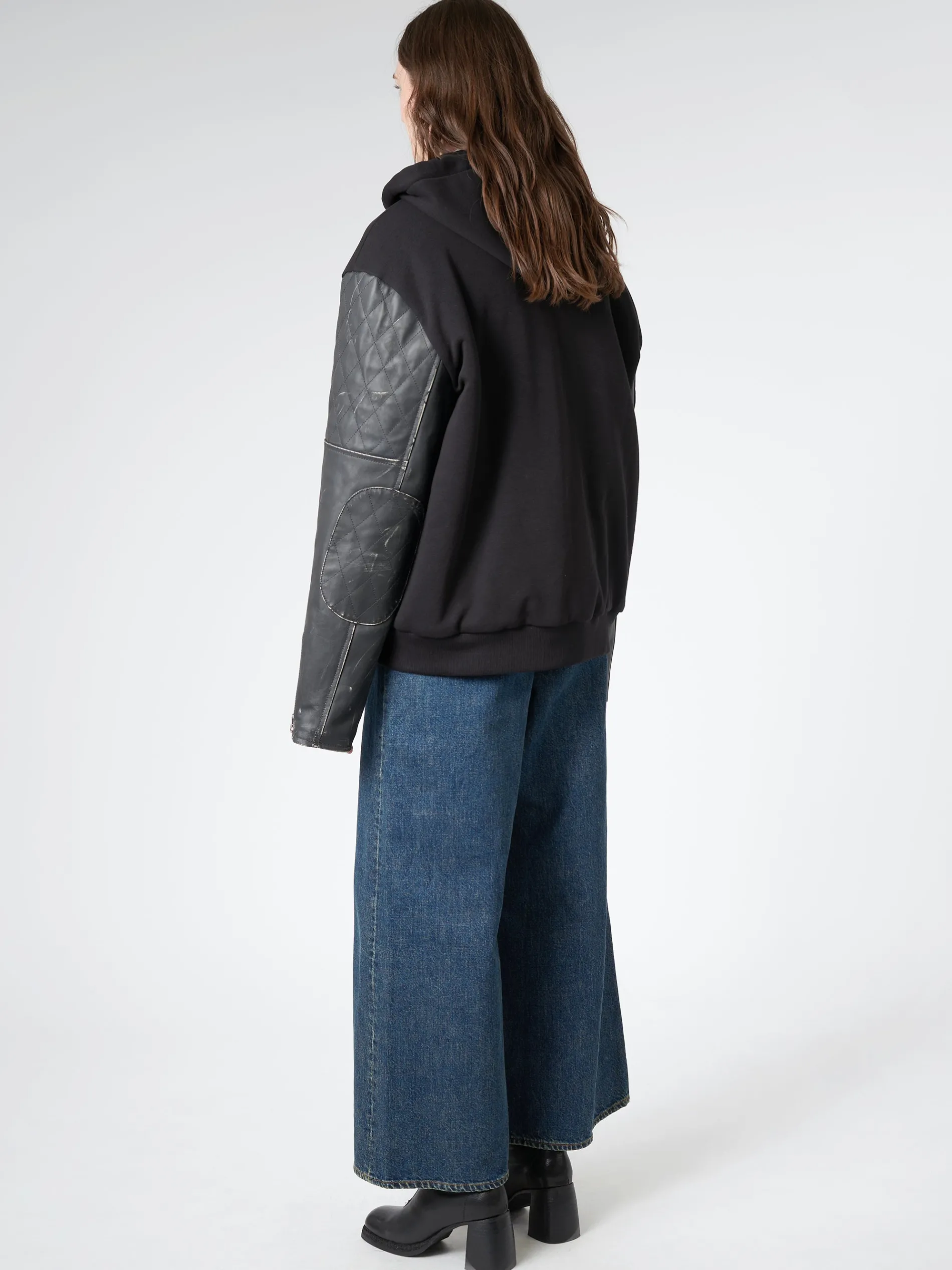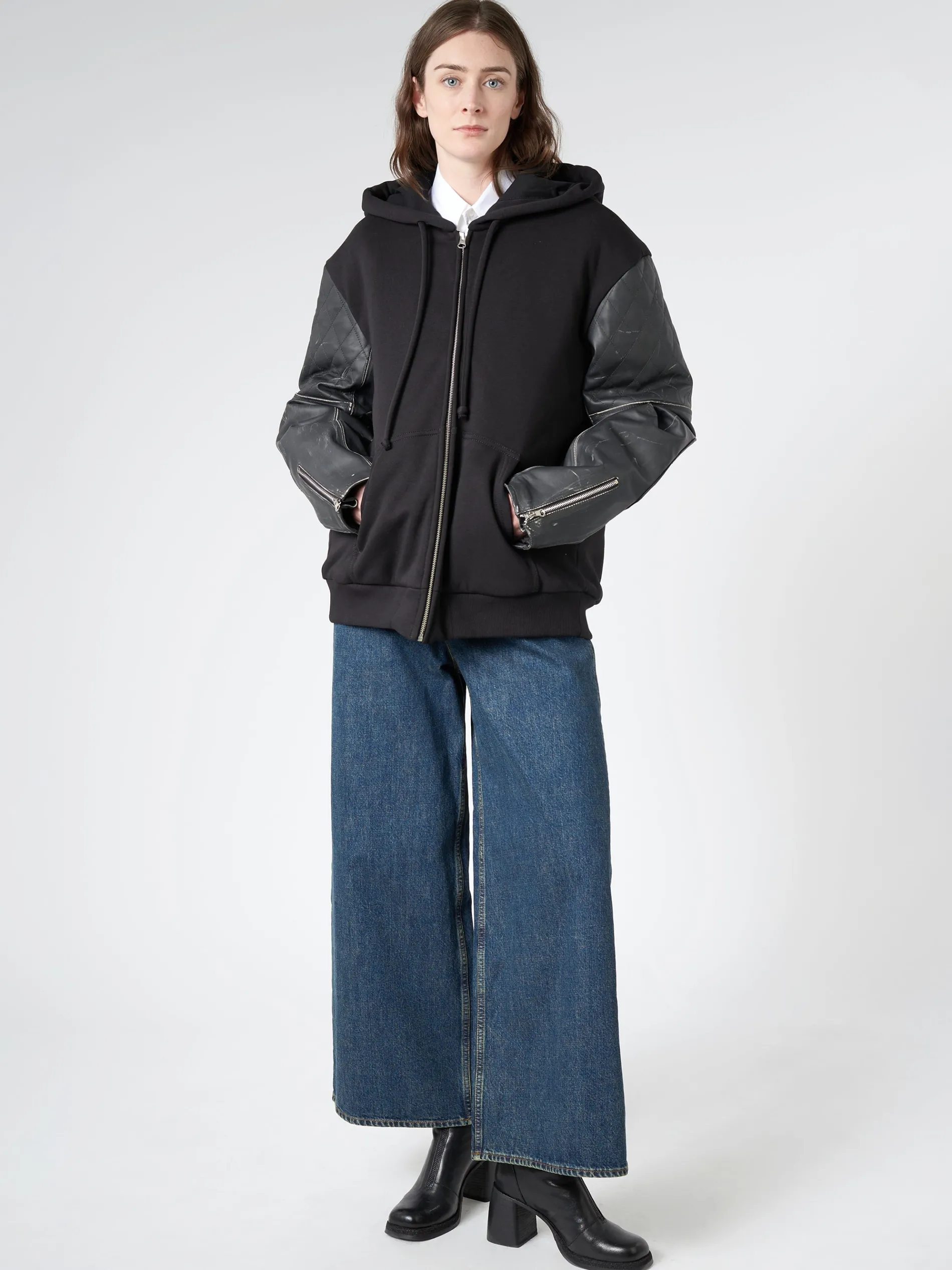 Made from brushed sweat jersey and leather, the hooded jacket combines two classic designs; the hooded sweatshirt and the biker jacket. Distressed detailing and visible seams embody the Maison’s deconstructed codes of design.