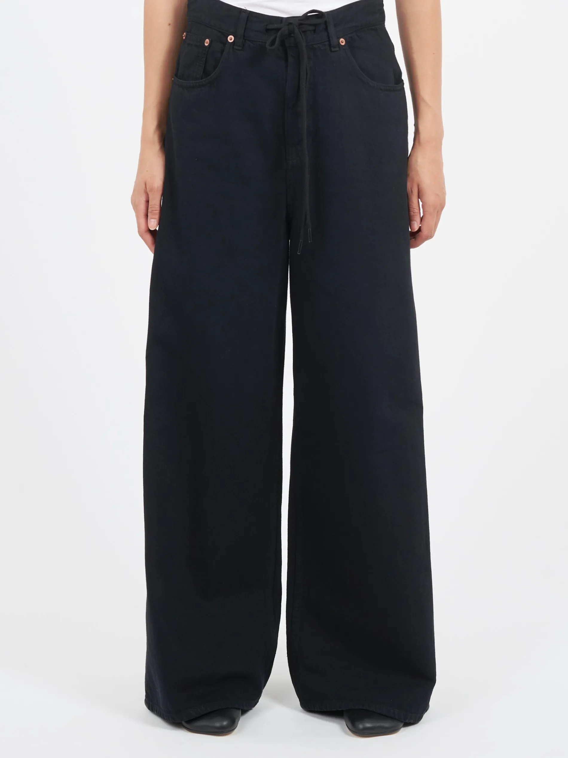 MM6’s low-rise trousers are crafted from cotton denim with a loose fit and wide leg. The style is Made in Italy and characterized by button and drawstring closure and belt loops. The brand’s discreet yet distinct signature, a horizontal line of white stitches, is found on the back of the garment, along with the numeric signature jacron label.
