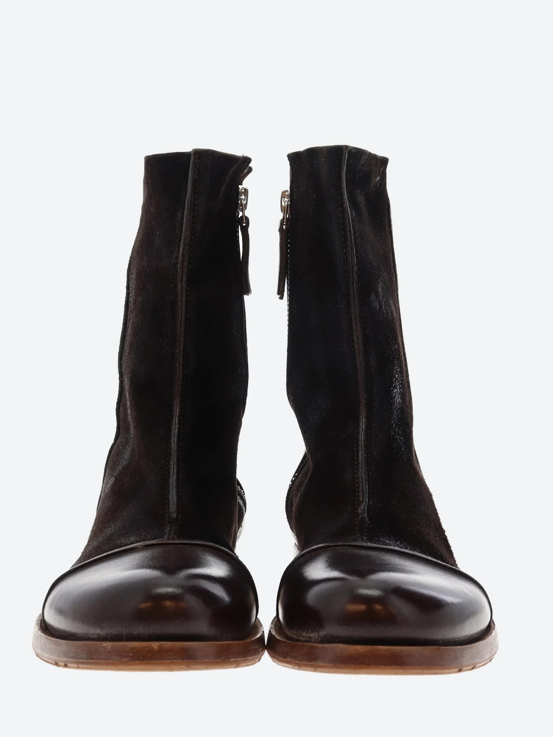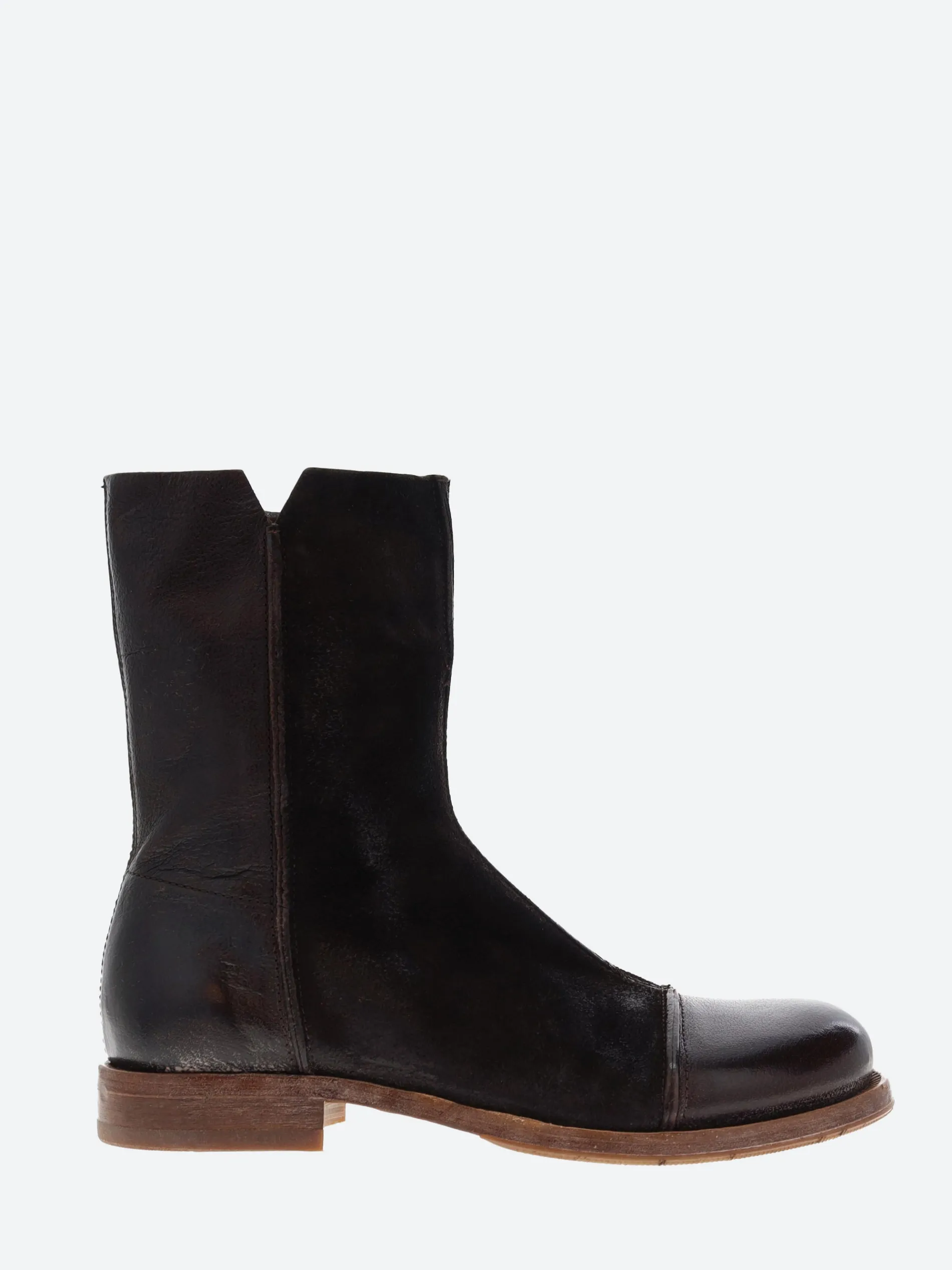 A timeless pull-on leather boot with exposed inner zip closure, set on a slight heel.