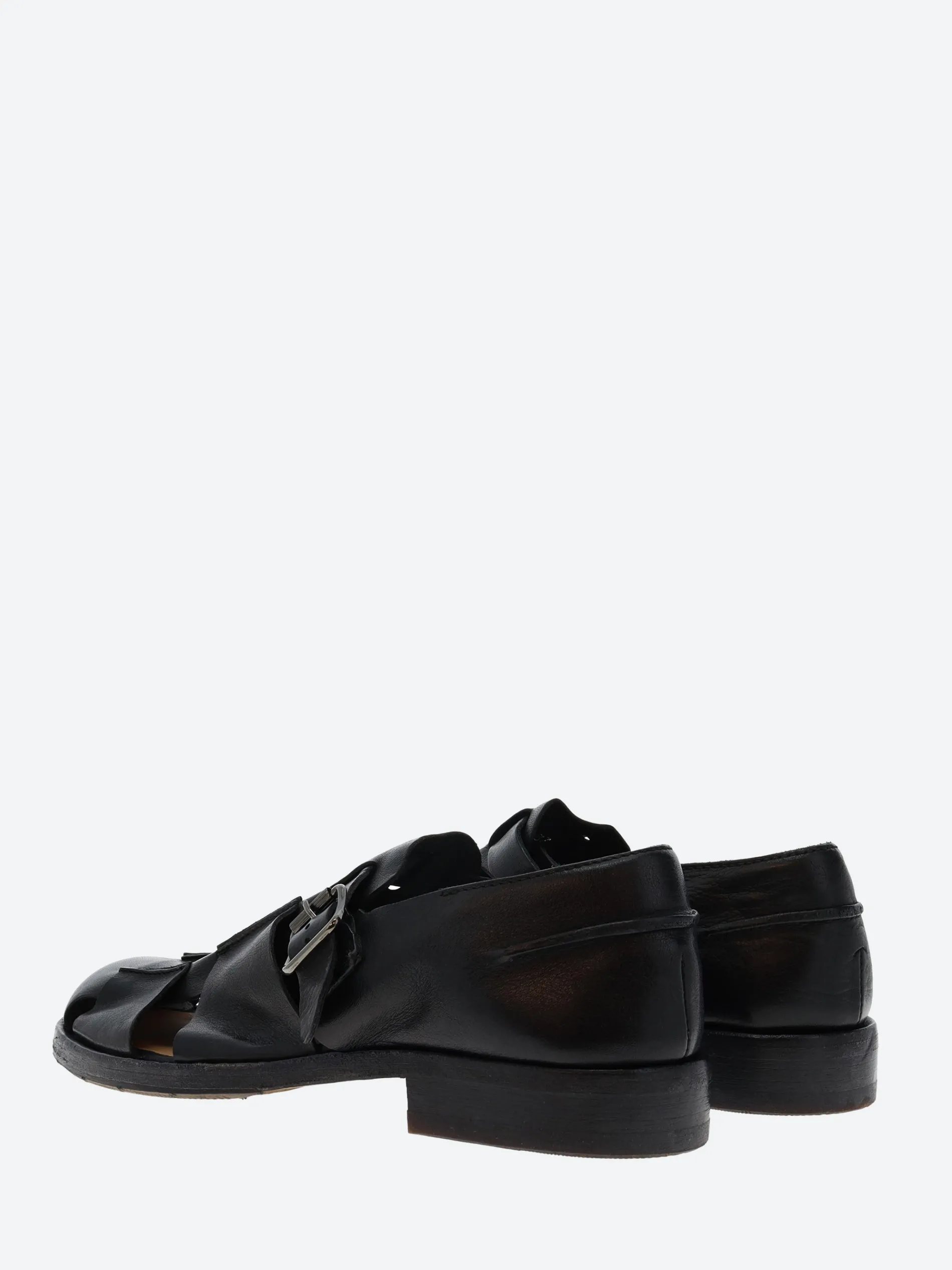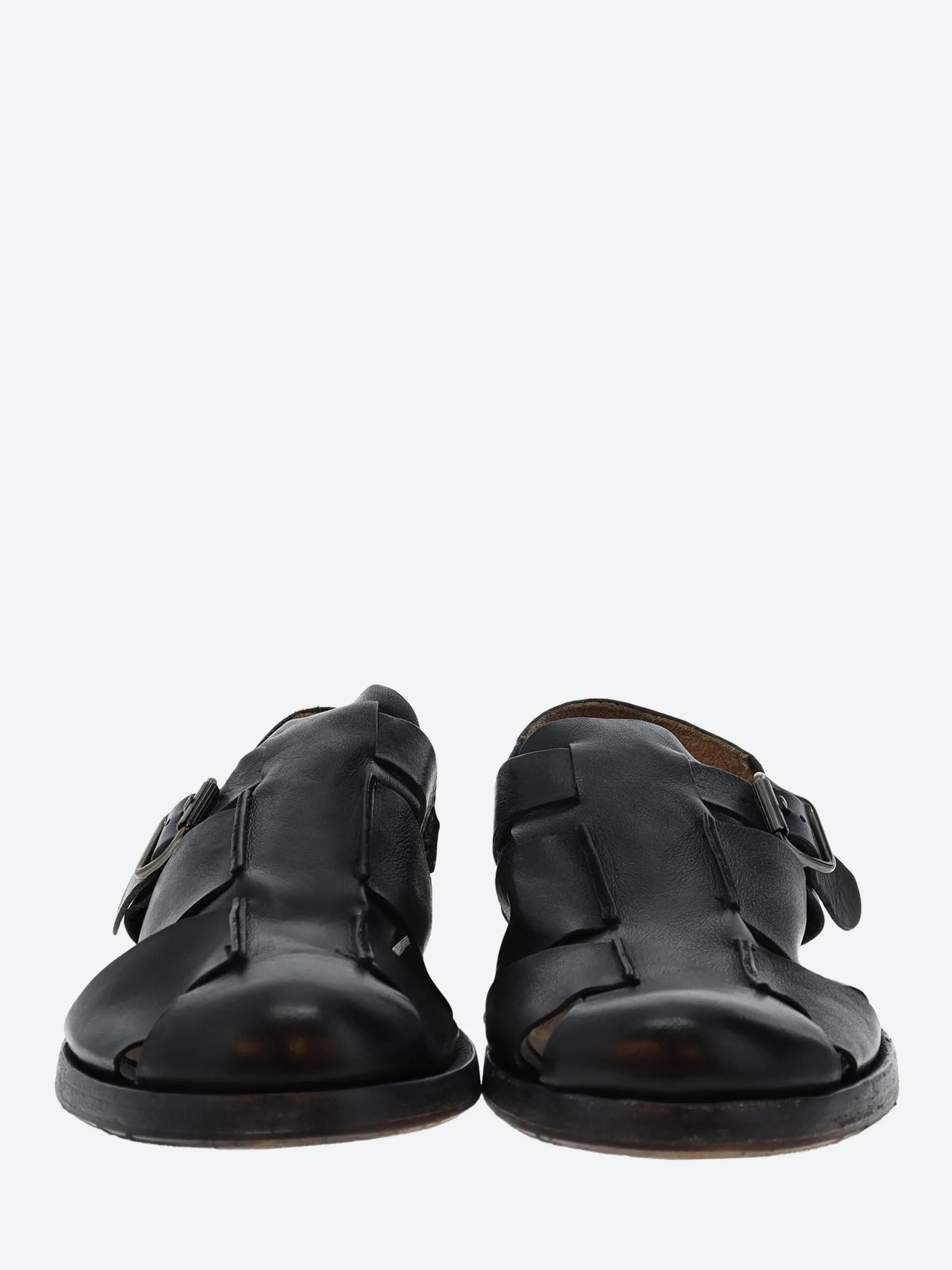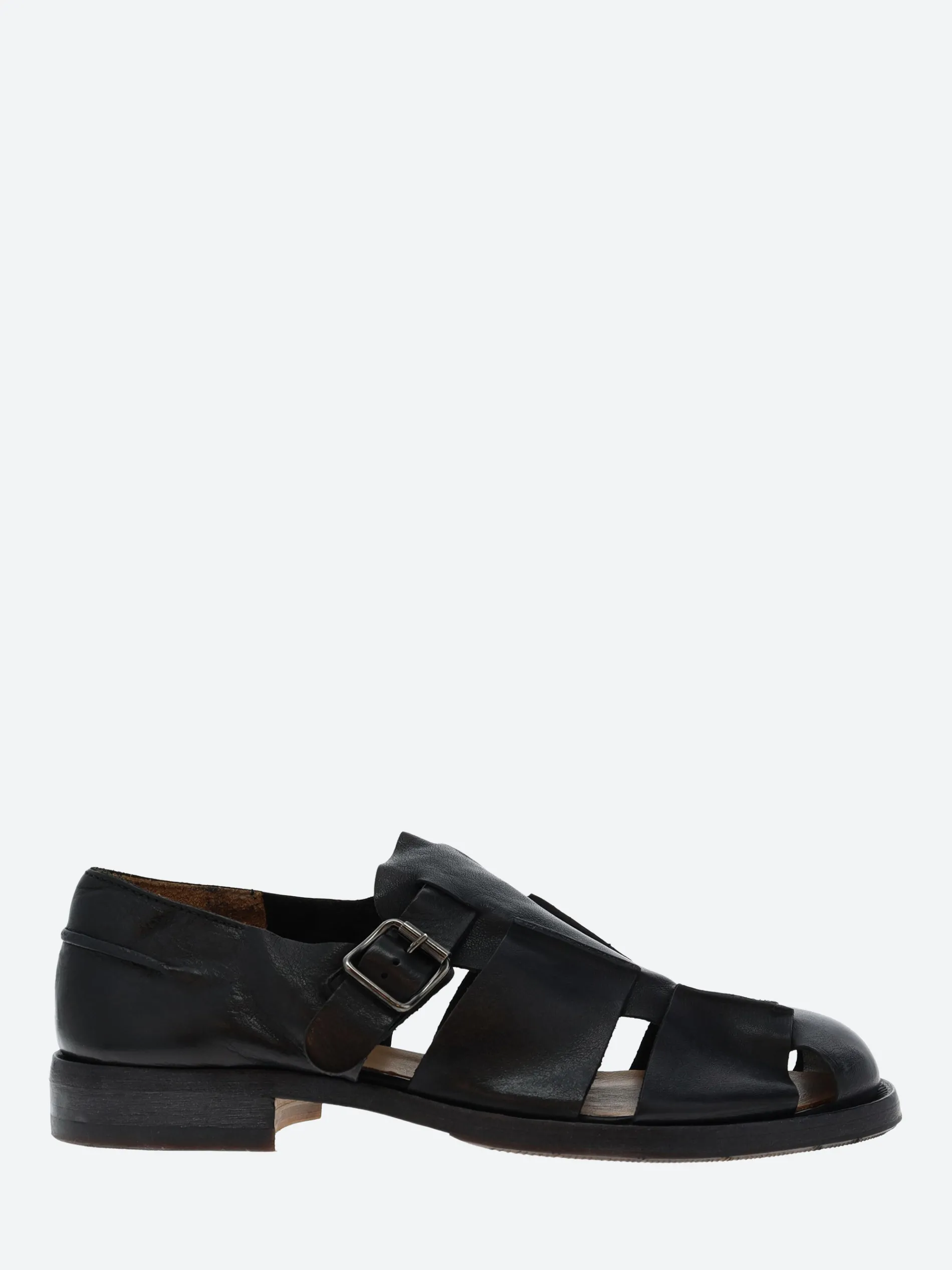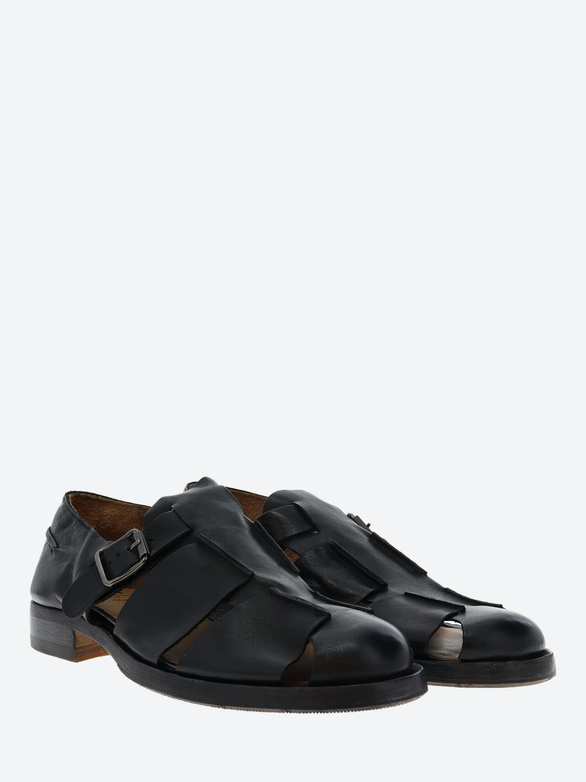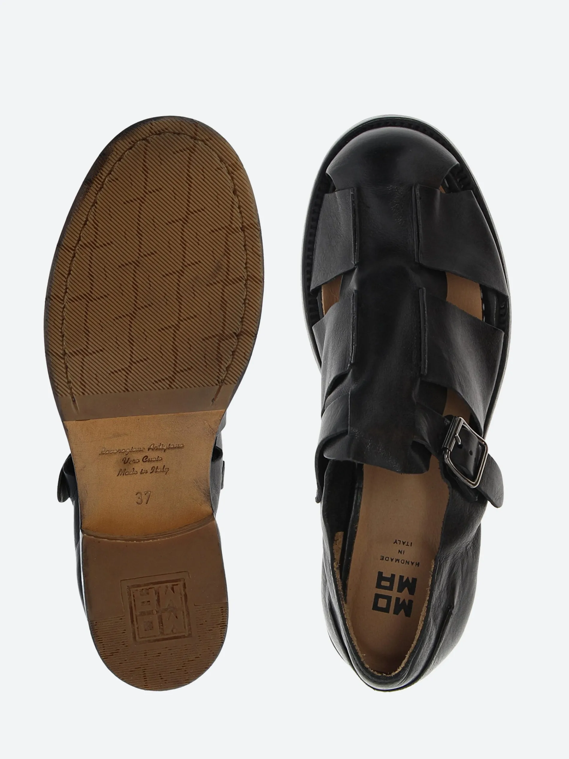 Women’s sandal in vintage effect leather. Made with a round toe, and a leather sole with non-slip rubber insert.