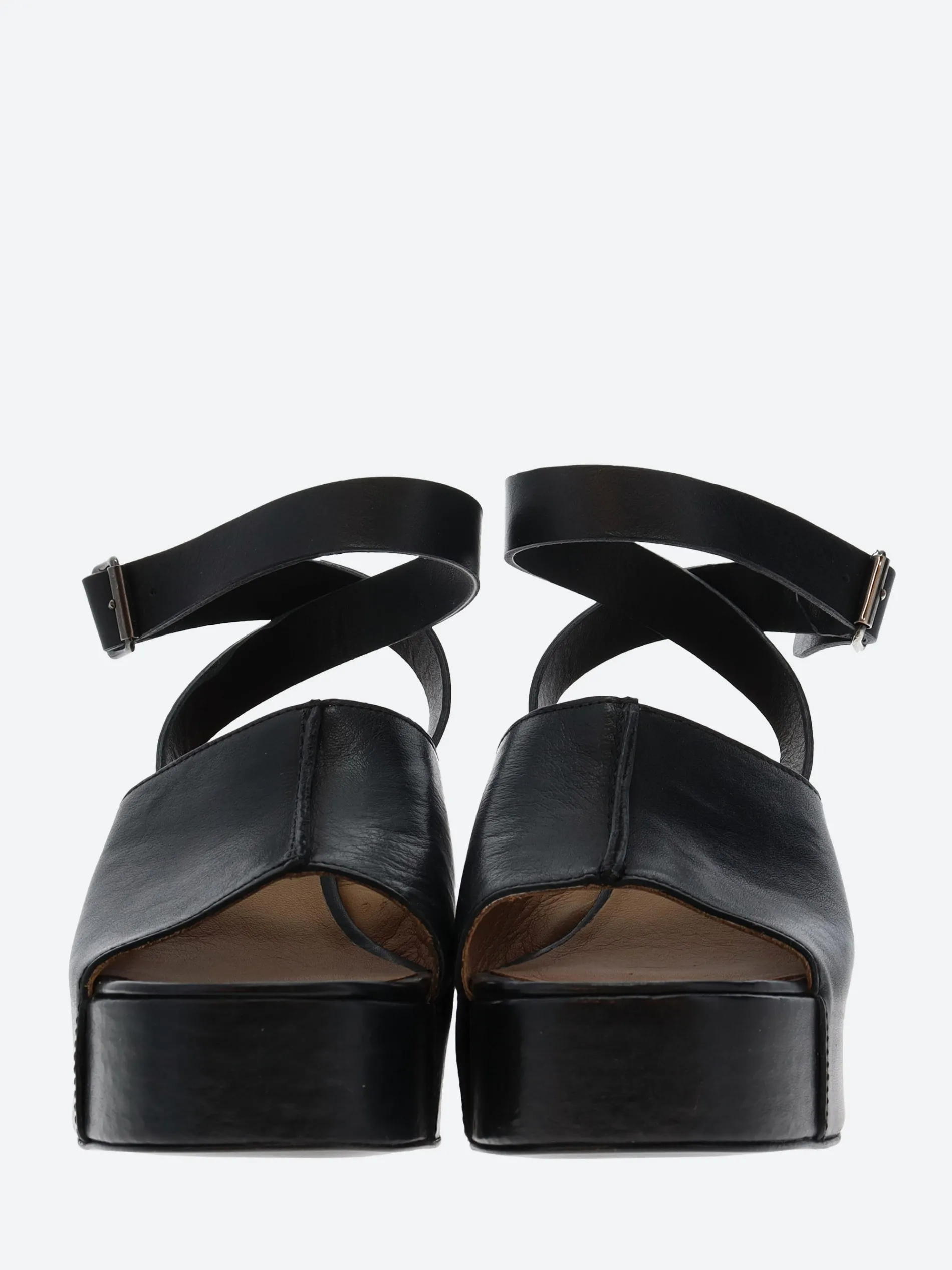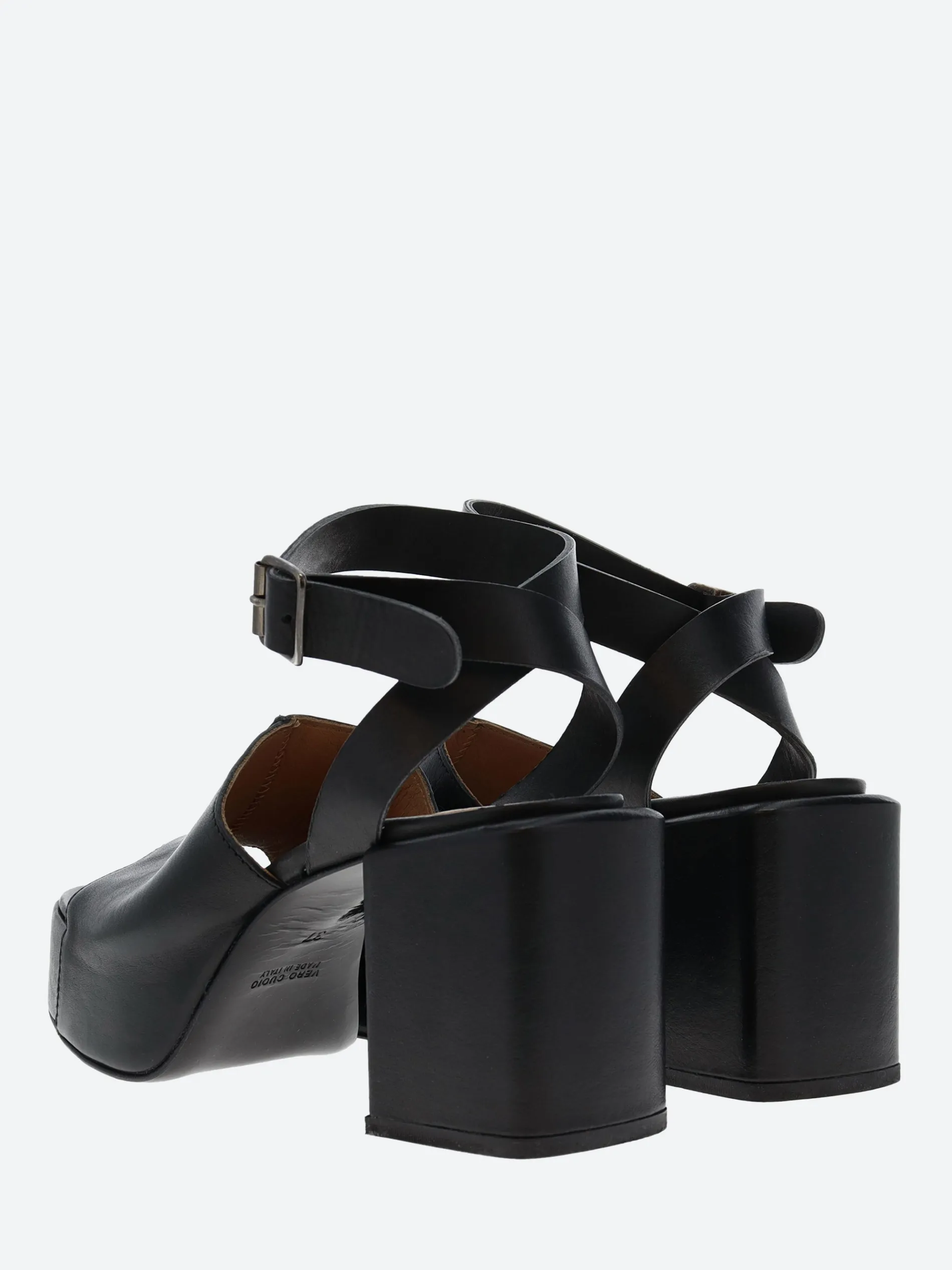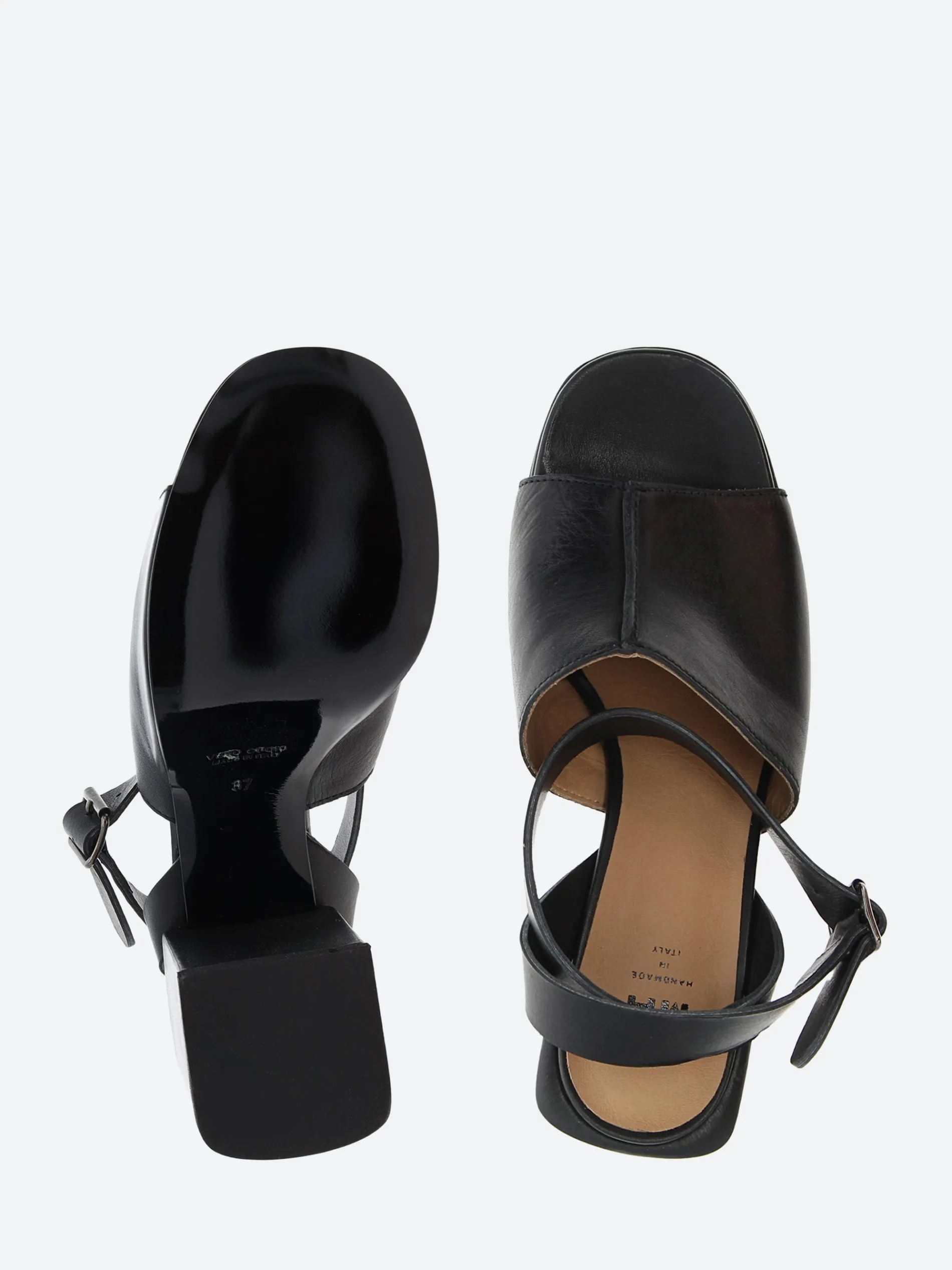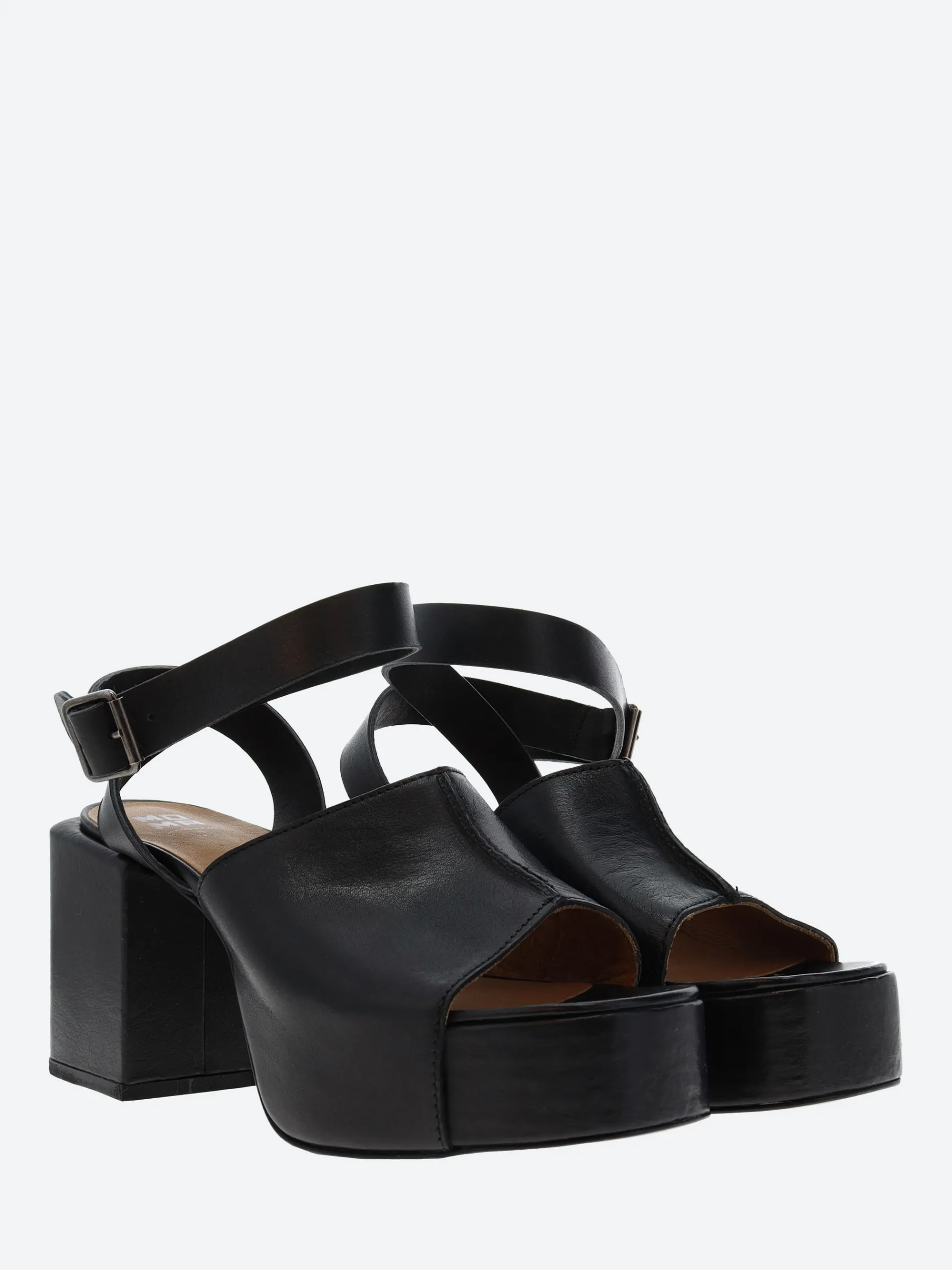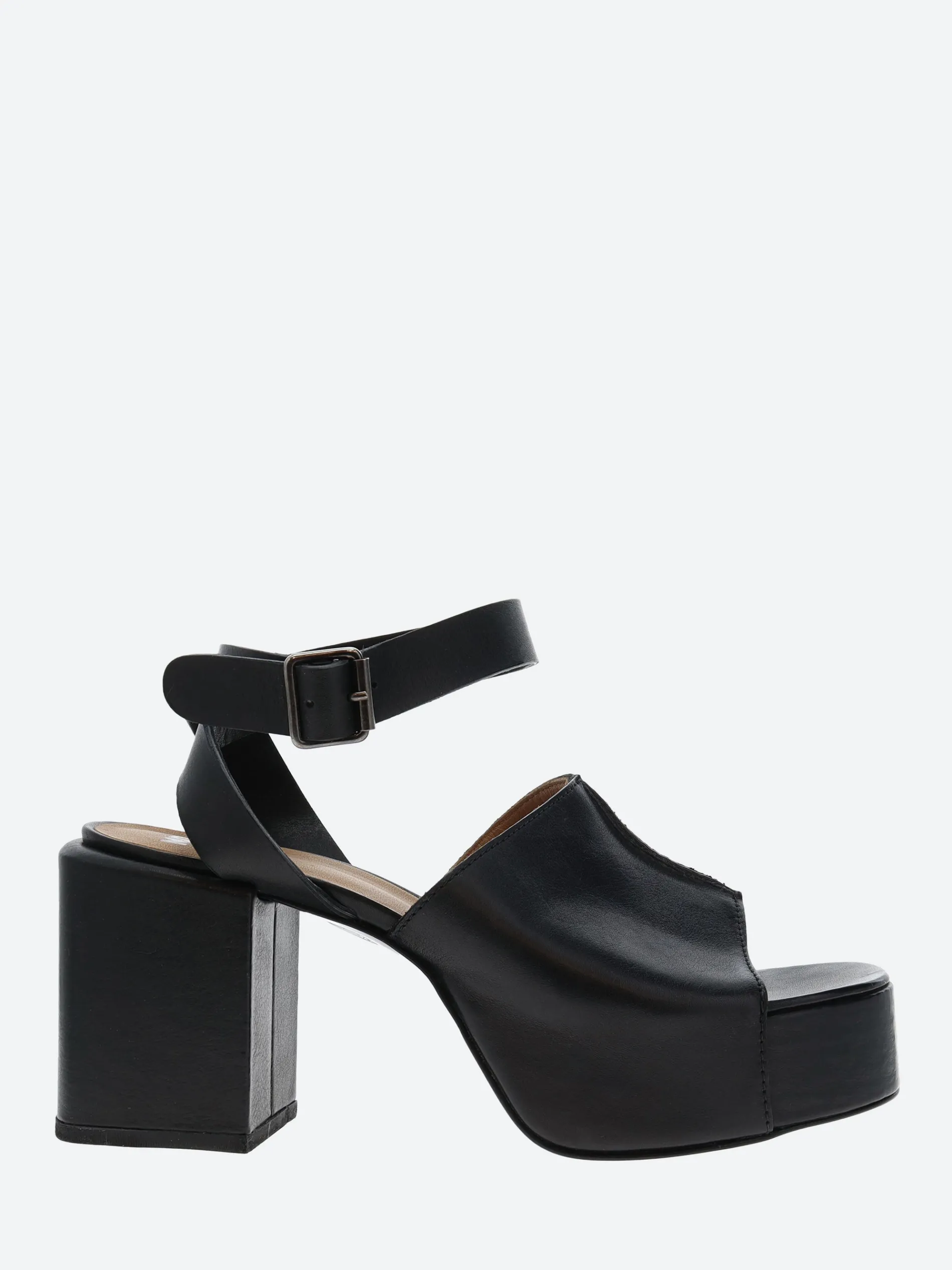 Moma simple sandal with an adjustable buckled ankle strap. Complete with a stacked heel and pebbled finish.