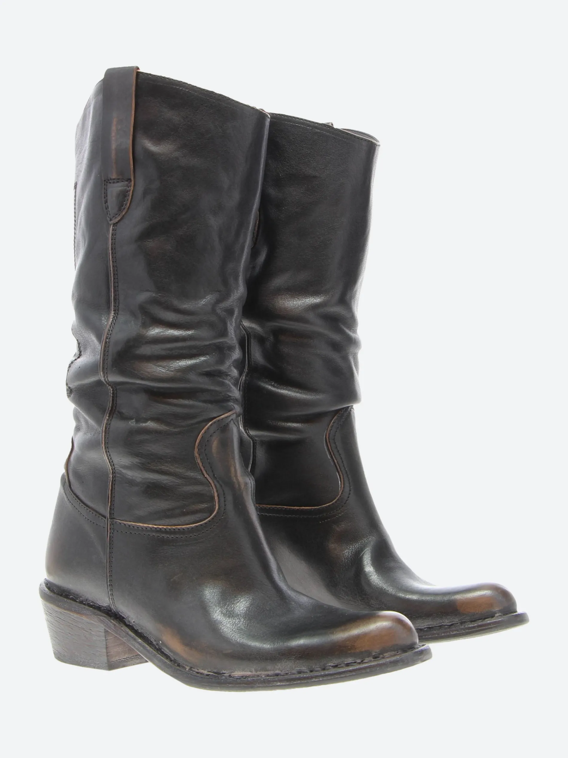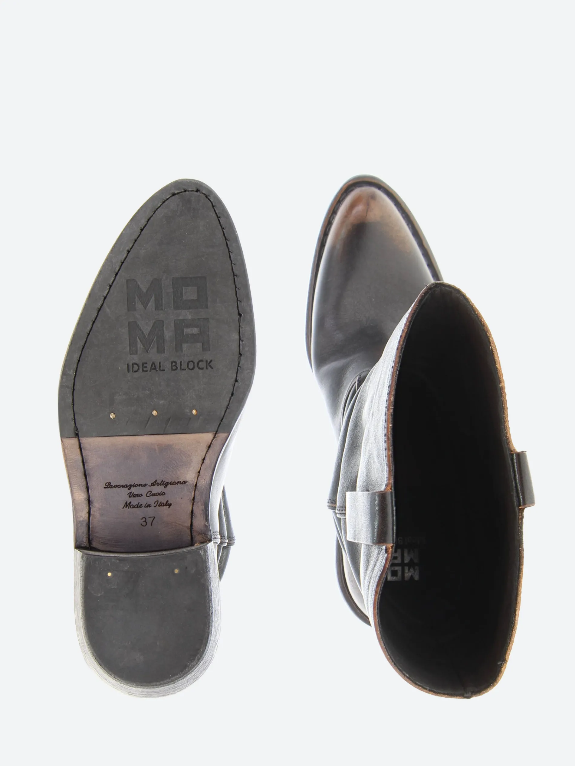 Vintage-inspired leather boots by MOMA featuring an almond toe and leather sole with non-slip rubber insert.