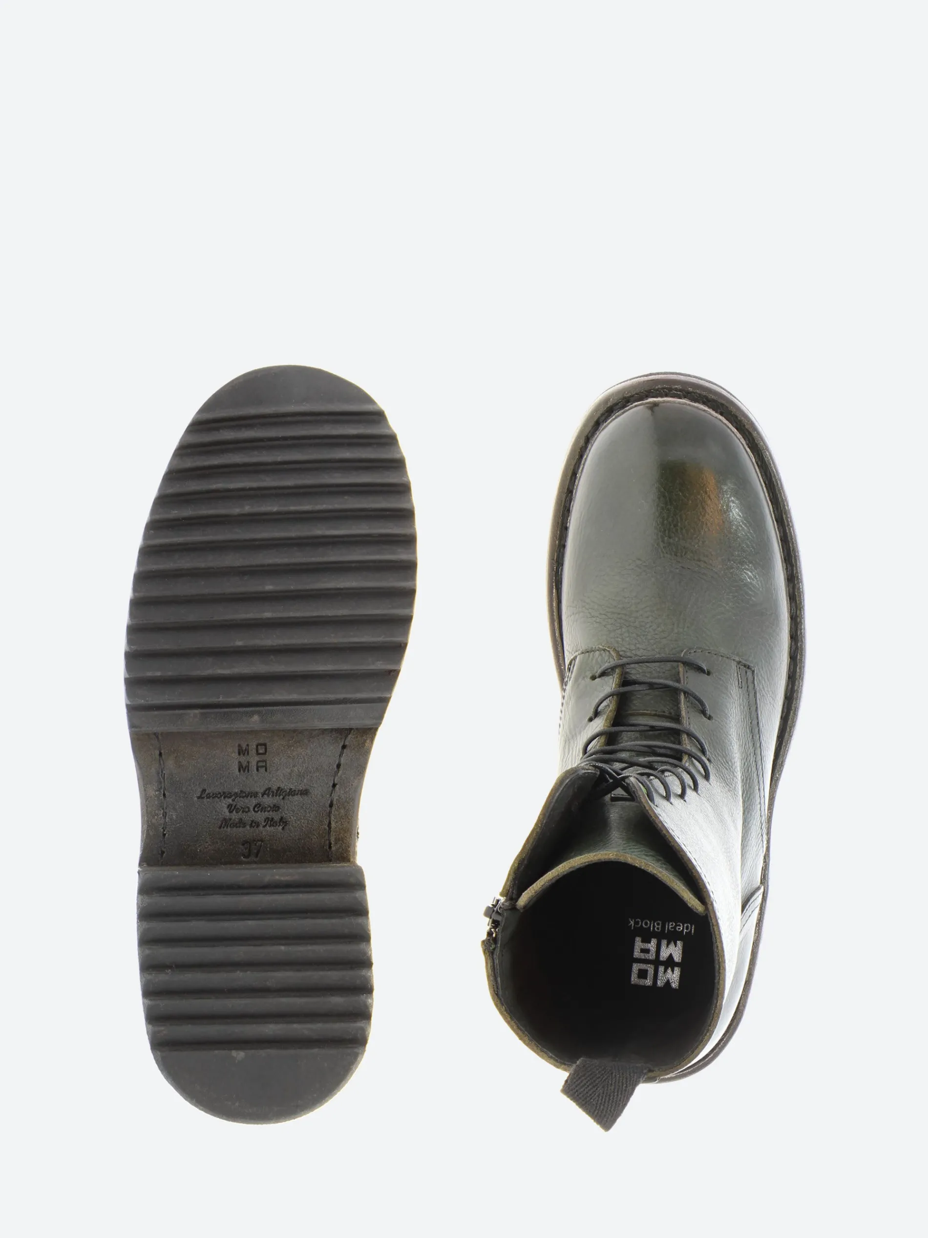 These combat boots are made using a green vintage-effect leather, finished with a toothed rubber outsole.