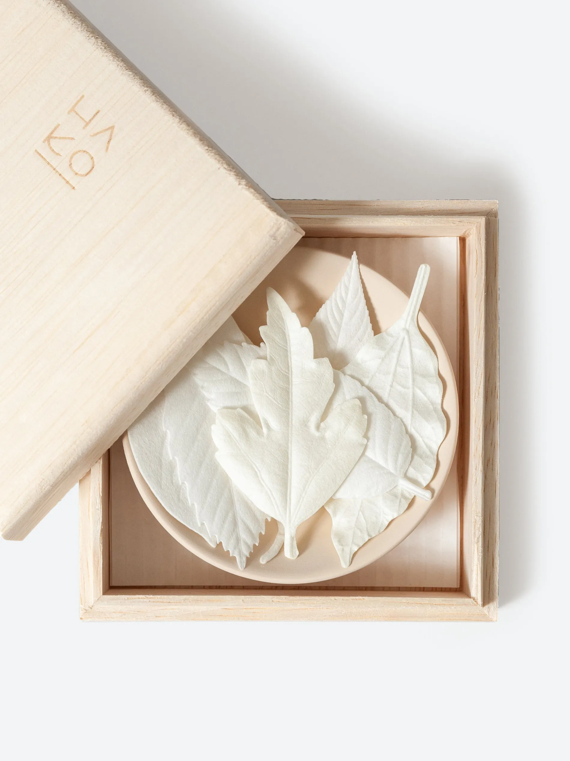 This special wooden box set comes with six individual leaves of HA KO Paper Incense and includes a felt mat and burning dish so you can enjoy them right away. Each leaf can be used as subtle potpourri, giving off fragrance for up to three months, or as incense that burns for approximately seven minutes while cleansing and deodorizing an area.