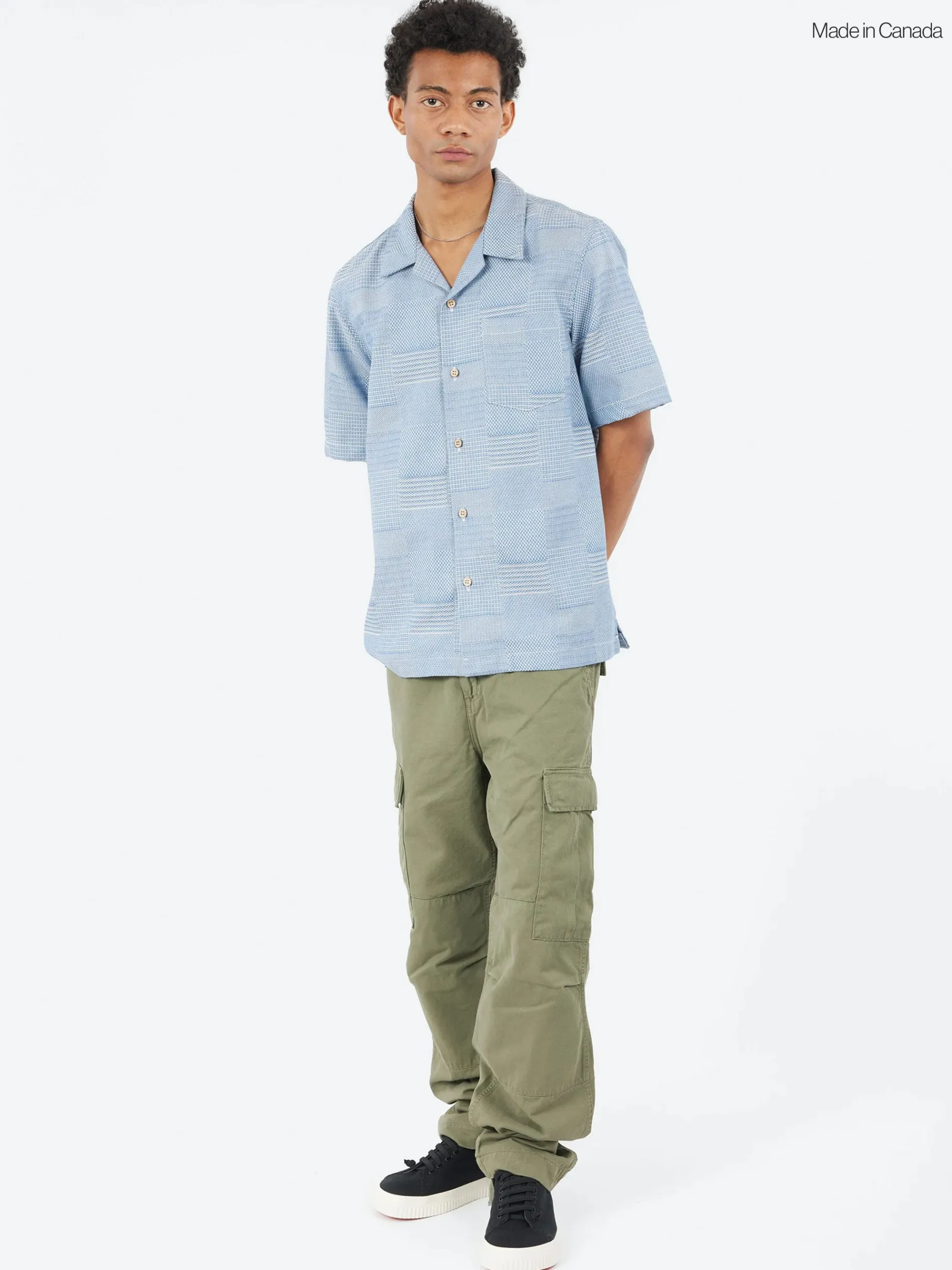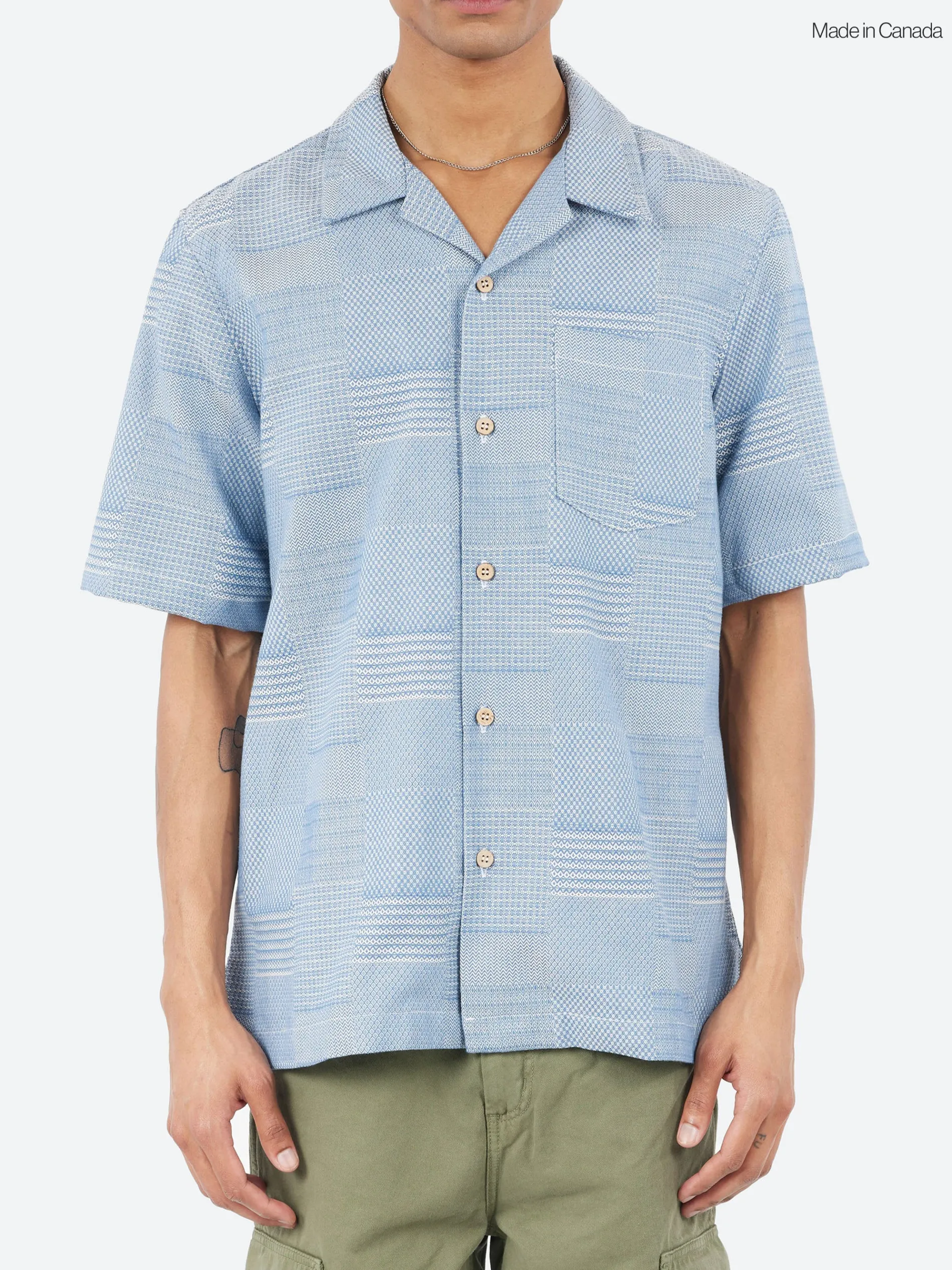 The Aloha Shirt is a short-sleeve shirt with a boxy silhouette, a chest pocket, and a camp collar. The Dobby Patchwork is a midweight Japanese dobby fabric with a few different geometric patterns woven into the fabric in the style of patchwork.