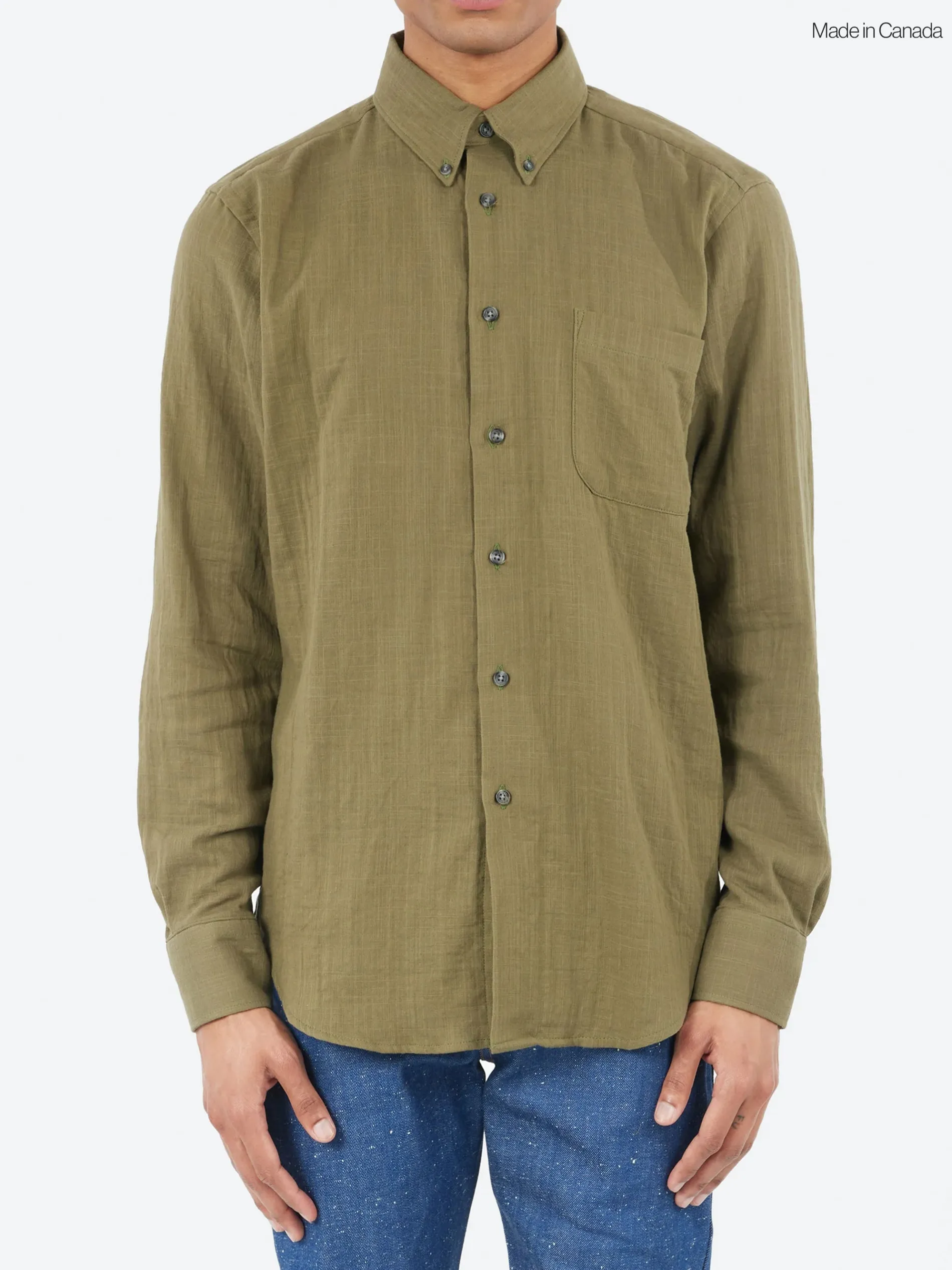 The Easy Shirt is a relaxed-fit long sleeve shirt with back pleating and a classic button-down collar. The Double Weave Gauze Slub is a double-layer lightweight cotton fabric. The slubby yarns give it texture, and the loose, open weave makes the cloth airy and provides its drape.