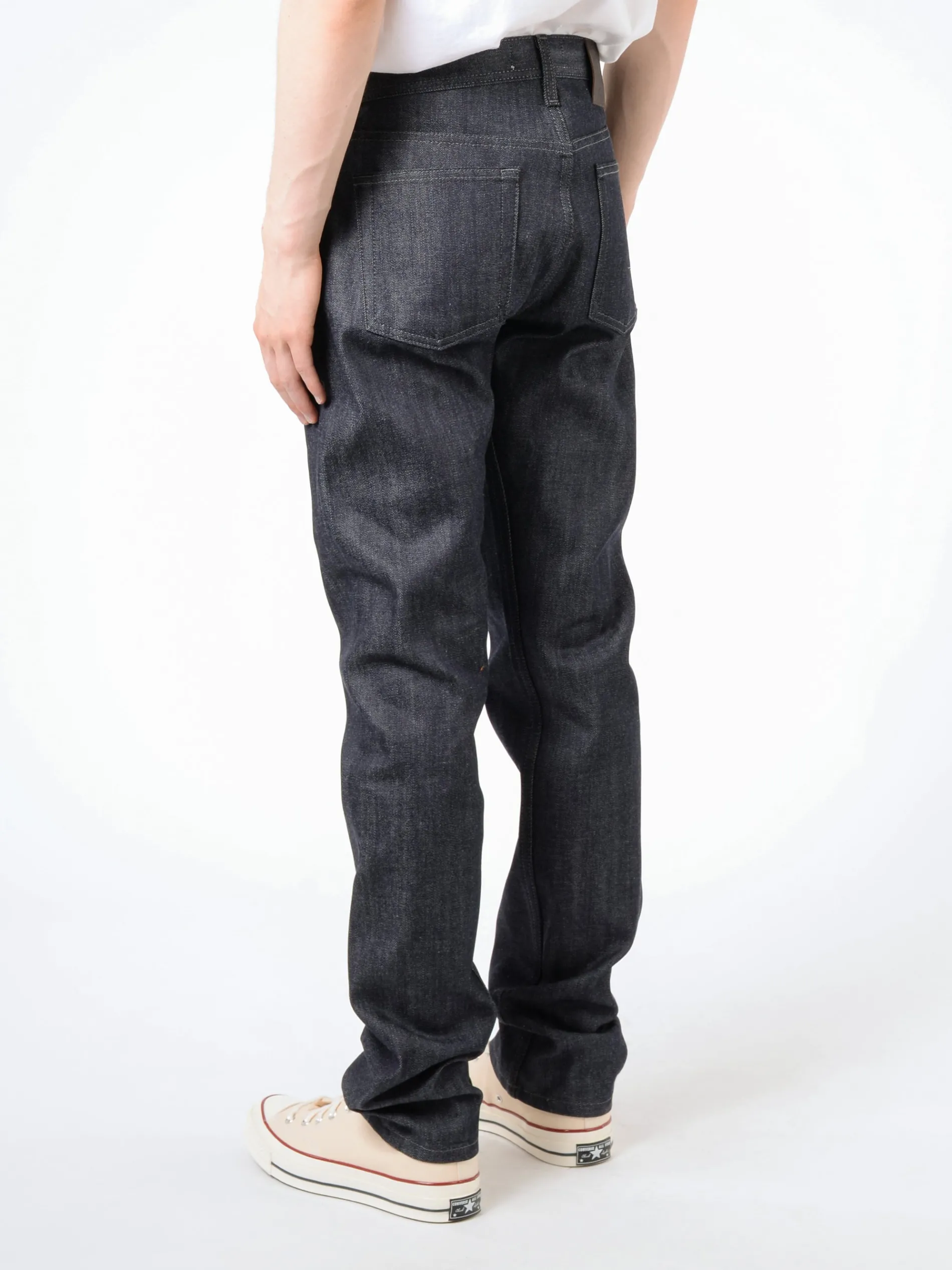 13oz indigo rope dyed Japanese selvedge denim, woven on vintage shuttle looms in a right hand twill construction. The Indigo dyed warp and white weft combined with a red line selvedge ID give these jeans a classic look.