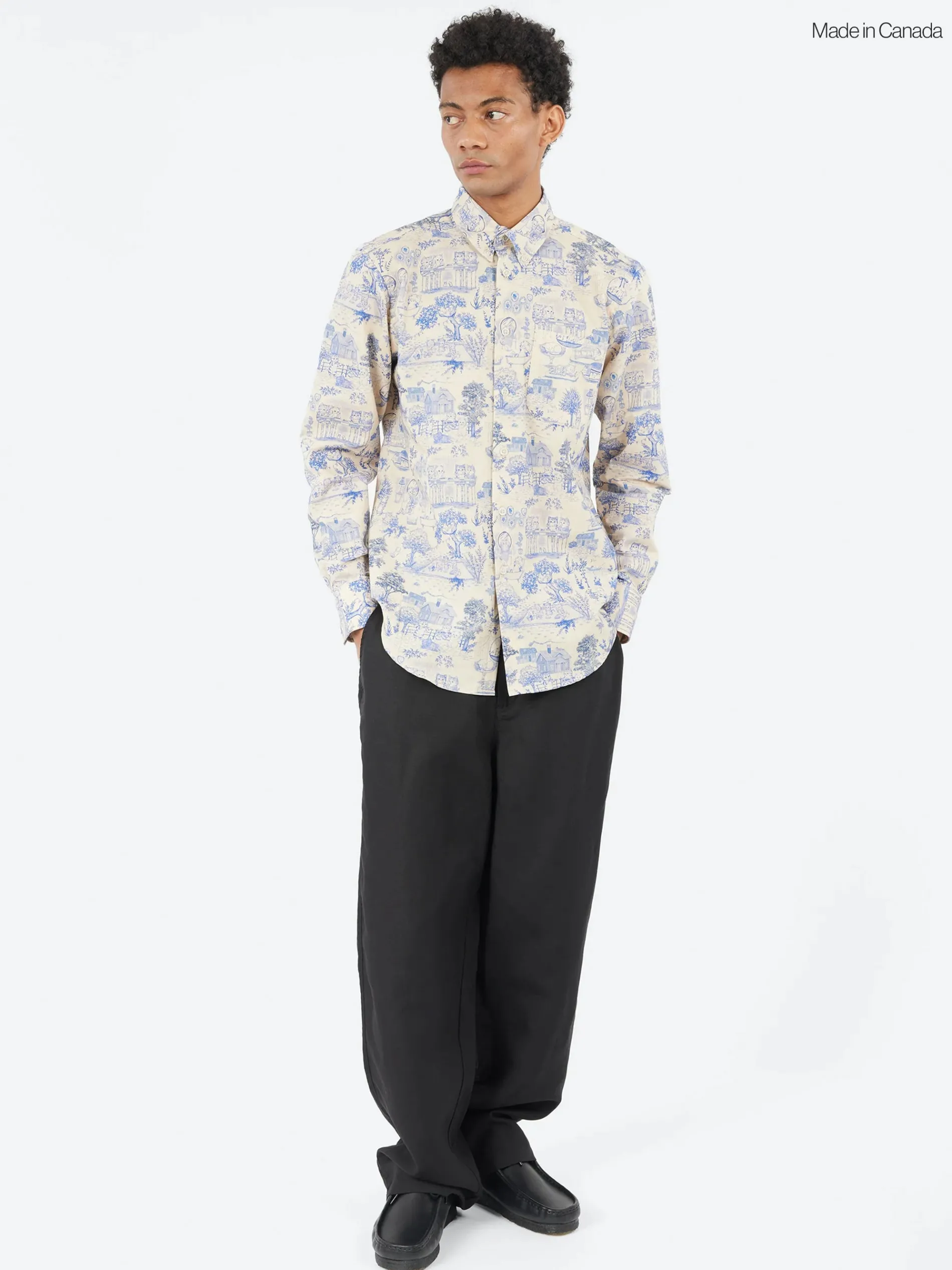 The Easy Shirt is a relaxed-fit long sleeve shirt with back pleating and a classic button-down collar. The Linen Cats is a lightweight Japanese fabric made from 85% cotton and 15% linen, featuring the ‘toile de Jouy” style print of cats in a garden.