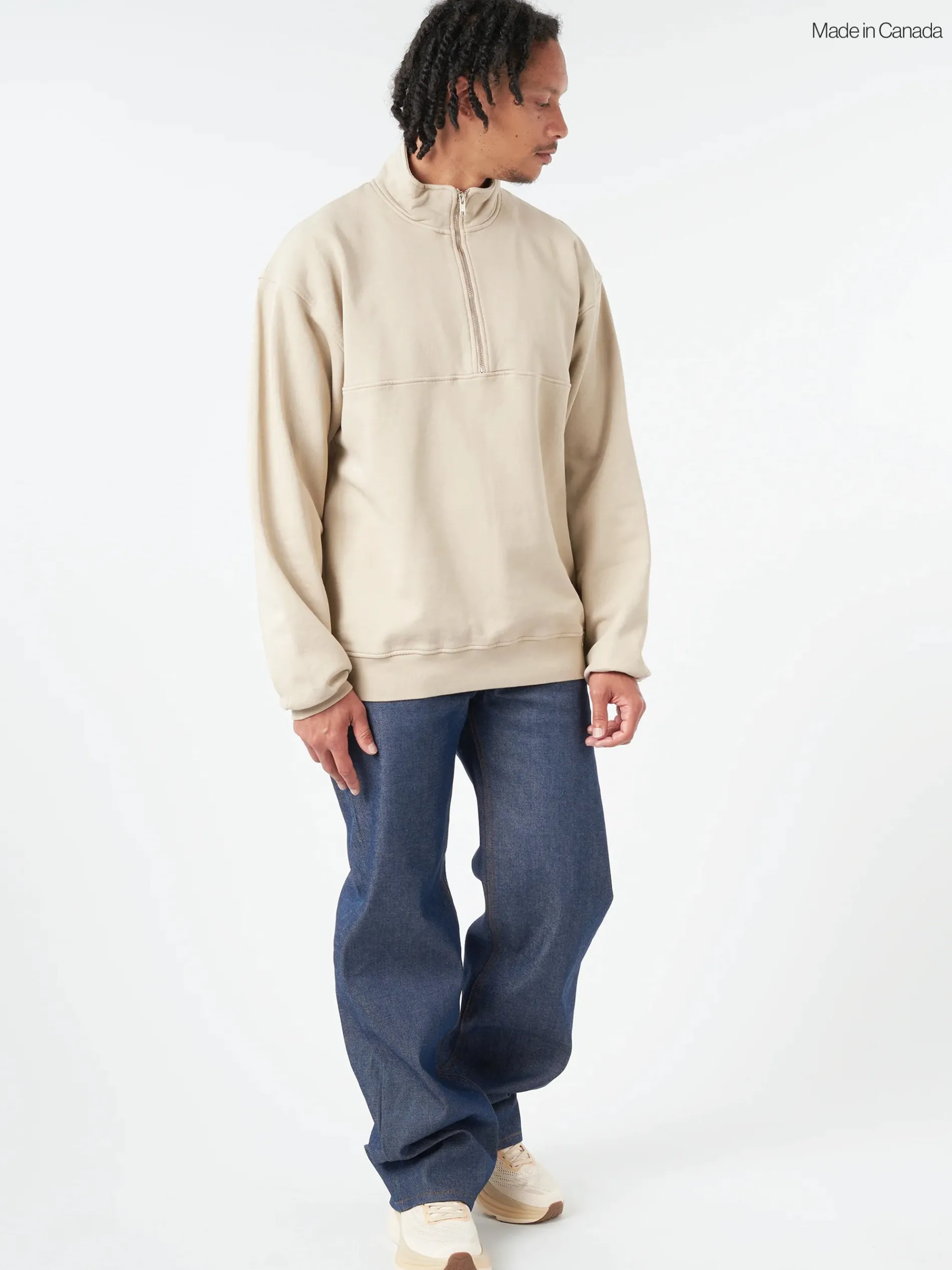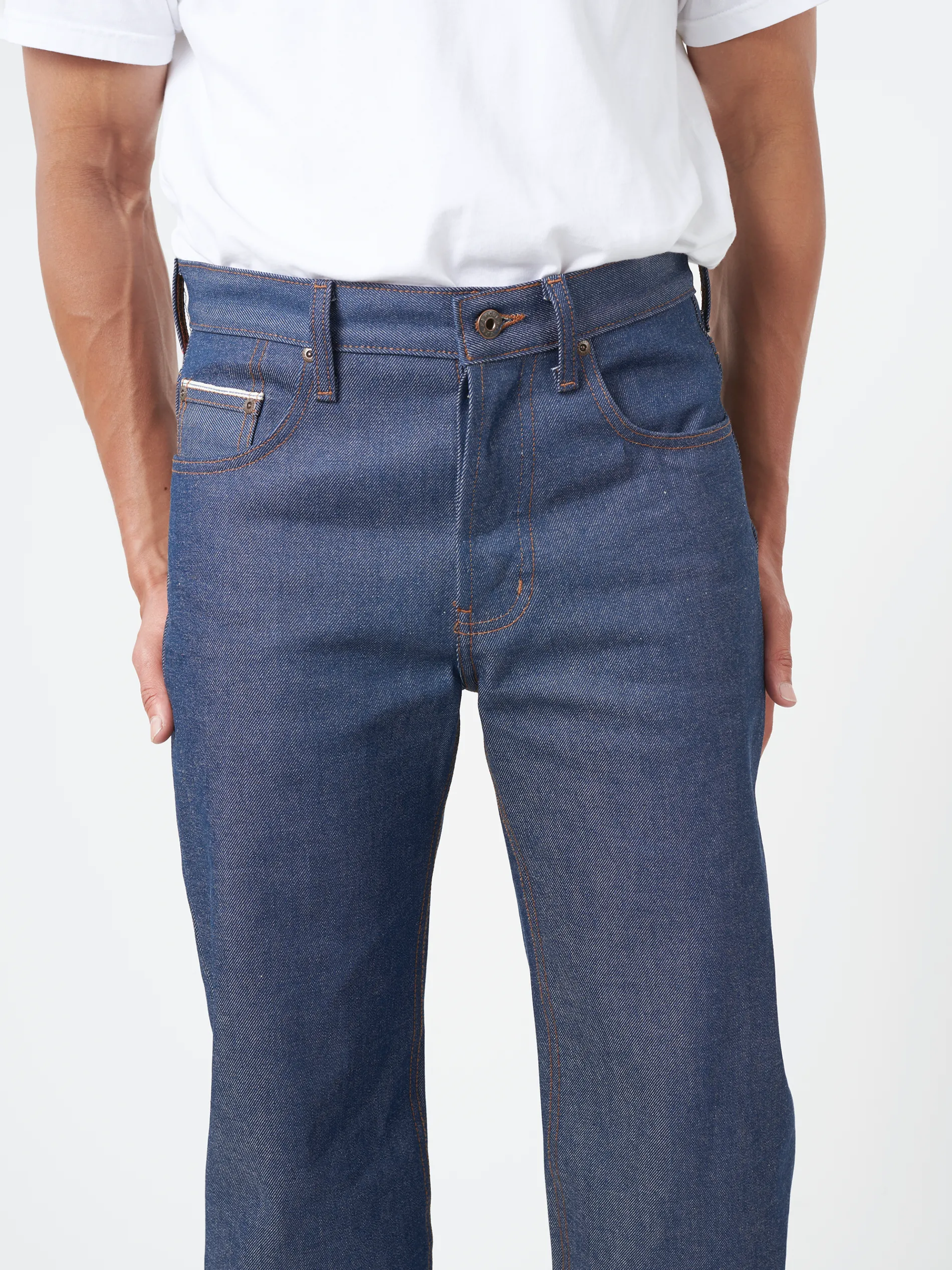The Strong Guy is a relaxed straight fit; high rise, fuller in the seat and thigh that falls to a wide leg opening. The Natural Indigo Selvedge is a 12.5oz indigo rope dyed Japanese selvedge denim, woven on vintage shuttle looms in a right hand twill construction.