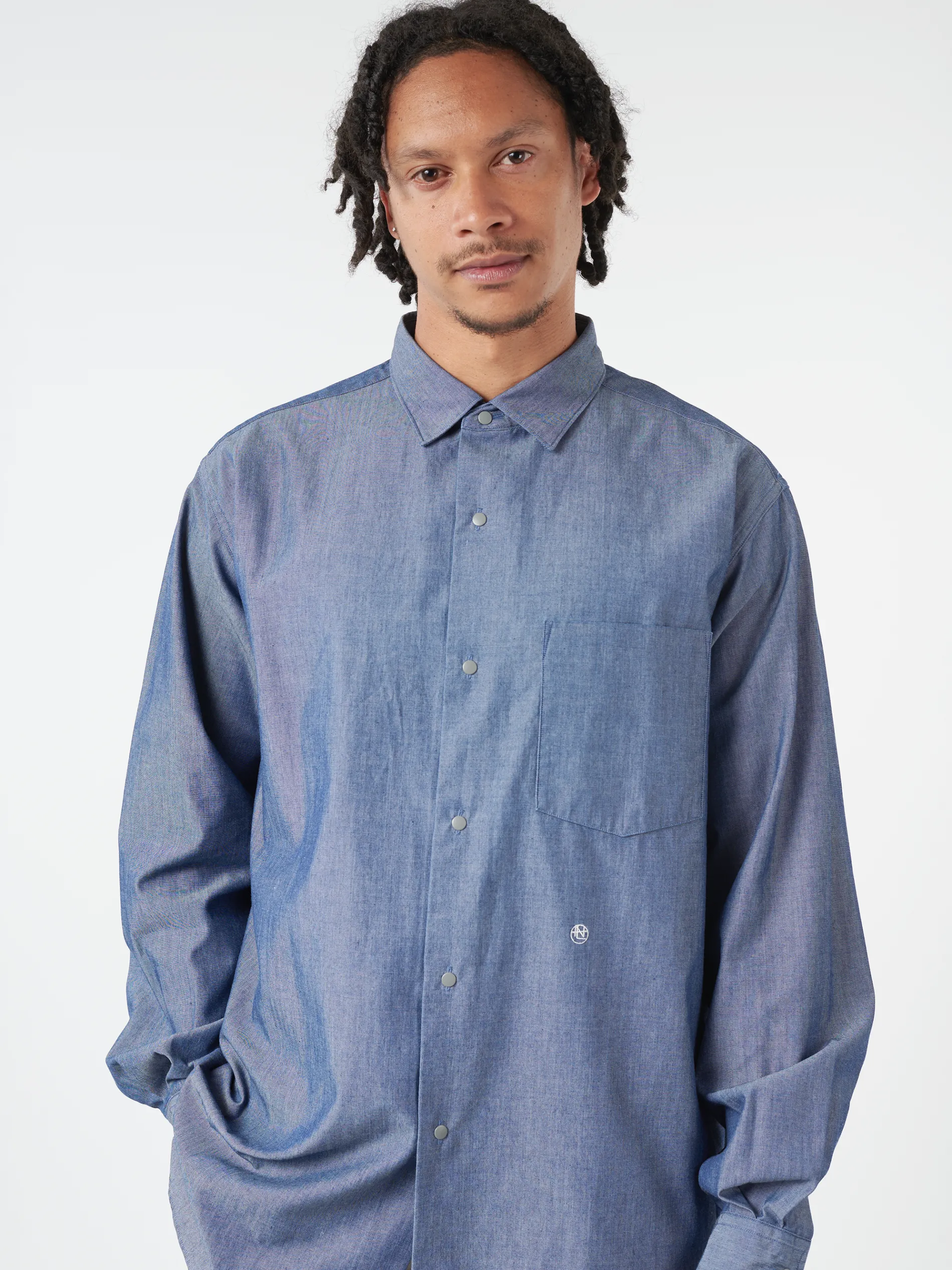 Nanamica regular collar shirt made from chambray material. Made from an original hybrid material with the texture of cotton and the added functionality of being lightweight, durable, and fast drying.