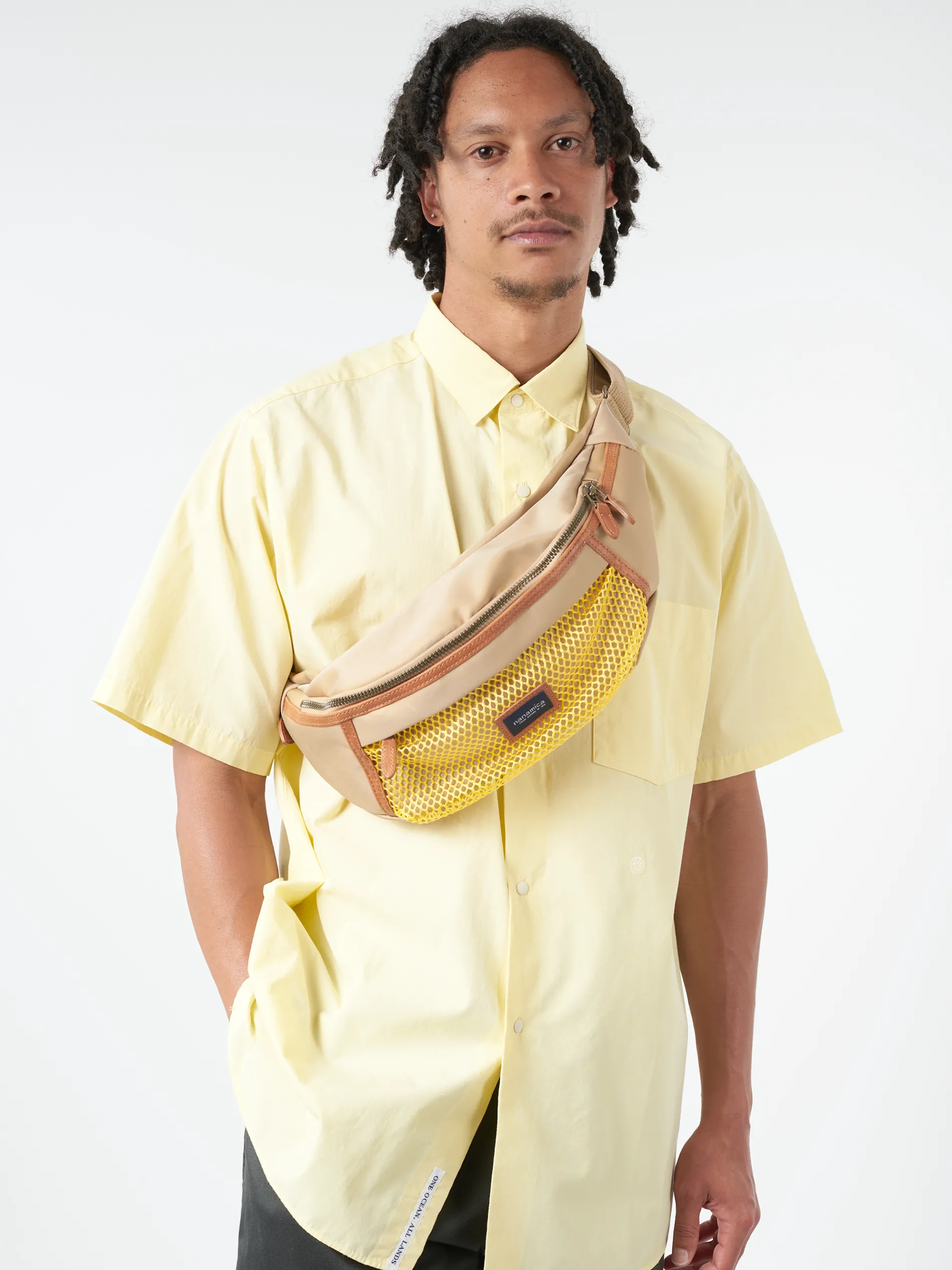 A belt bag that incorporates the design of a hunting game bag. Made of a durable water-repellent cotton twill material, bonded with a waterproof breathable film and nylon, creating an original three-layer fabric.