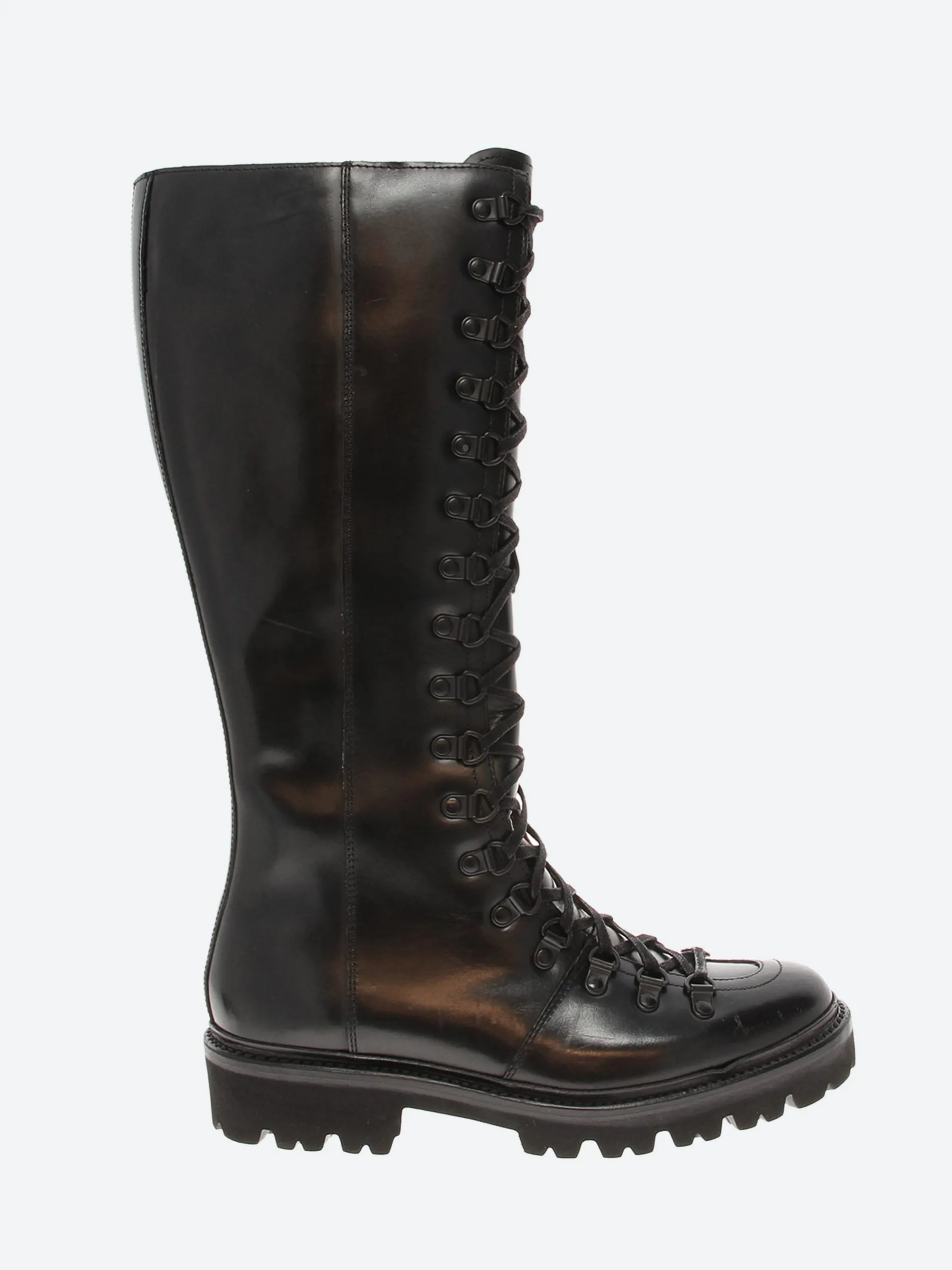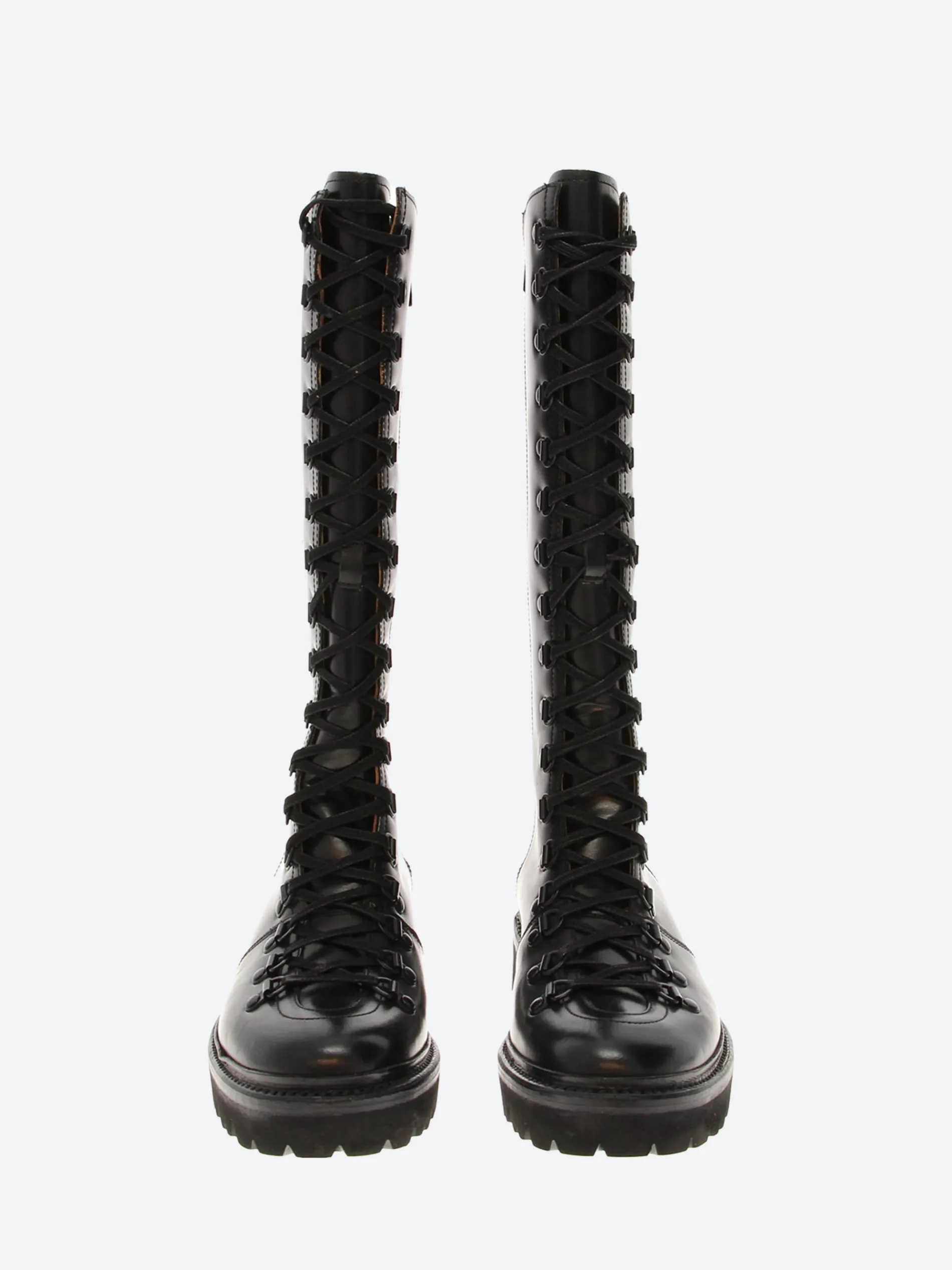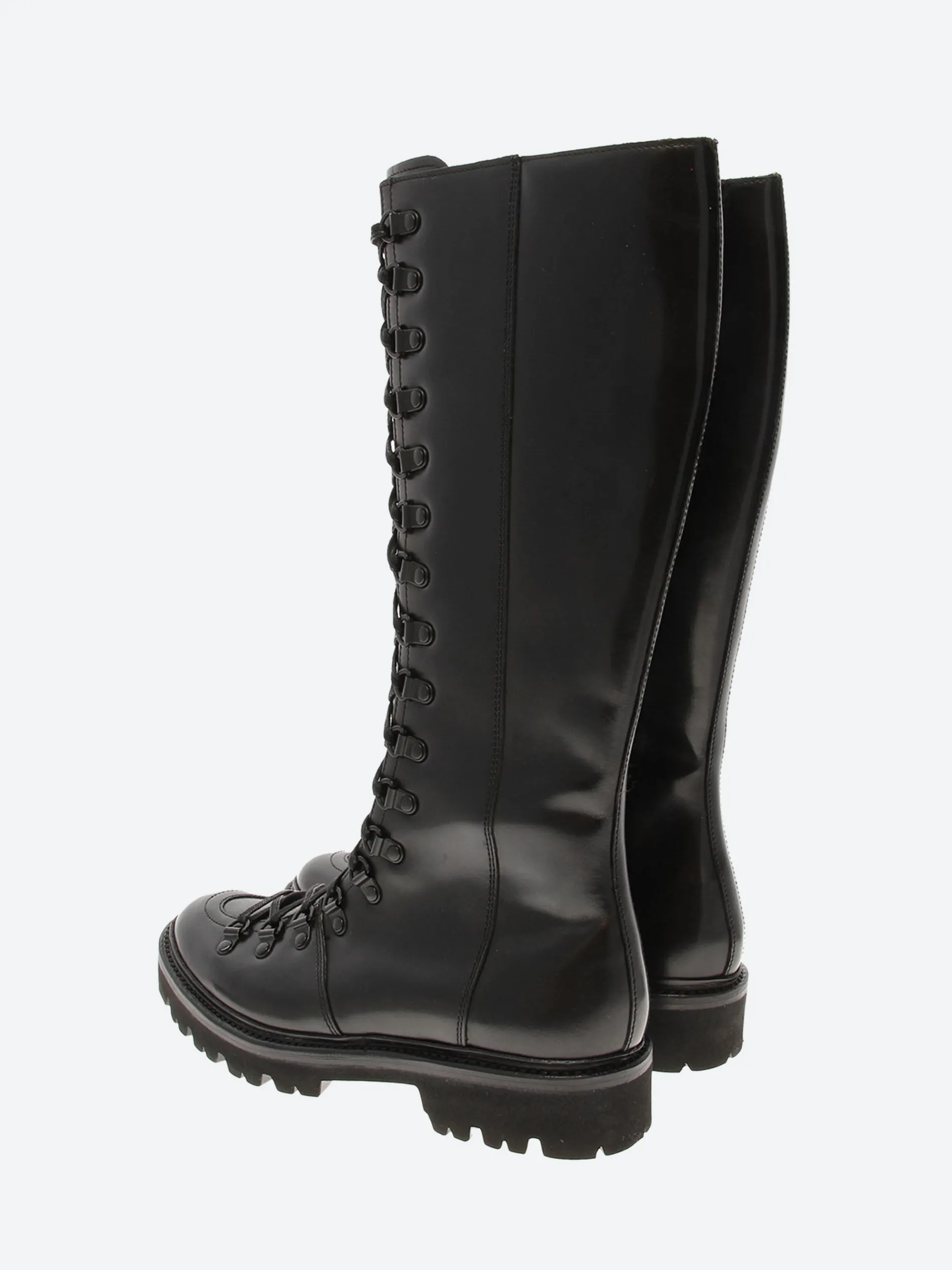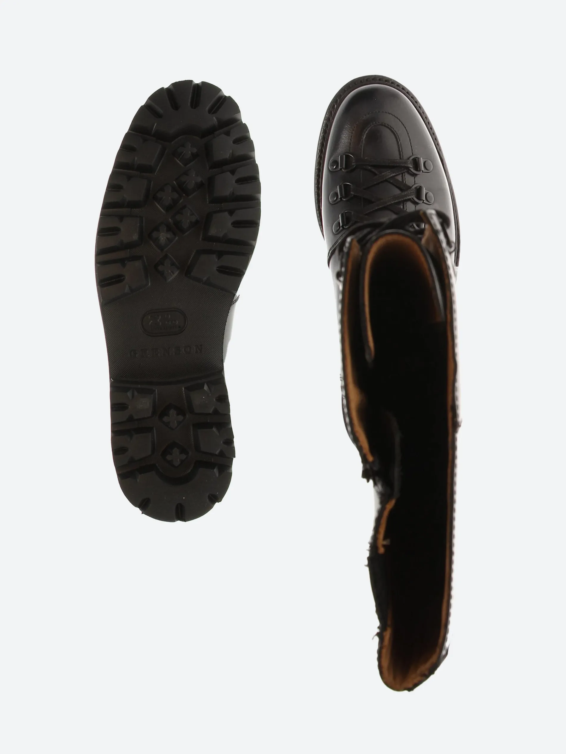 The Grenson Nanette Hi in all over black colorado leather the look is completed with tonal dark eyelets and zip, traditional cross over lacing and a lightweight but chunky commando sole. With an inside zip you can customize the lacing to fit just about every leg shape.